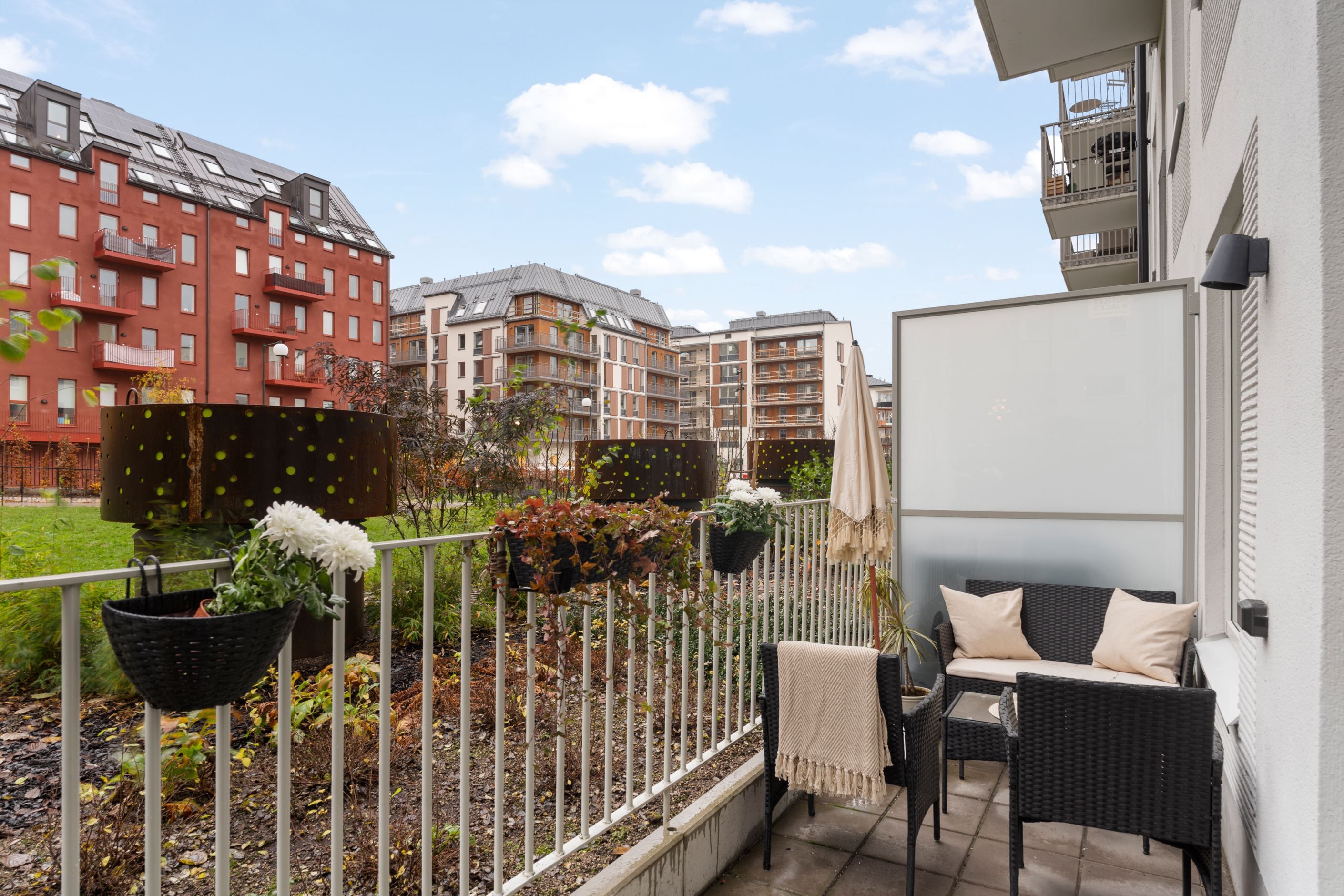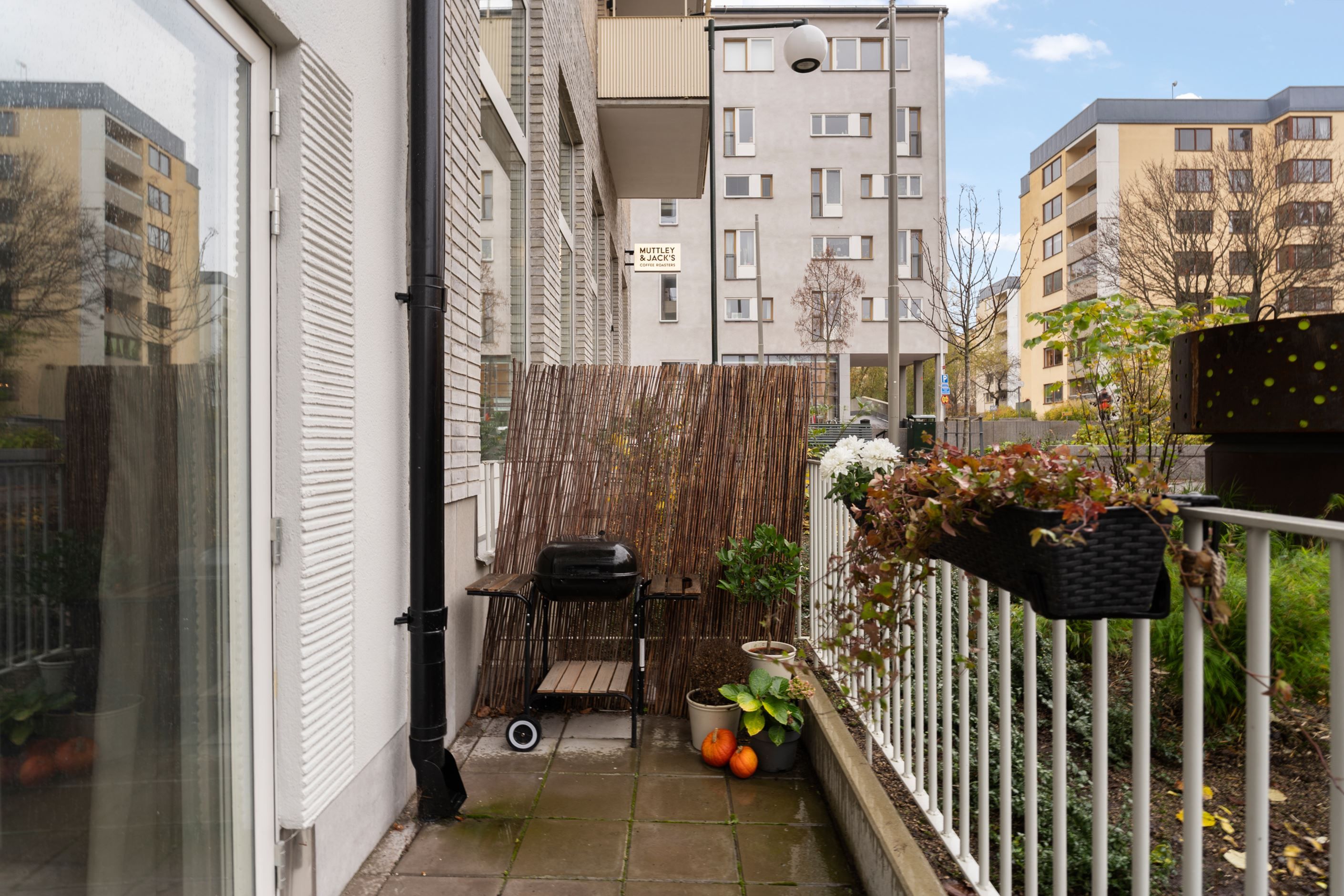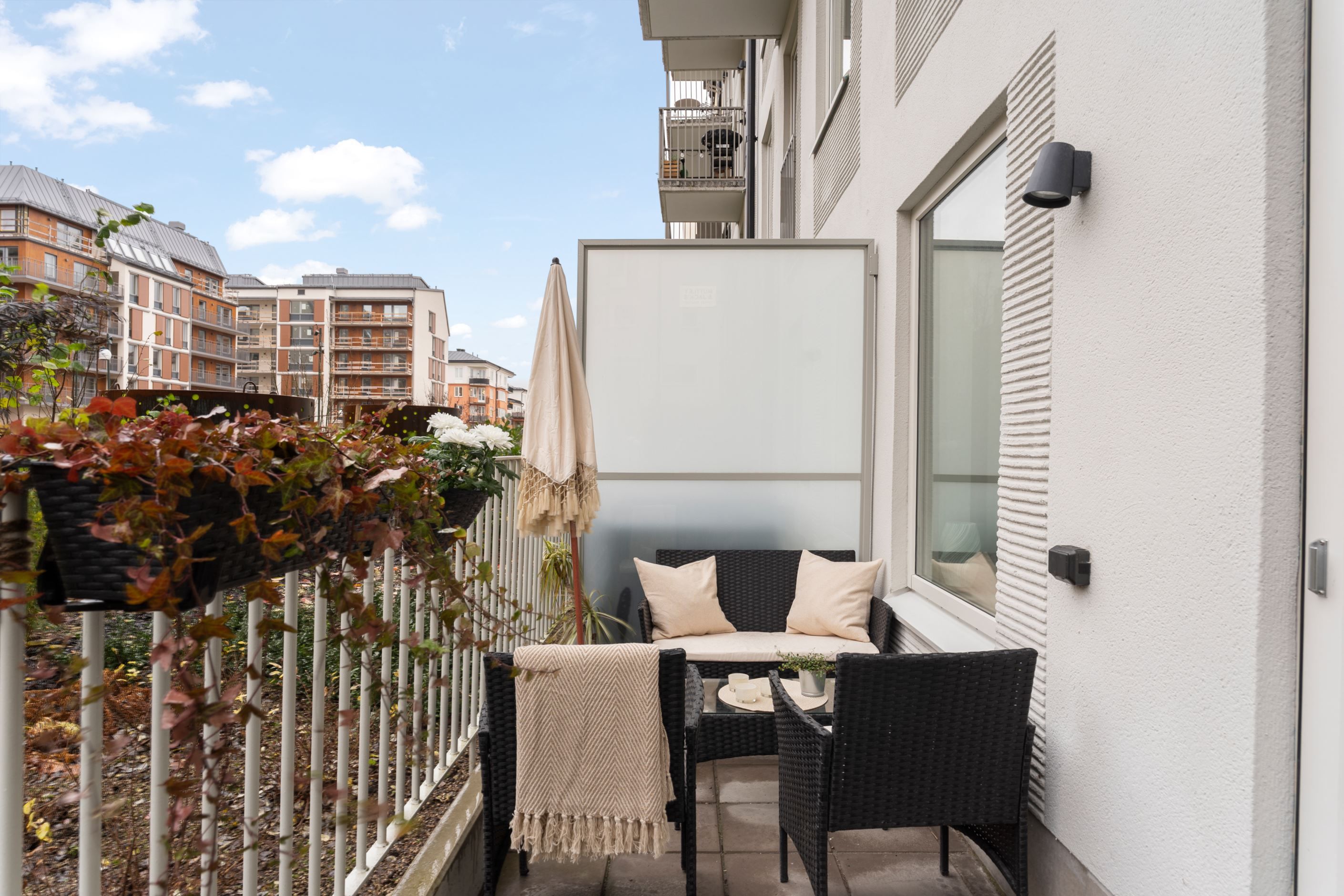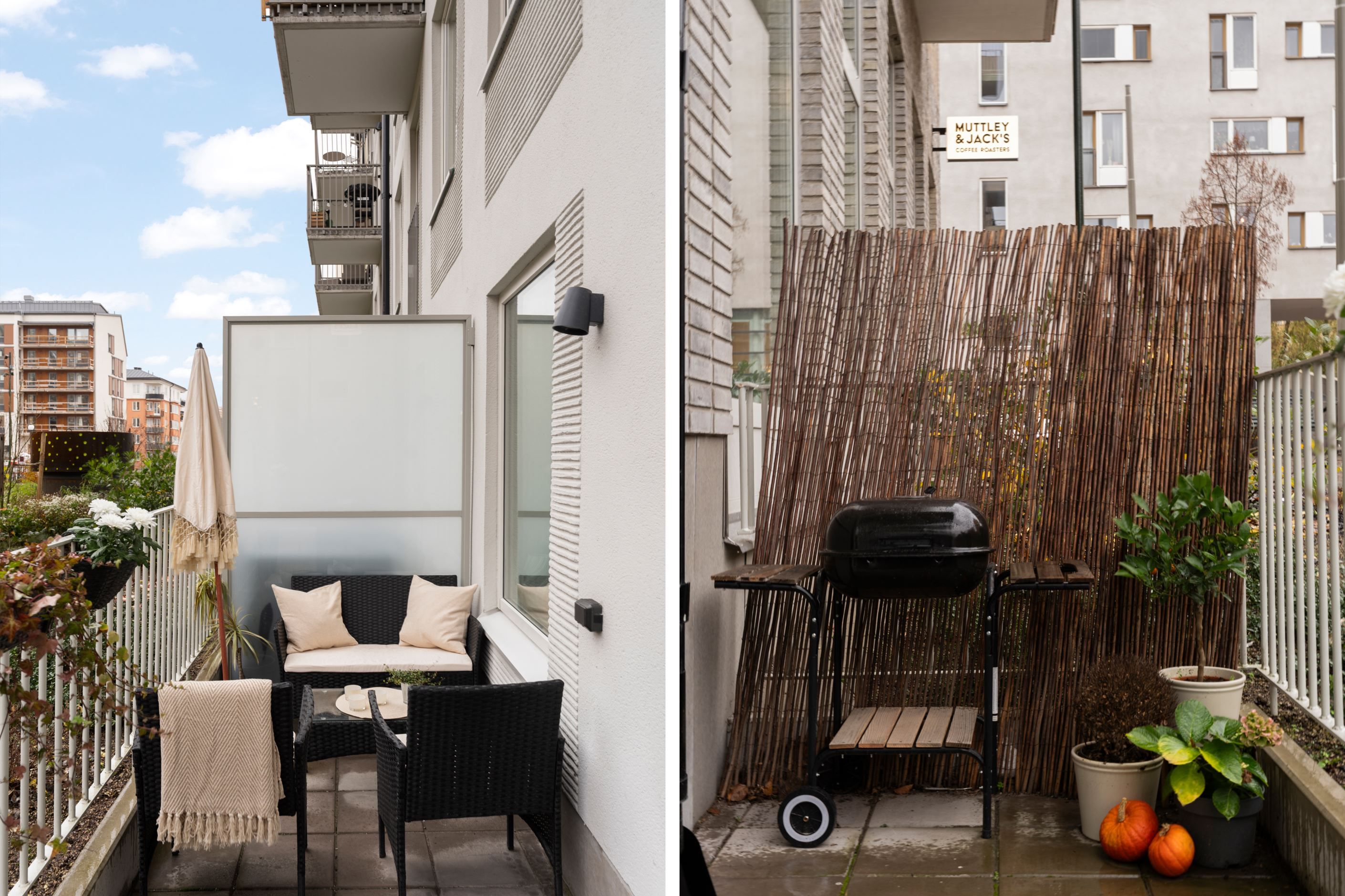 Från vardagsrummet nås den generösa uteplatsen – en härlig förlängning av bostaden under årets varmare månader. Här finns gott om plats för loungemöbler, grill och matgrupp, perfekt för sommarens middagar och umgänge med familj och vänner.