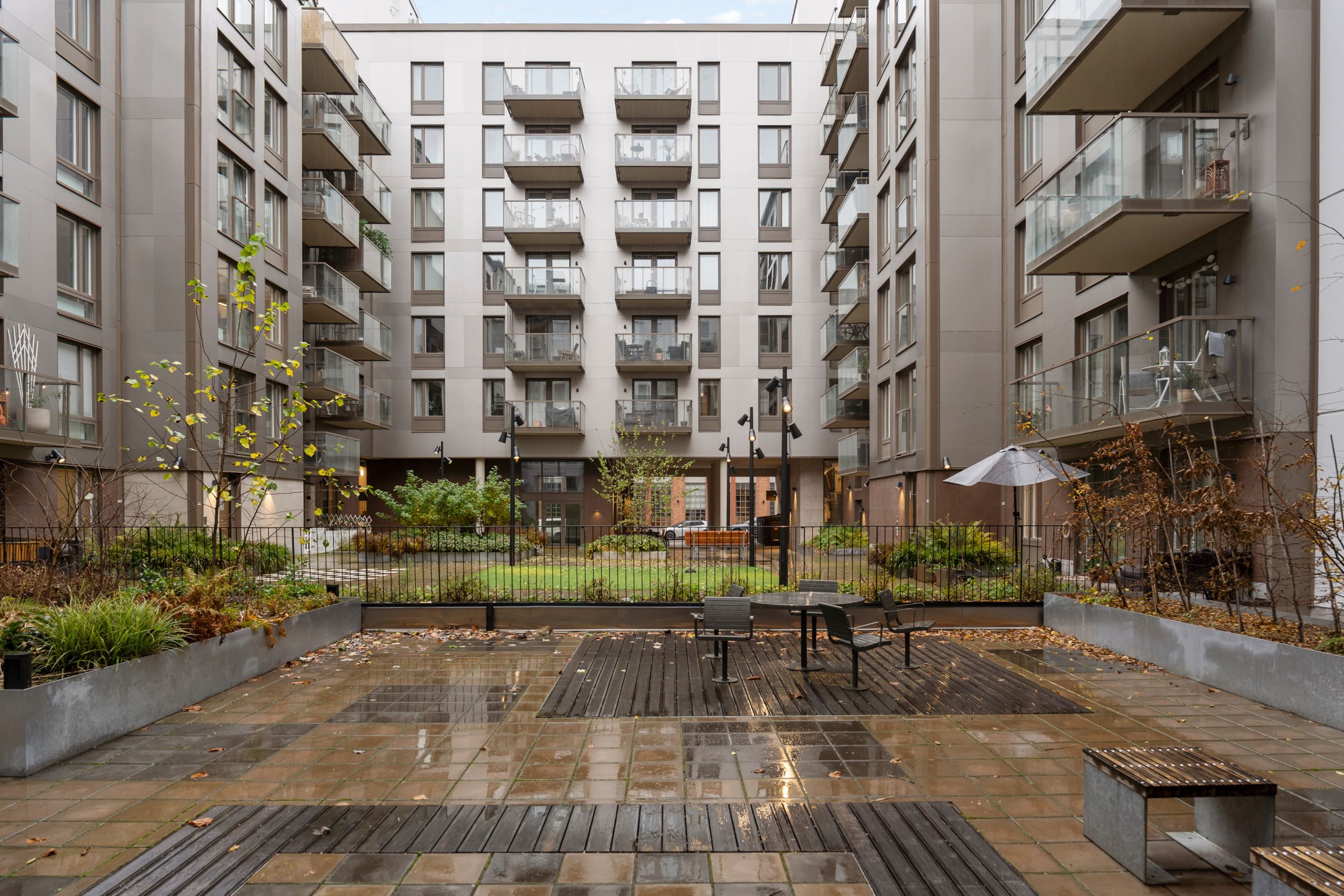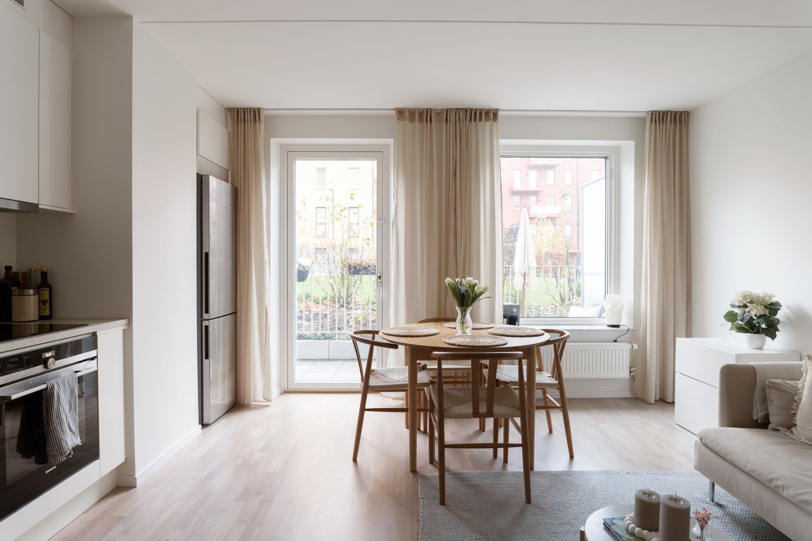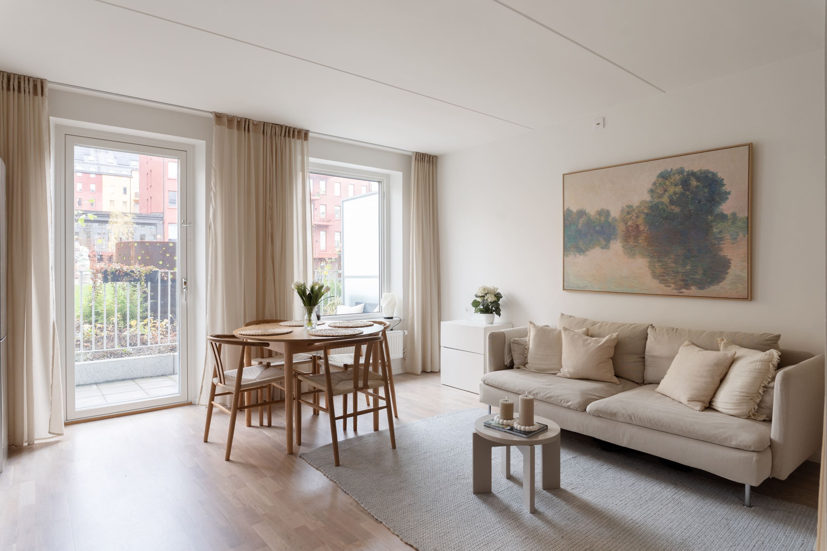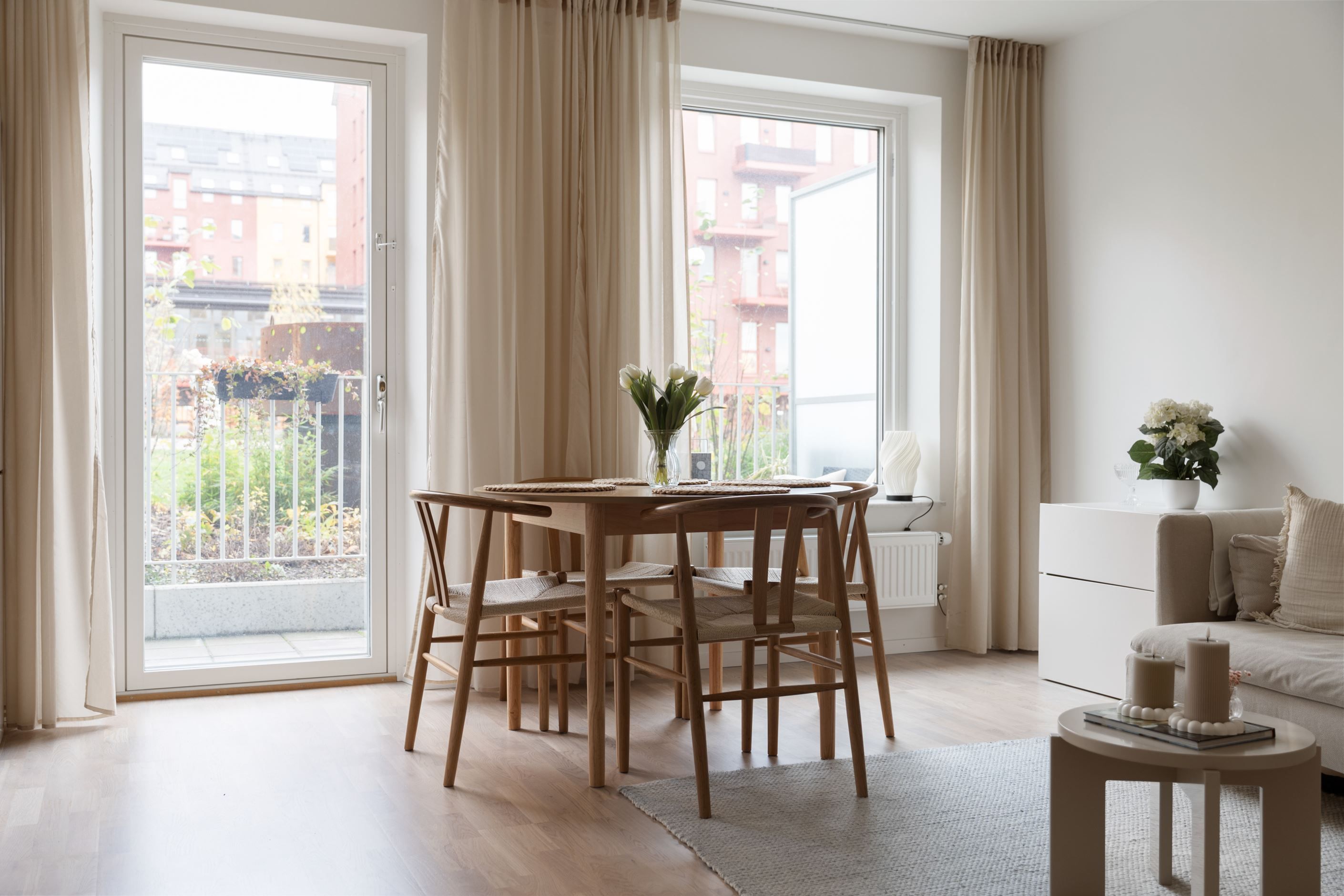 Från vardagsrummet nås den generösa uteplatsen – en härlig förlängning av bostaden under årets varmare månader. Här finns gott om plats för loungemöbler, grill och matgrupp, perfekt för sommarens middagar och umgänge med familj och vänner.