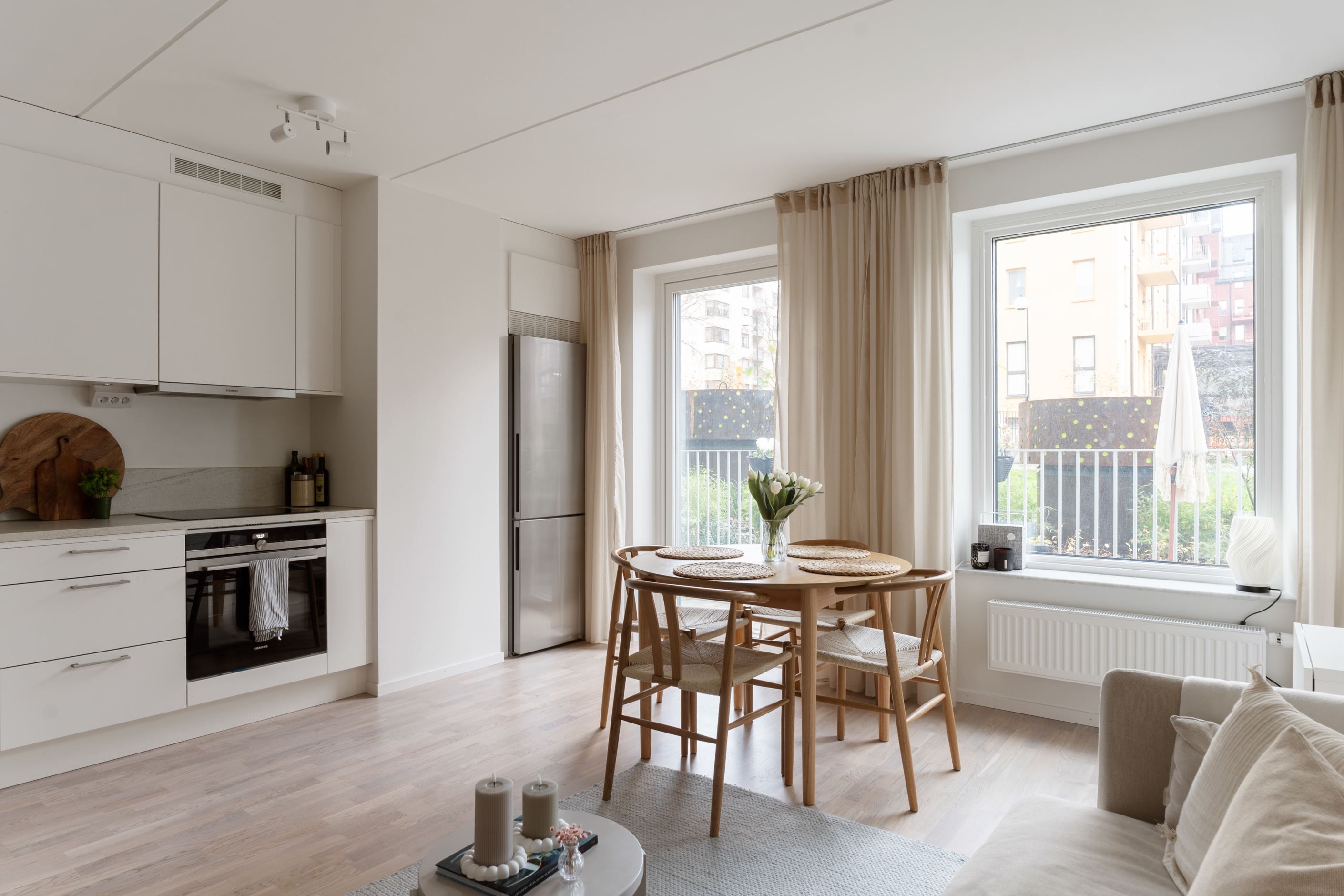 Hjärtligt välkomna till denna fina lägenhet på Barnängsgatan 15- en modern och trivsam bostad där varje detalj är genomtänkt. Här möts ni av en nyproducerad lägenhet (byggår 2023) som kombinerar stil, komfort och funktion på bästa sätt. Redan i hallen får ni en hemtrevlig känsla med gott om plats för avhängning och generös förvaring i garderober. Det stilrena köket är fullt utrustat med allt ni behöver– kyl och frys, induktionshäll, ugn, inbyggd mikro och diskmaskin. Här finns både bra arbetsytor och gott om förvaring, vilket gör matlagningen till en ren fröjd. Köket ligger i öppen planlösning mot vardagsrummet där det finns plats för både soffgrupp, matbord och det ryms även en liten arbetshörna. Den smart planerade sovalkoven rymmer en 140 cm säng och skapar en mysig och avskild sovplats. Badrummet är stilrent och helkaklat, utrustat med duschhörna, wc, tvättmaskin och torktumlare, handfat med kommod, spegelskåp och handdukstork