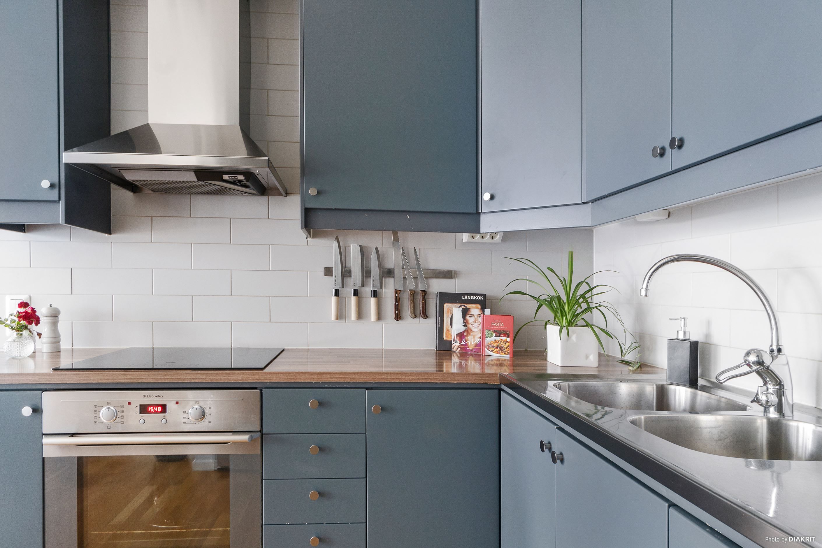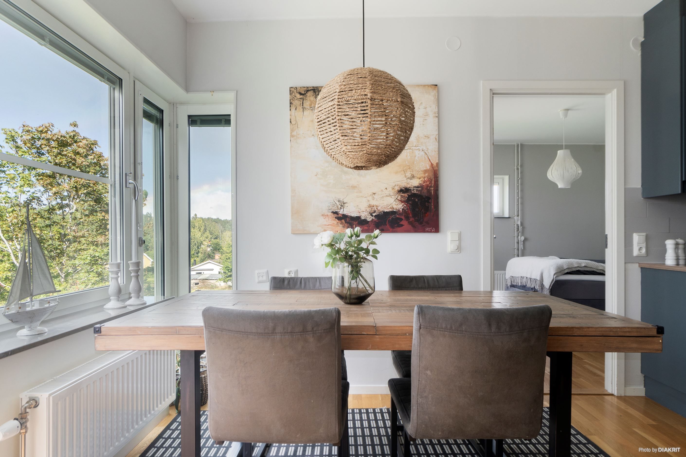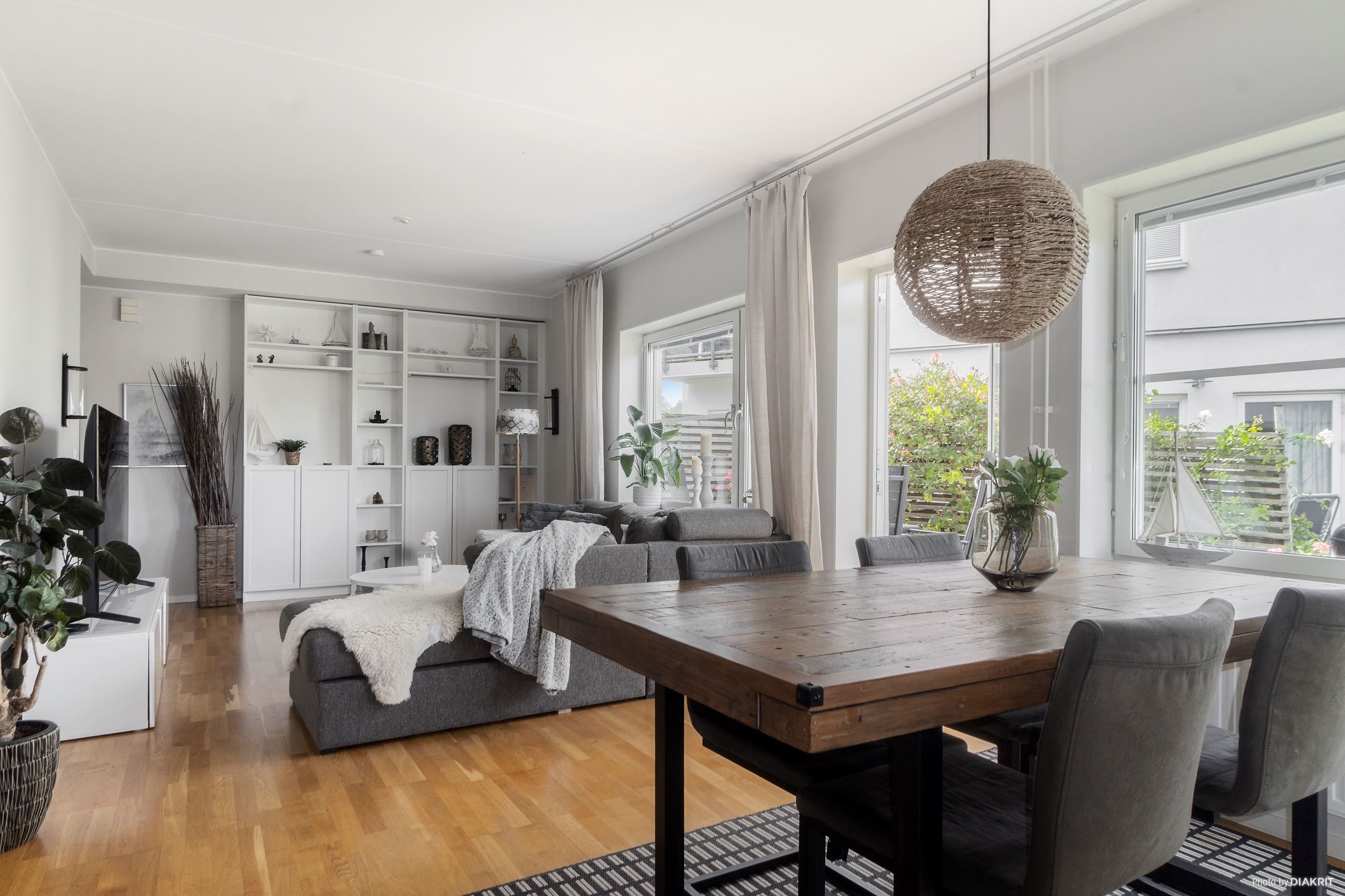 Invändigt möts du av ett hem med generöst ljusinsläpp tack vare stora fönsterpartier och en modern, öppen planlösning mellan kök och vardagsrum. Från de fina, sociala ytorna nås uteplatsen. Köket är stilrent utformat i tidlösa färgval och erbjuder både gott om arbetsyta och förvaring. Här finns full maskinell utrustning med induktionshäll, inbyggdugn, inbyggd mikrovågsugn, spisfläkt, kyl och frys i fullhöjd samt integrerad diskmaskin. Intill köket finns en rymlig matplats vid fönster – en perfekt plats för både vardagsmiddagar och större sällskap.