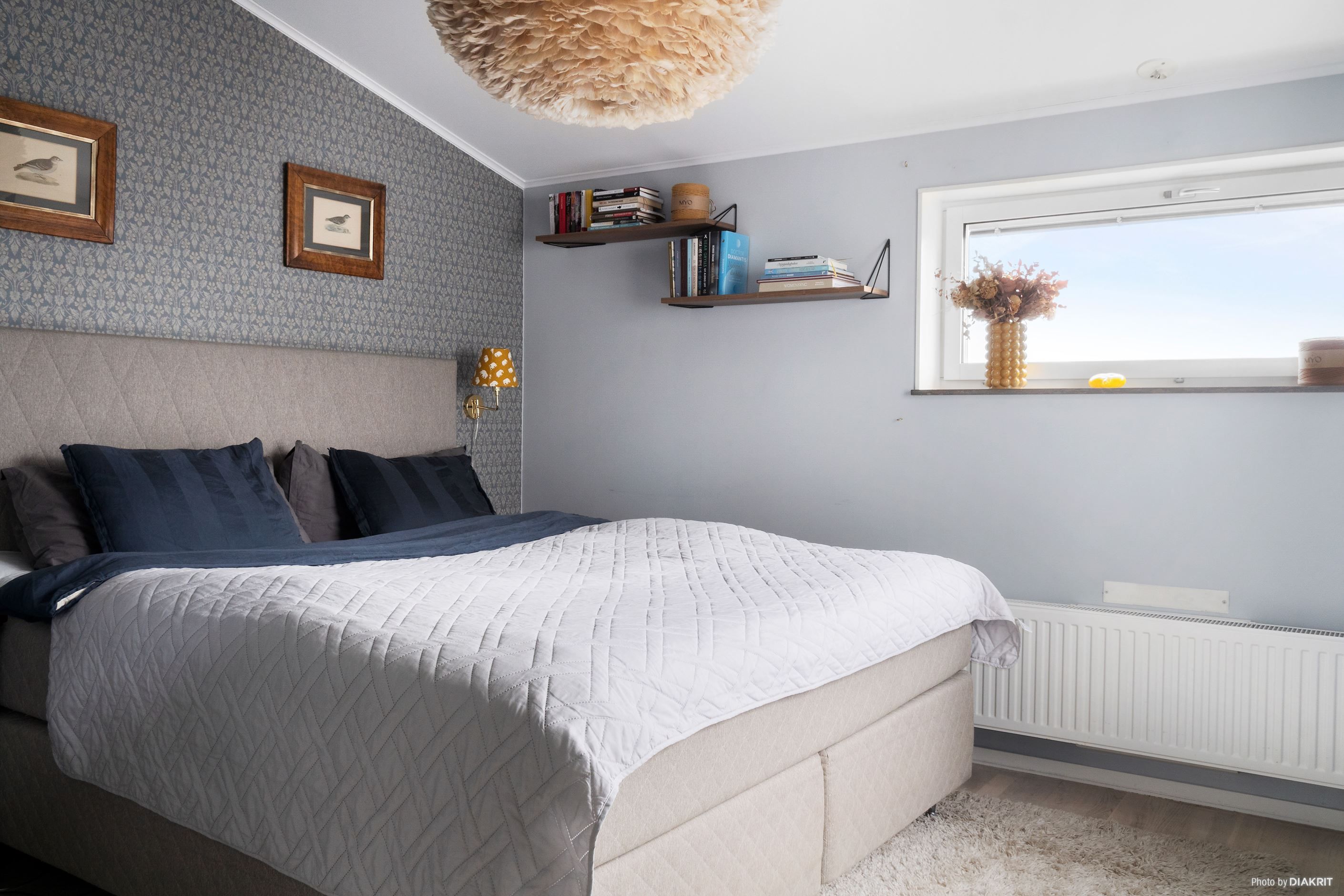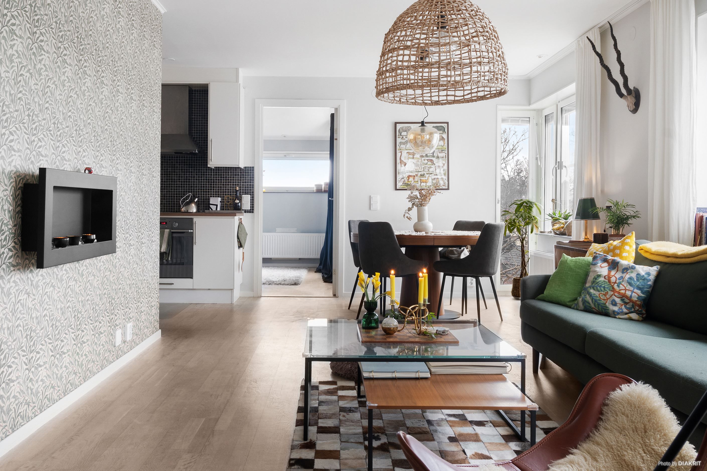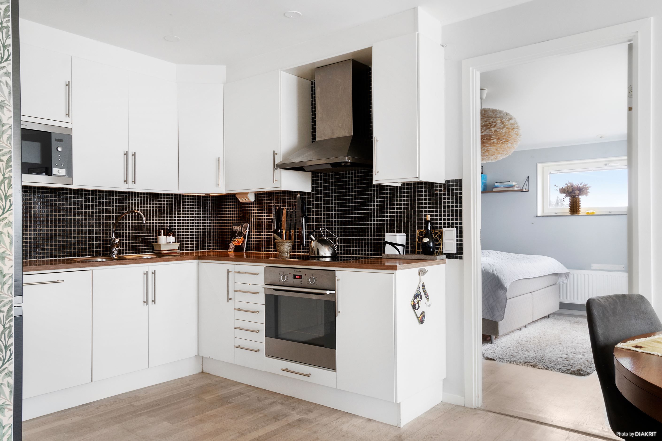 Interiören är genomgående smakfull med ljusa målade väggar, stilfulla fondtapeter och eleganta vitlaserade parkettgolv som ger en modern och enhetlig känsla.