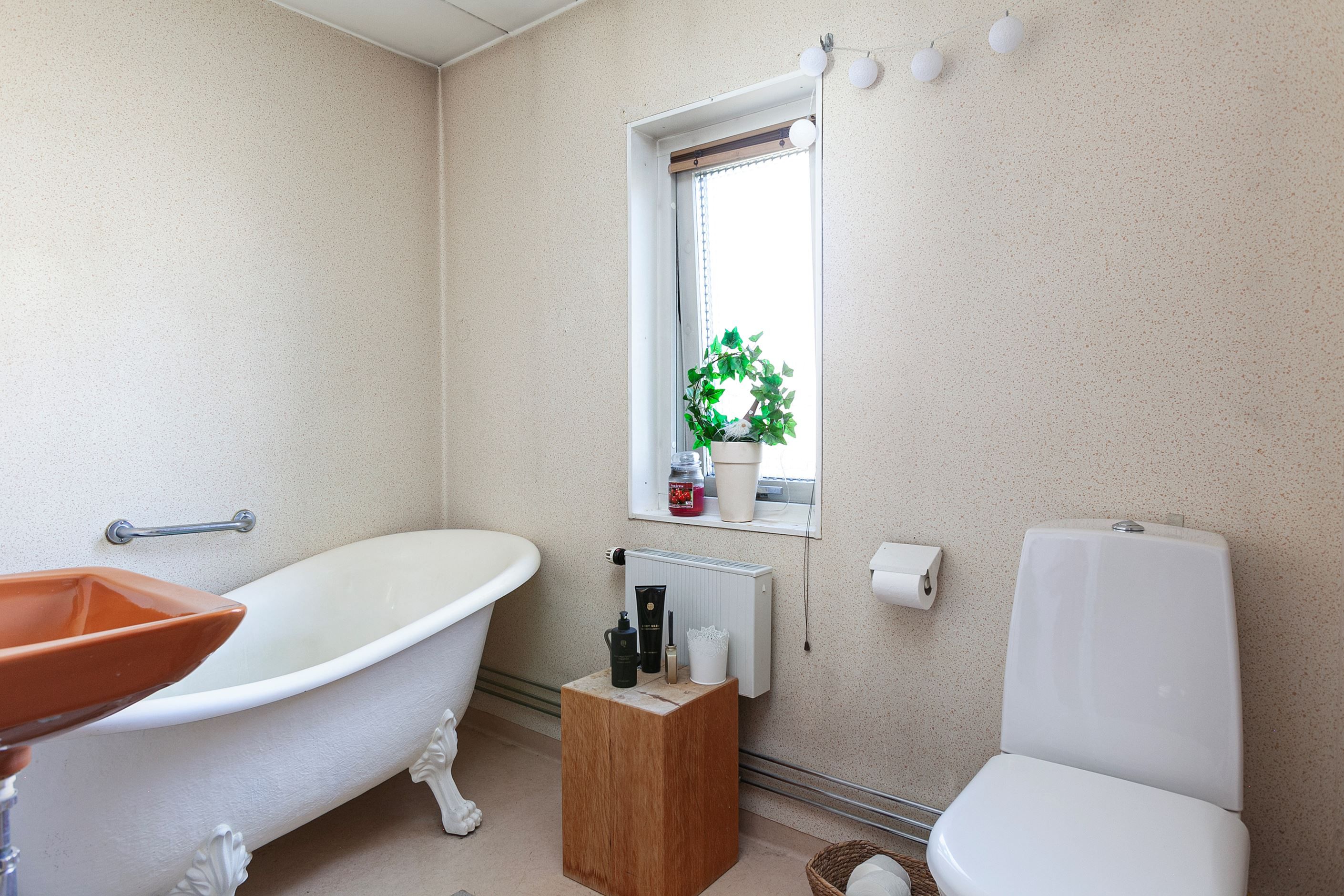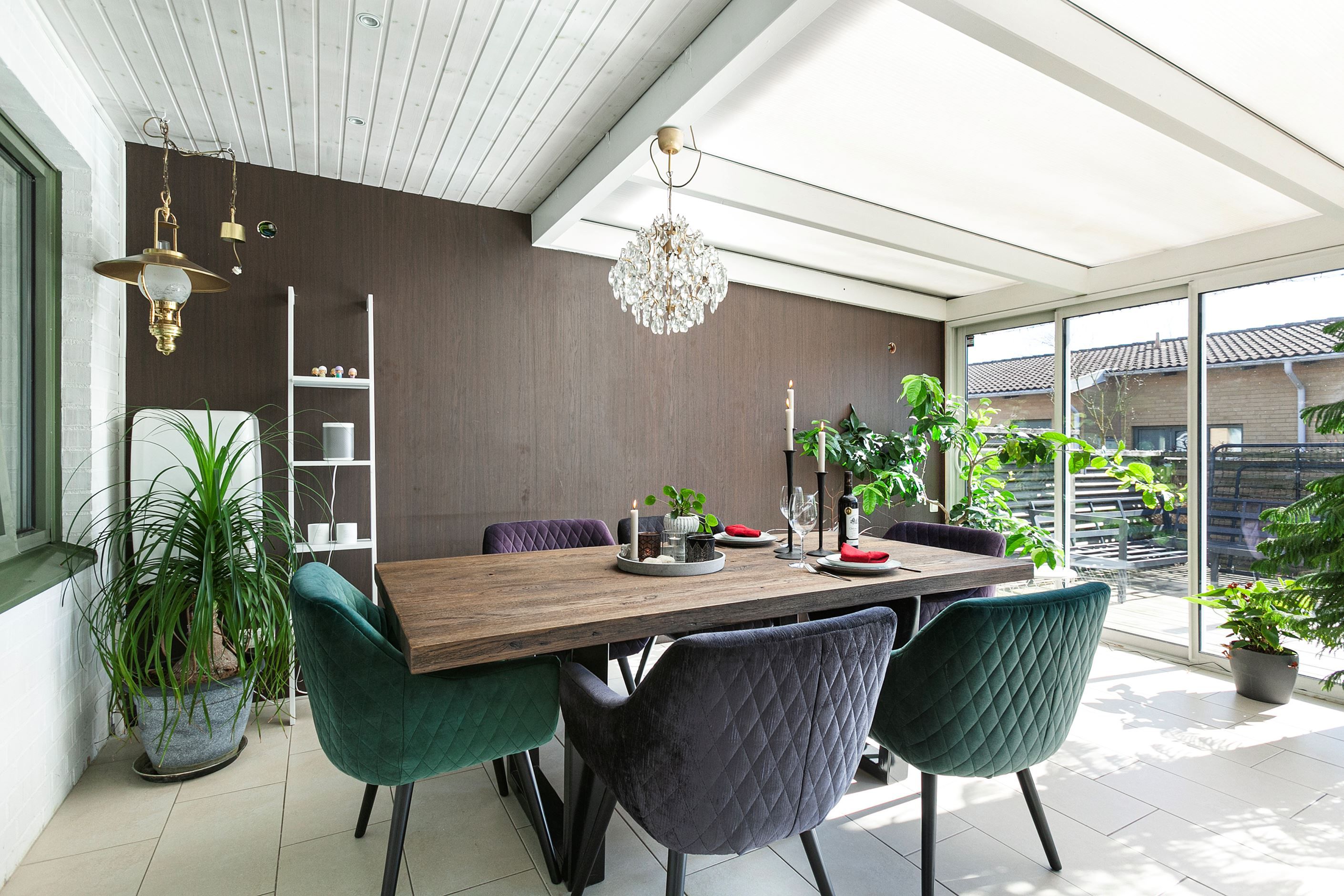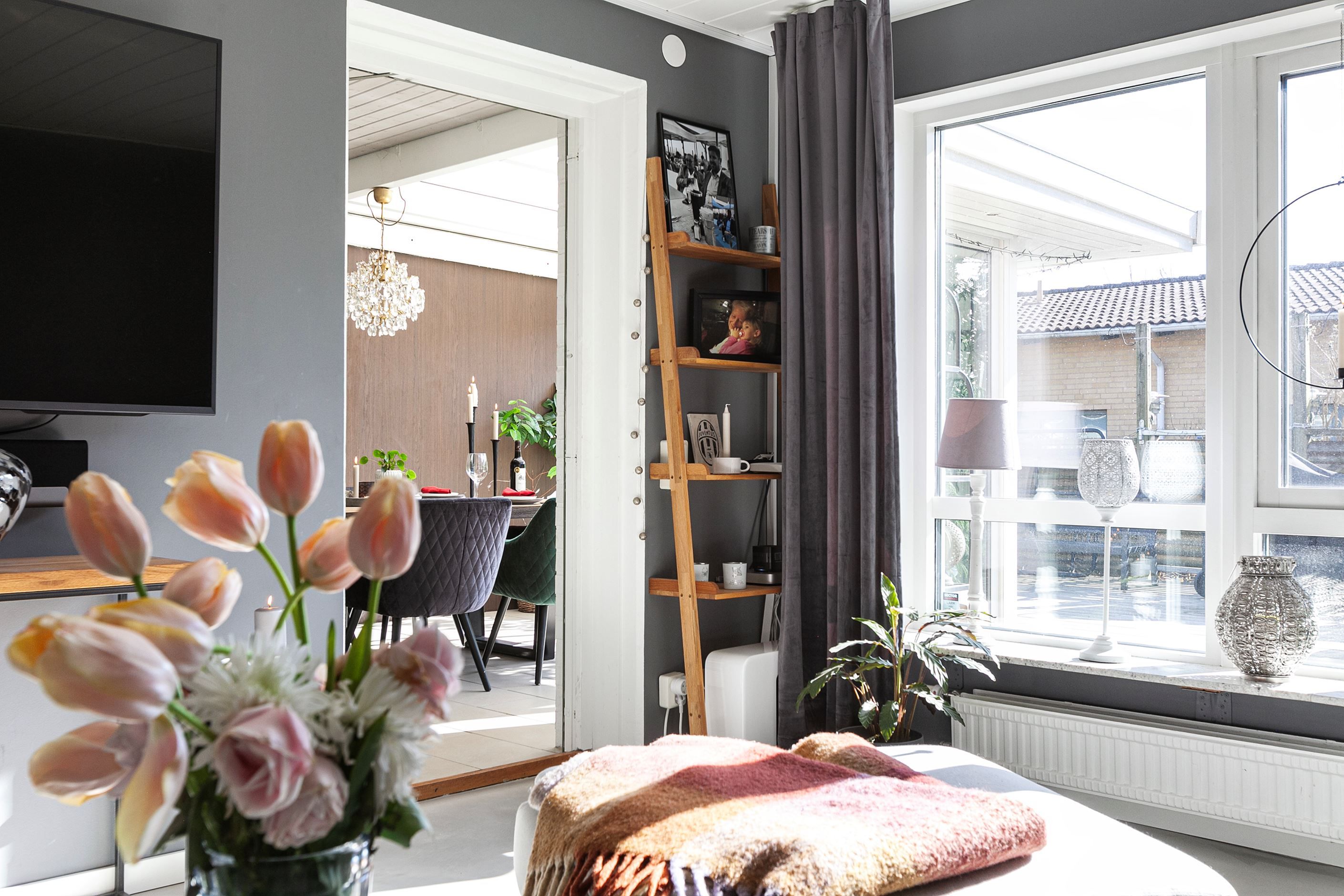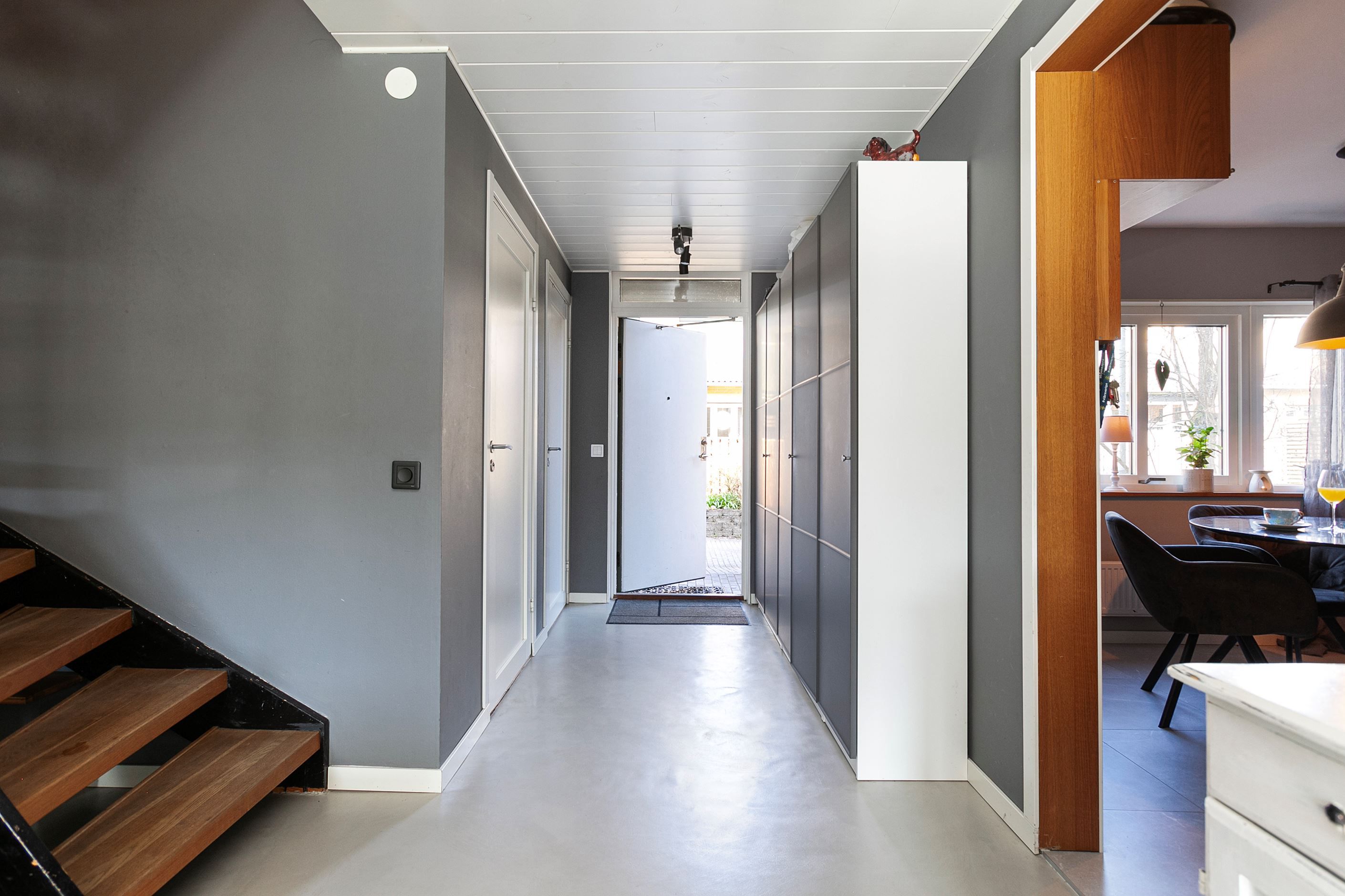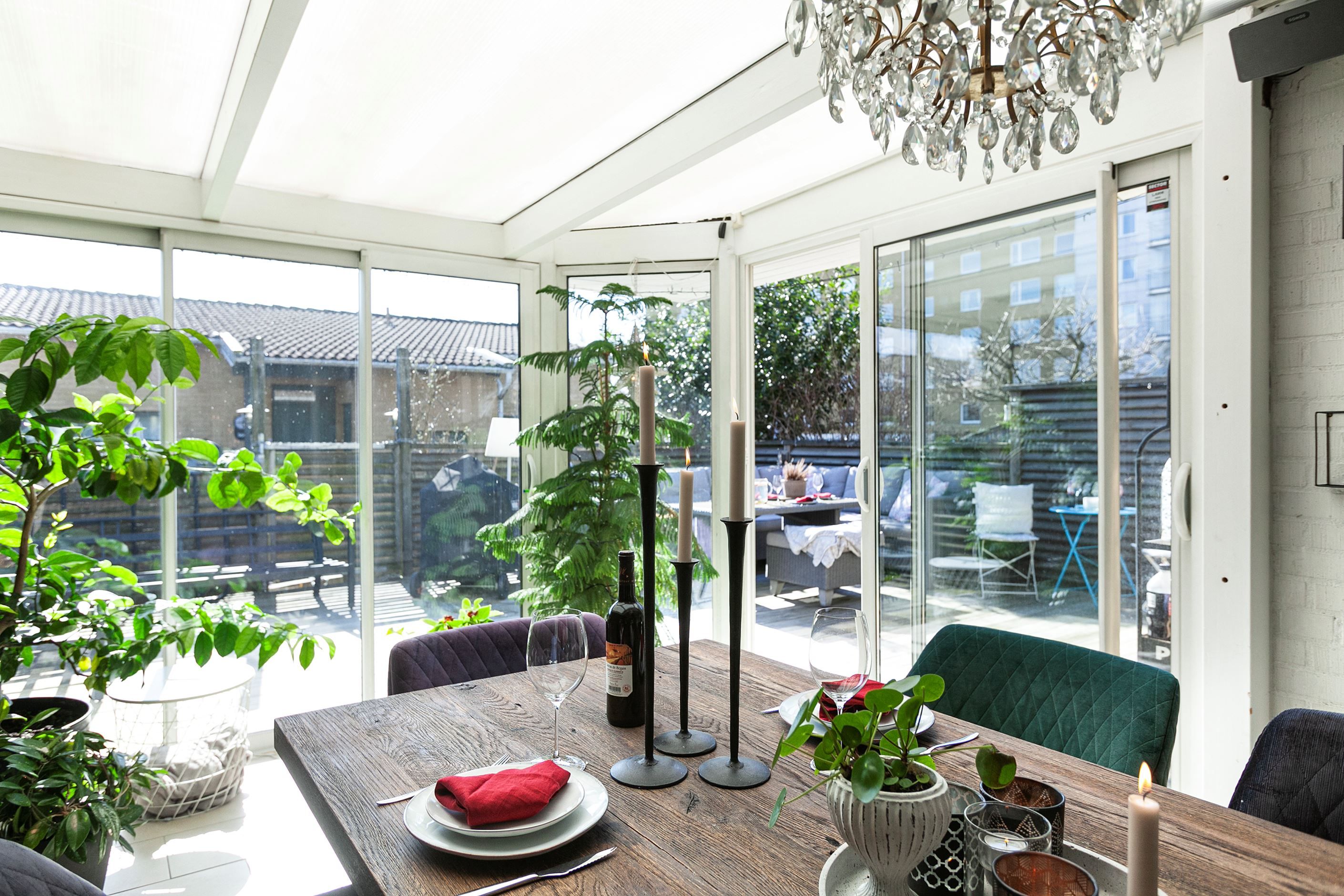 Entréplanet rymmer ett stort kök med plats för matbord och bra arbetsytor – en yta där många kan samlas utan att det känns trångt. Intill ligger det luftiga vardagsrummet som har direkt anslutning till ett rejält vinterbonat uterum. Här får du en extra sällskapsyta som kan användas hela året, oavsett väder. Från uterummet tar du dig vidare ut på den stora uteplatsen, en privat och lättskött yta perfekt för både avkoppling och sociala stunder. På detta våningsplan finns även ett av bostadens fyra sovrum, ett badrum samt en separat tvättstuga – en praktisk lösning för vardagen.