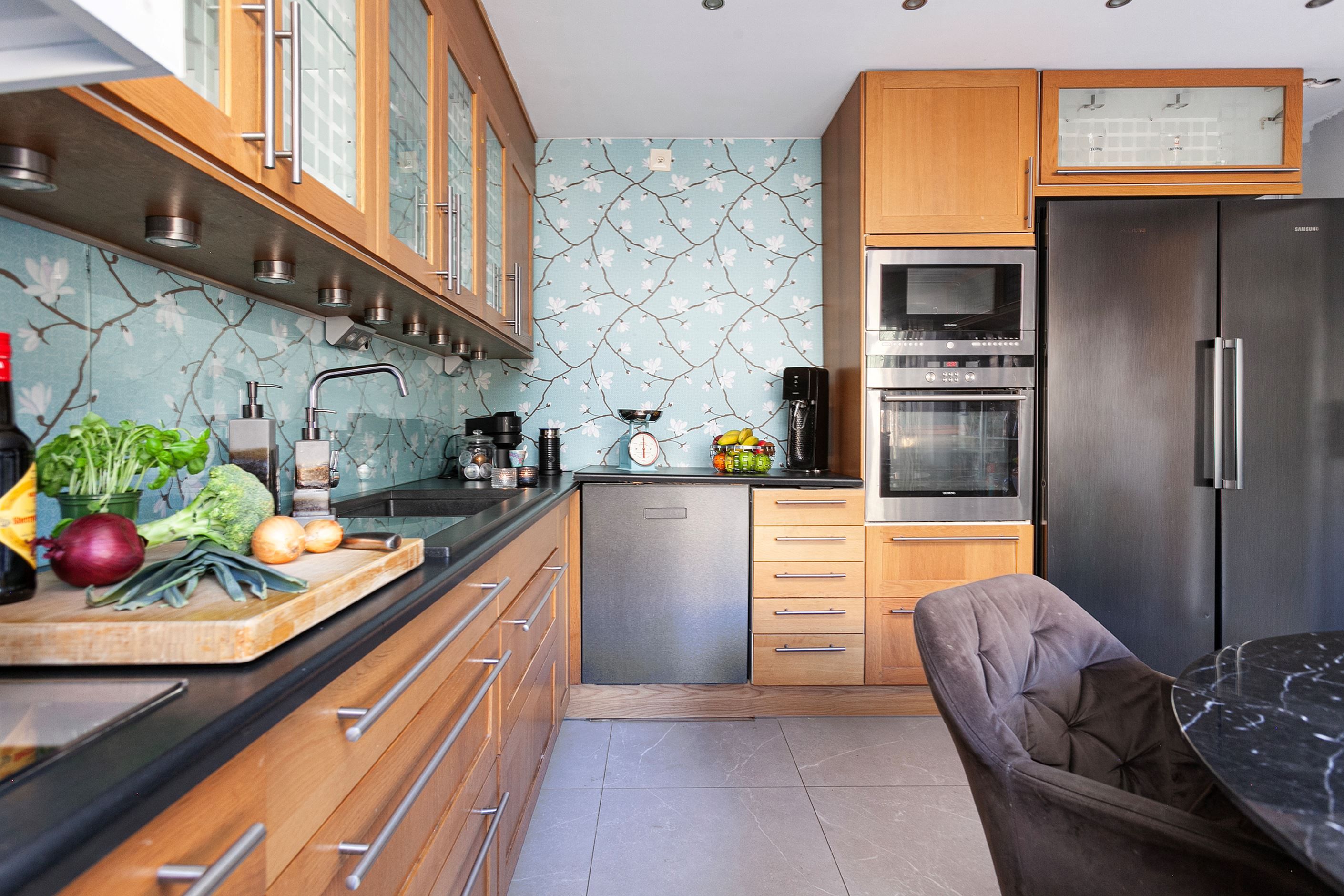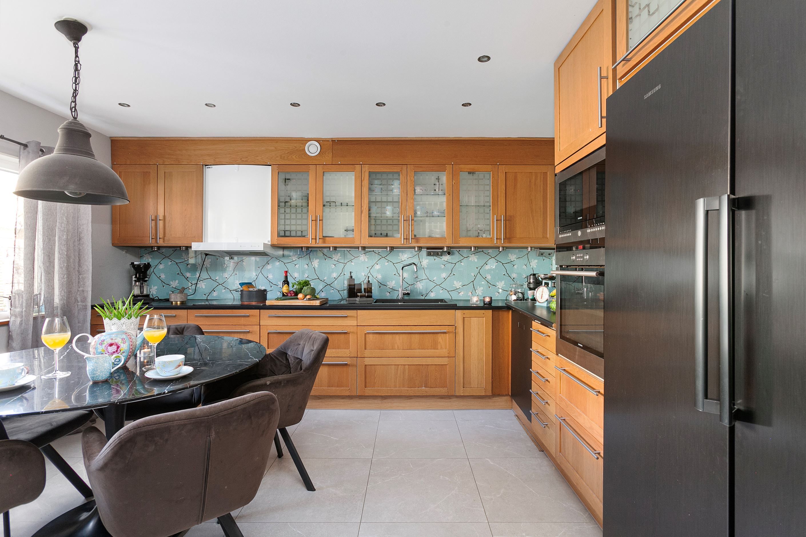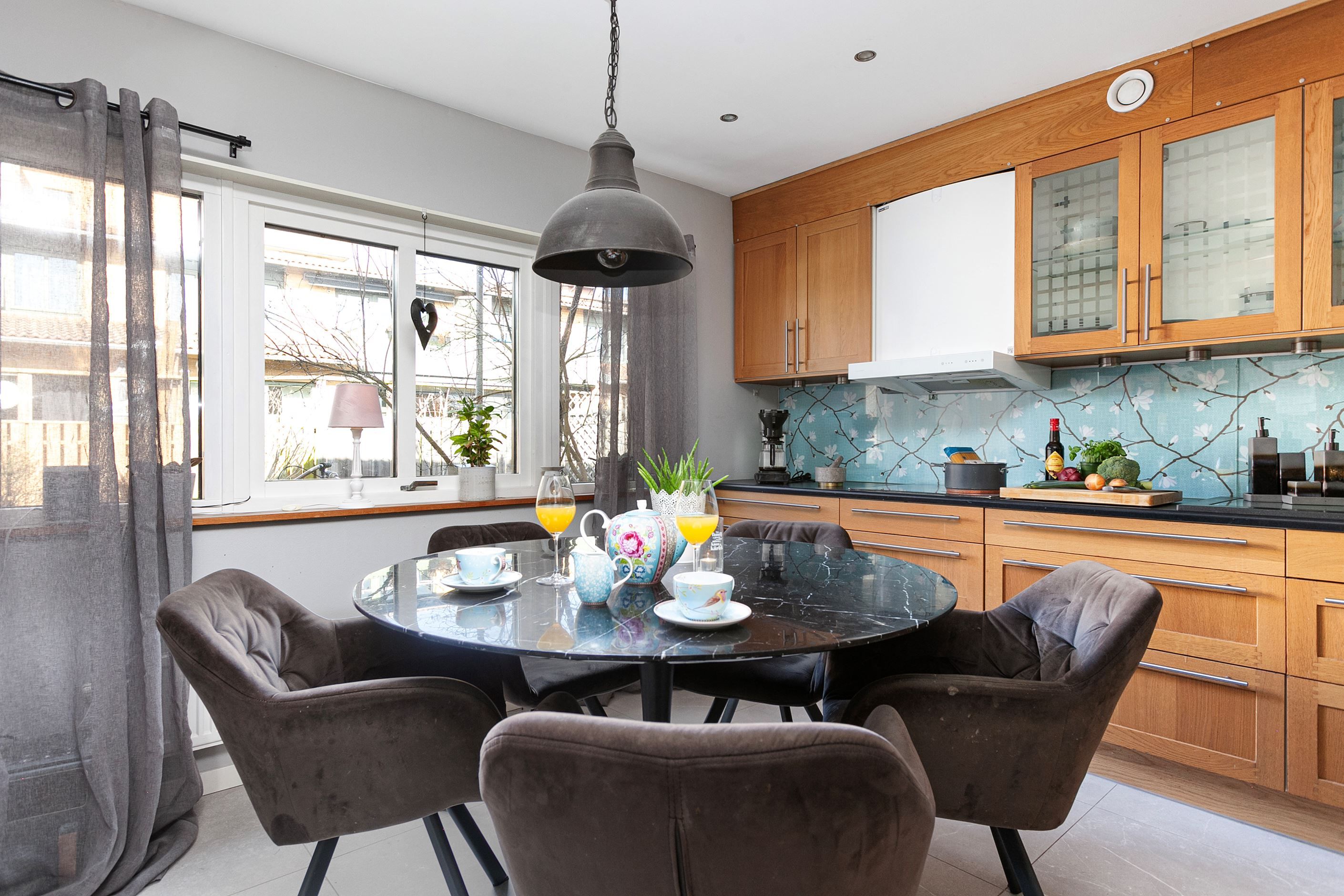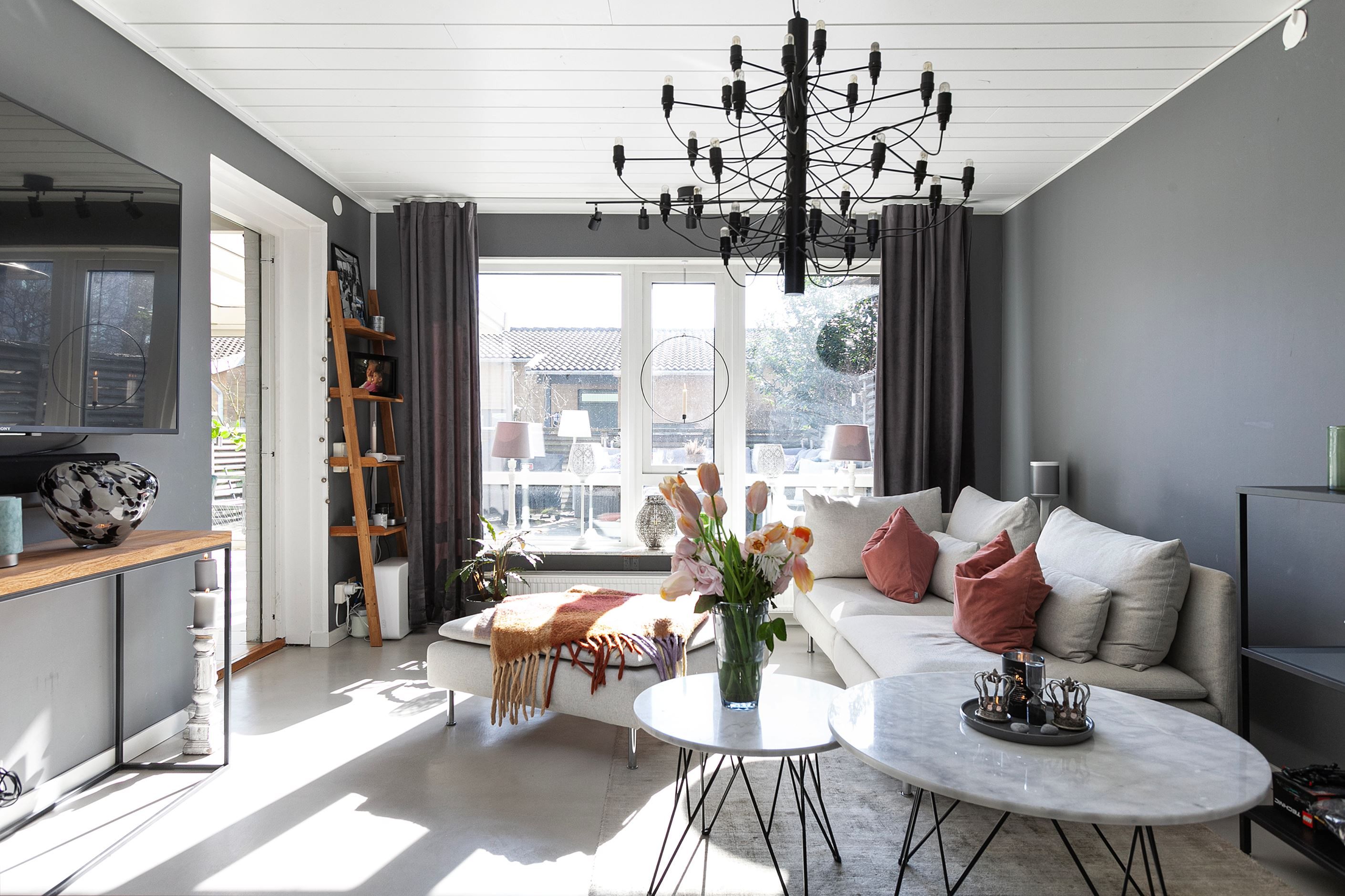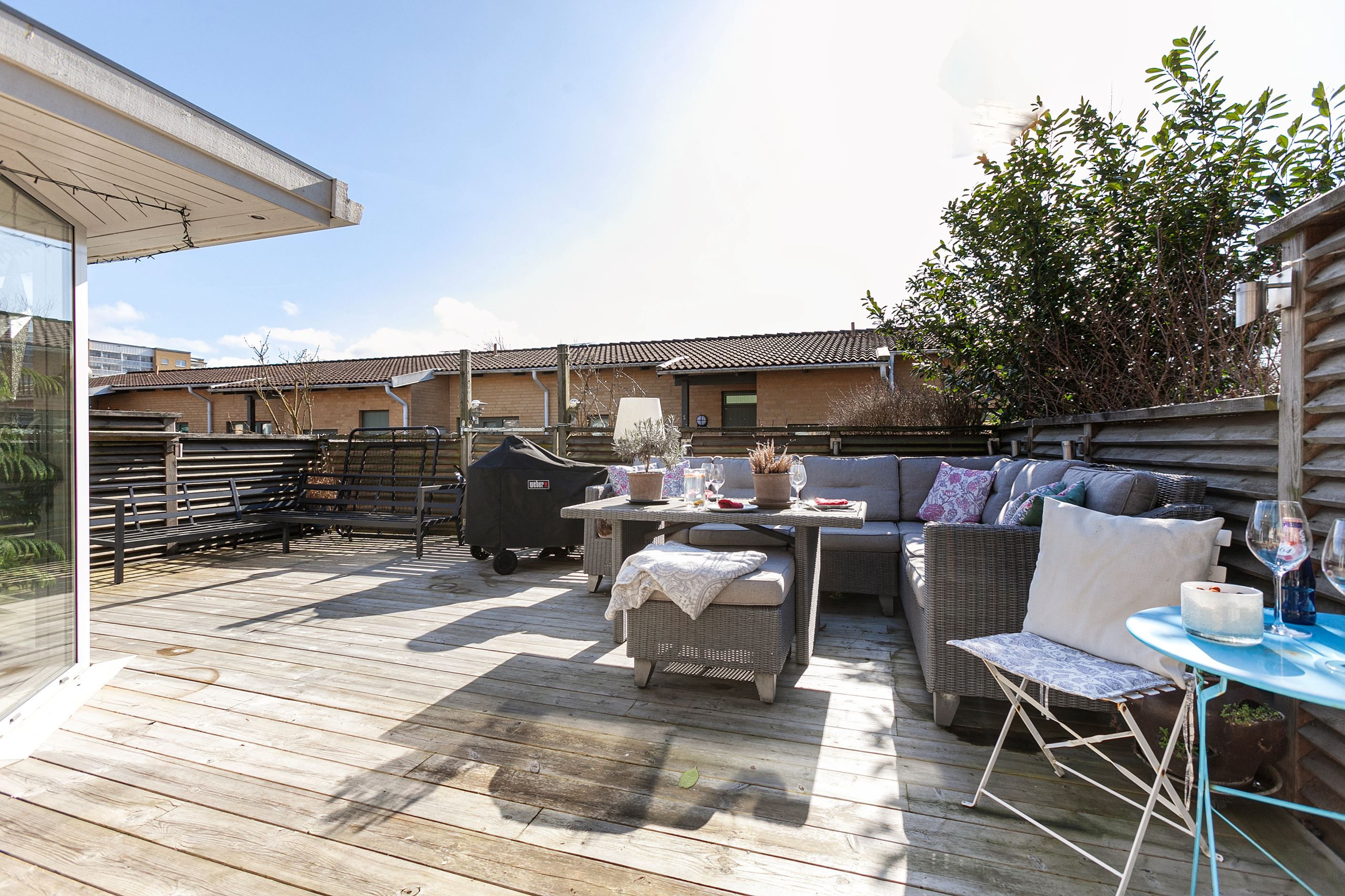 Entréplanet rymmer ett stort kök med plats för matbord och bra arbetsytor – en yta där många kan samlas utan att det känns trångt. Intill ligger det luftiga vardagsrummet som har direkt anslutning till ett rejält vinterbonat uterum. Här får du en extra sällskapsyta som kan användas hela året, oavsett väder. Från uterummet tar du dig vidare ut på den stora uteplatsen, en privat och lättskött yta perfekt för både avkoppling och sociala stunder. På detta våningsplan finns även ett av bostadens fyra sovrum, ett badrum samt en separat tvättstuga – en praktisk lösning för vardagen.