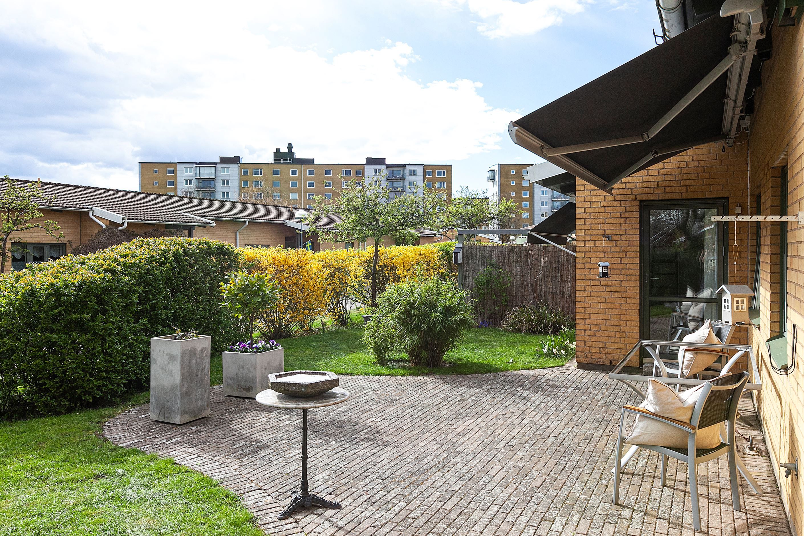 Uteplatsen är omgärdad av en häck som skapar en privat och mysig atmosfär. Här kan du njuta av soliga dagar eller lugna kvällar med nära och kära.