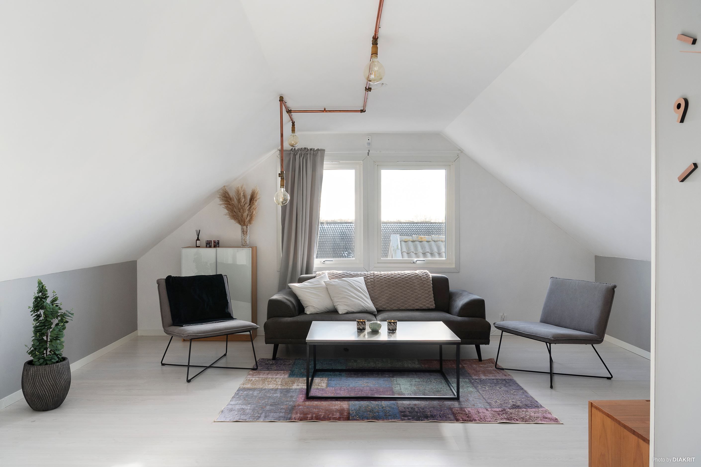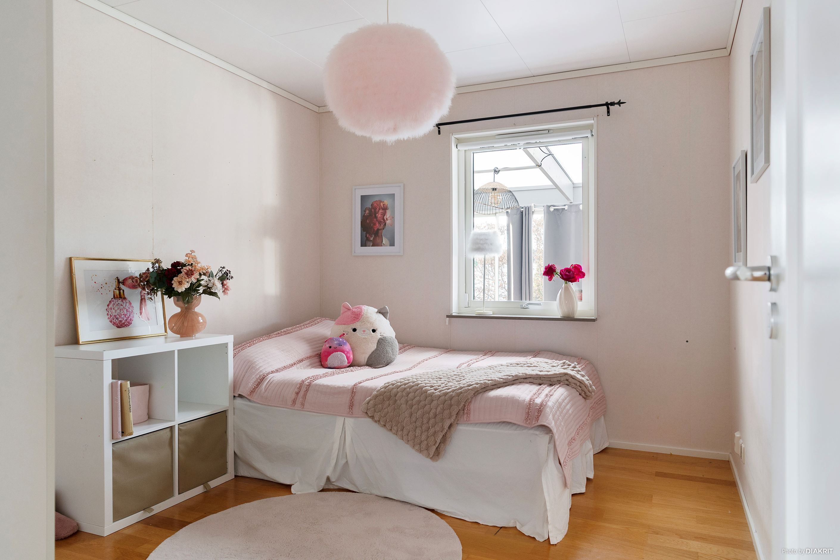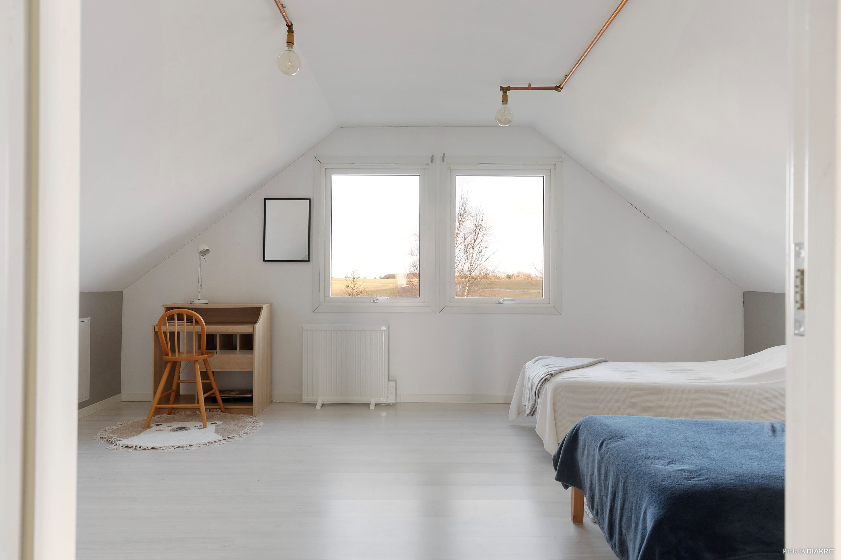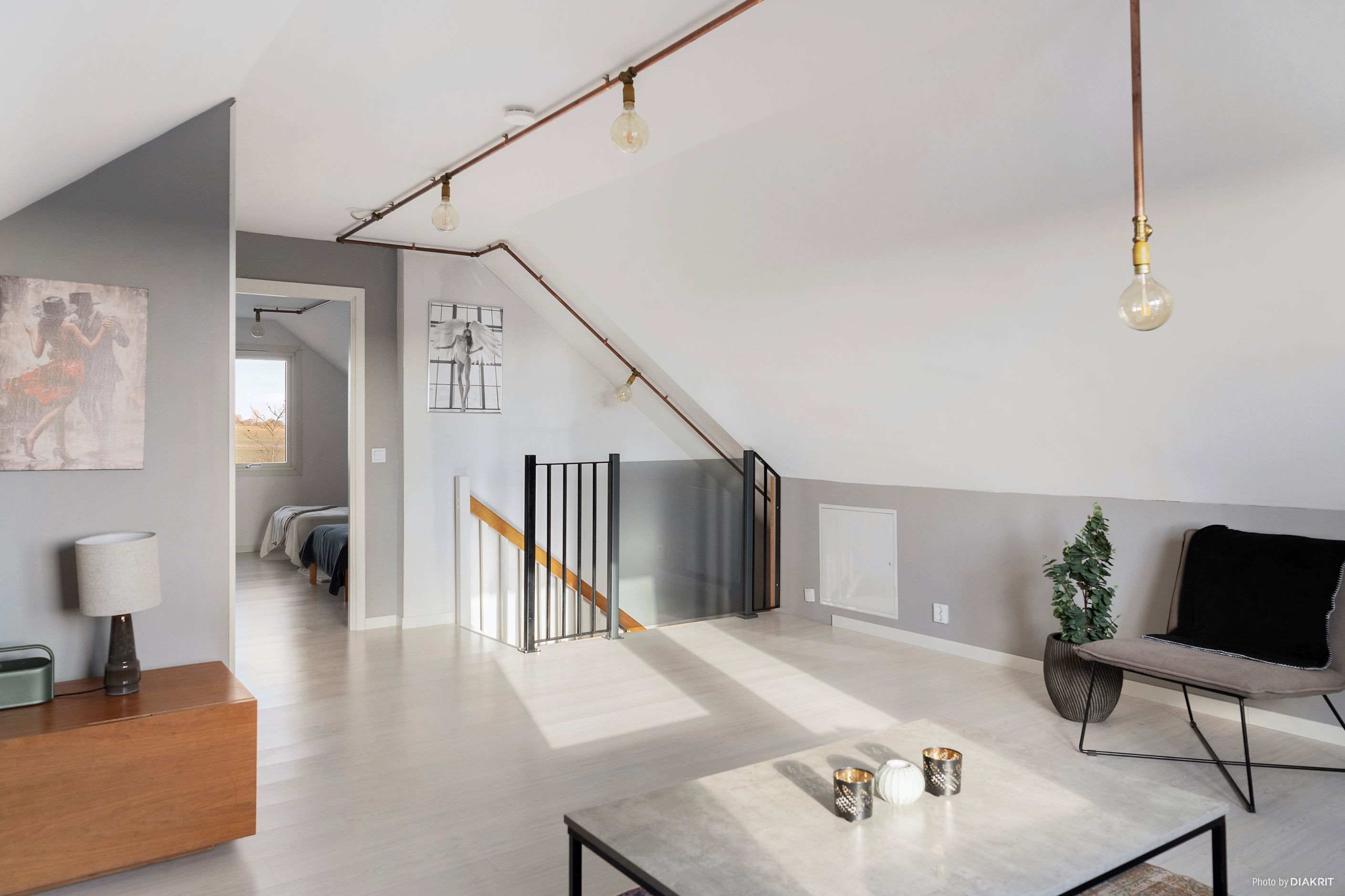 En trappa upp öppnar sig ett luftigt och ljust allrum – perfekt som tv-rum, barnens egen yta eller en stillsam plats för arbete och kreativitet. Här finns också ett stort sovrum som enkelt kan delas av till två, samt en gästtoalett som kompletterar våningsplanet på ett bekvämt sätt.