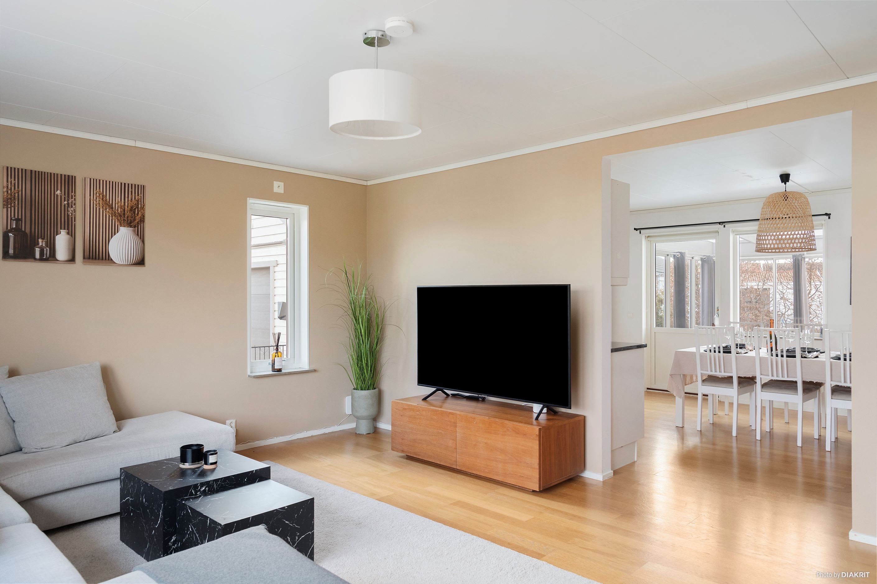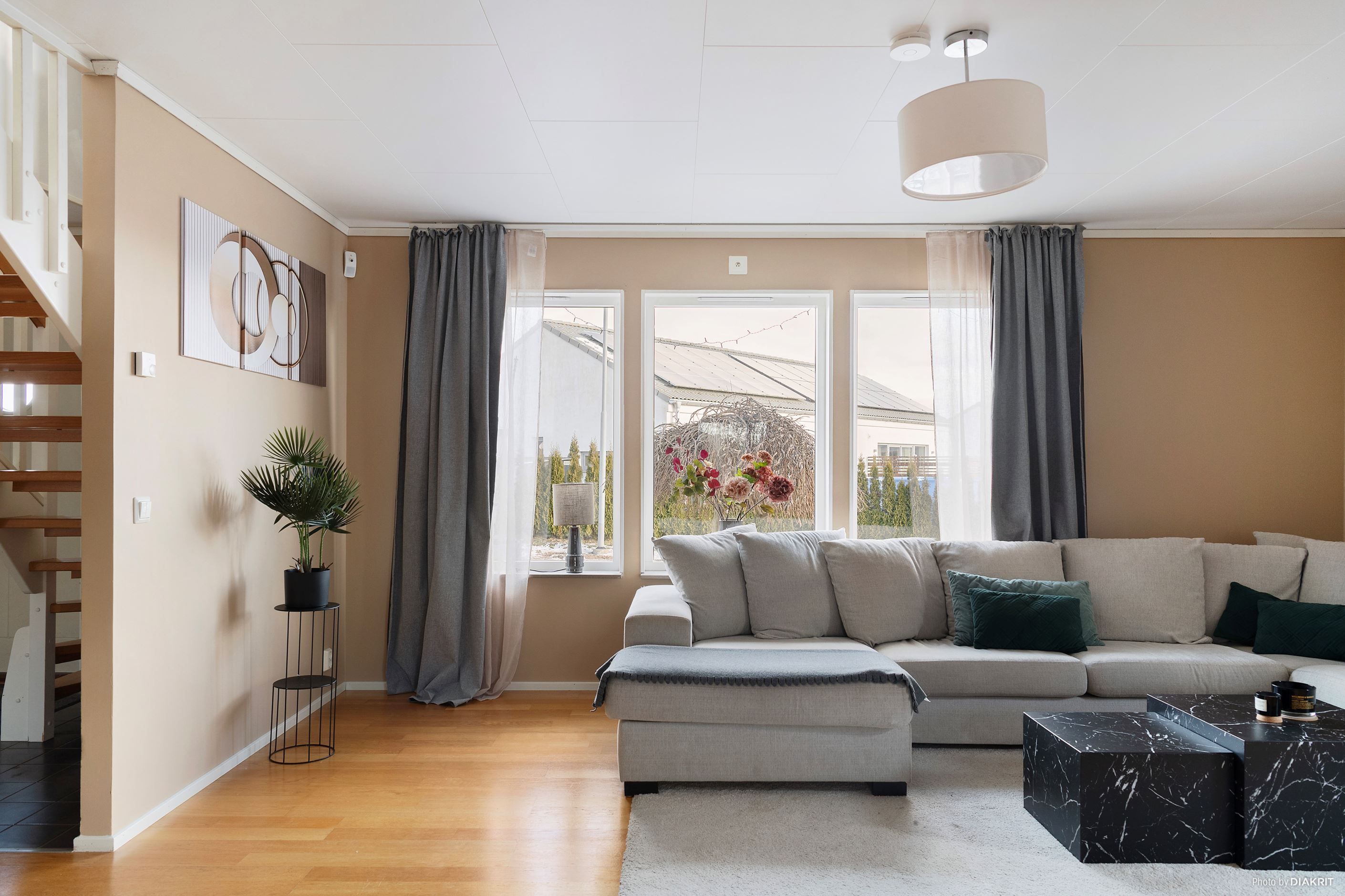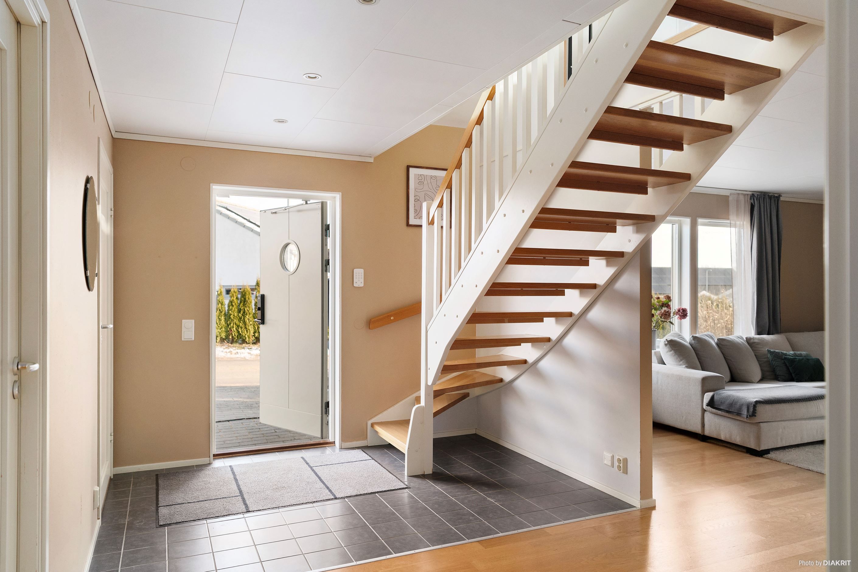 Invändigt möts du av en varm och hemtrevlig atmosfär. Entréplanet erbjuder ett rymligt vardagsrum med plats för både soffhörna och umgänge – ett rum att krypa upp i soffan i, året om. Köket är ljust och tidlöst, med gott om arbetsytor och plats för familjens middagar och långa samtal runt matbordet. Härifrån kliver du rakt ut i det generösa, tvådelade uterummet om totalt ca 30 kvm – en fantastisk plats som blir hemmets hjärta under stora delar av året. Vidare ut väntar trädäcket och trädgården i västerläge, där solen dröjer sig kvar långt in på kvällen. På entréplanet finns även två harmoniska sovrum, ett helkaklat badrum i lugna, neutrala toner med badkar, samt en praktisk groventré med tvättstuga som gör vardagen smidig och funktionell.
