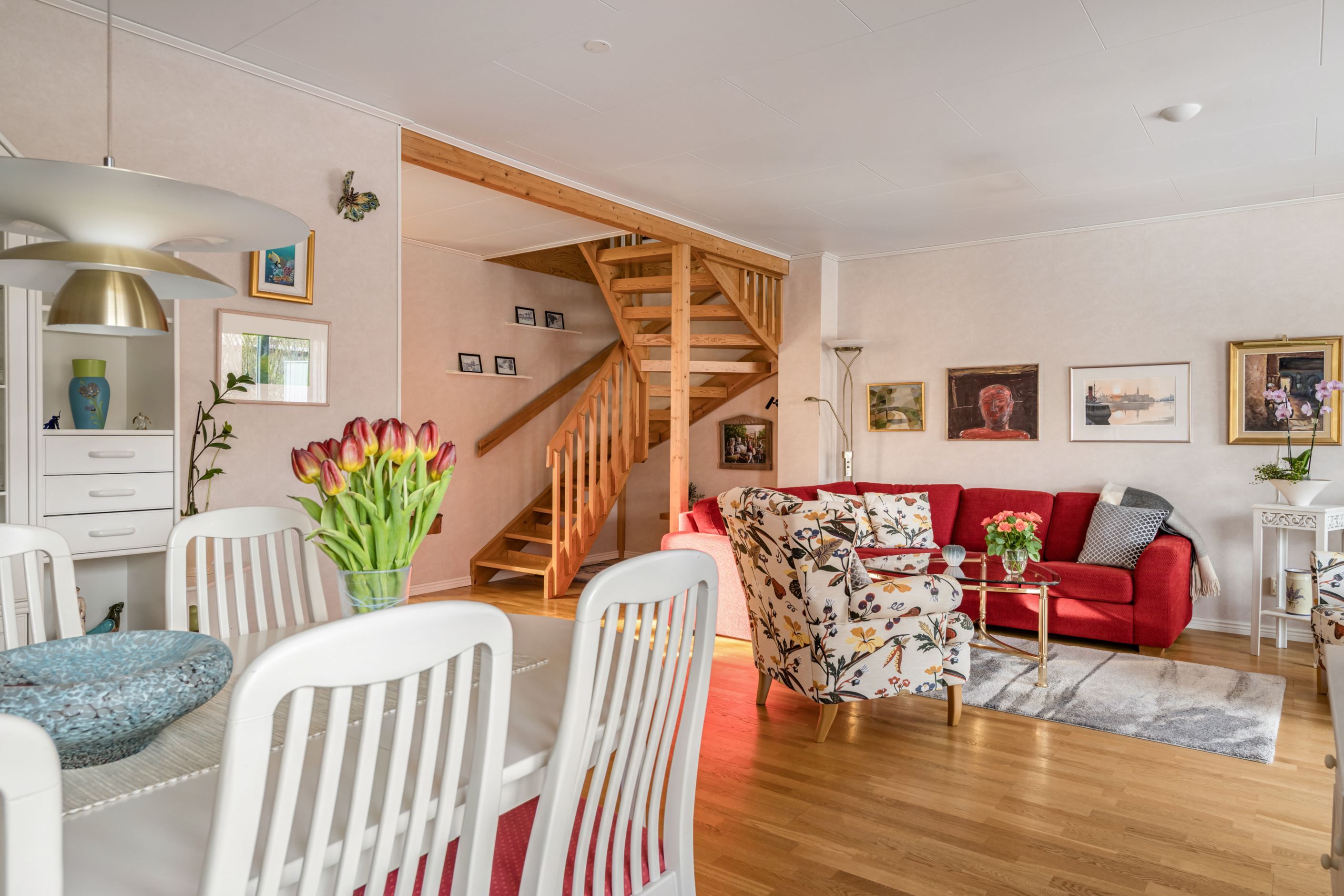 Invändigt erbjuds här en flexibel planlösning med möjlighet till 4 sovrum! I dagsläget finns 2 sovrum, men dom flesta grannar i föreningen har 4st, se alternativ planlösning under bilder. Köket är rymligt och har en bra matplats. På nedre plan finns också ett sovrum, en matsal (möjligt sovrum), vardagsrum samt ett exklusivt stilrent renoverat badrum 2022. Sovrummet på övre plan har i dagsläget en stort klädkammare, samt ett angränsande badrum. Tack vare gavelläget är huset väldigt inynsskyddat. På nedre plan flödar en vattenburen golvvärme, för maximal komfort. Givetvis finns även fiber installerat i huset.