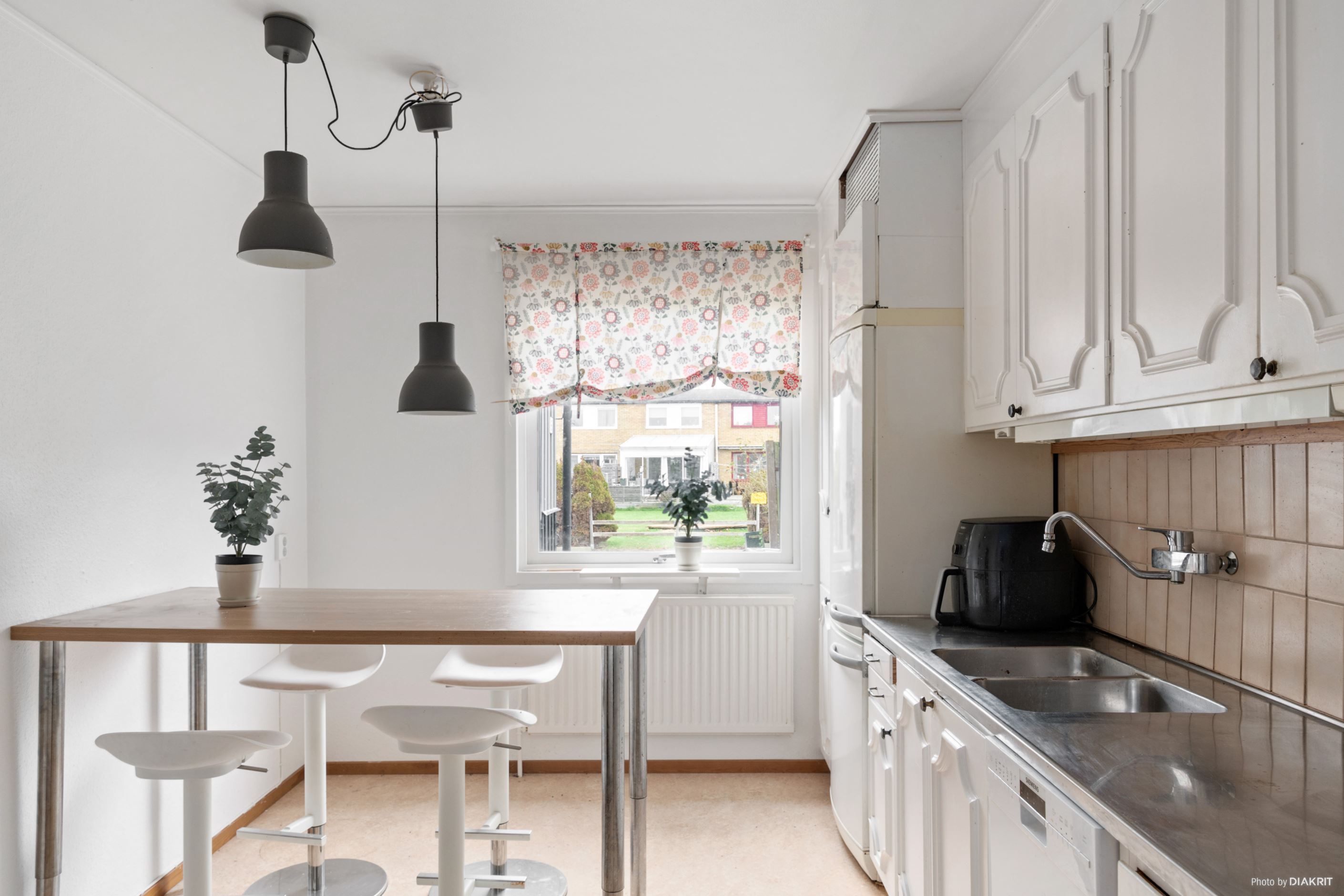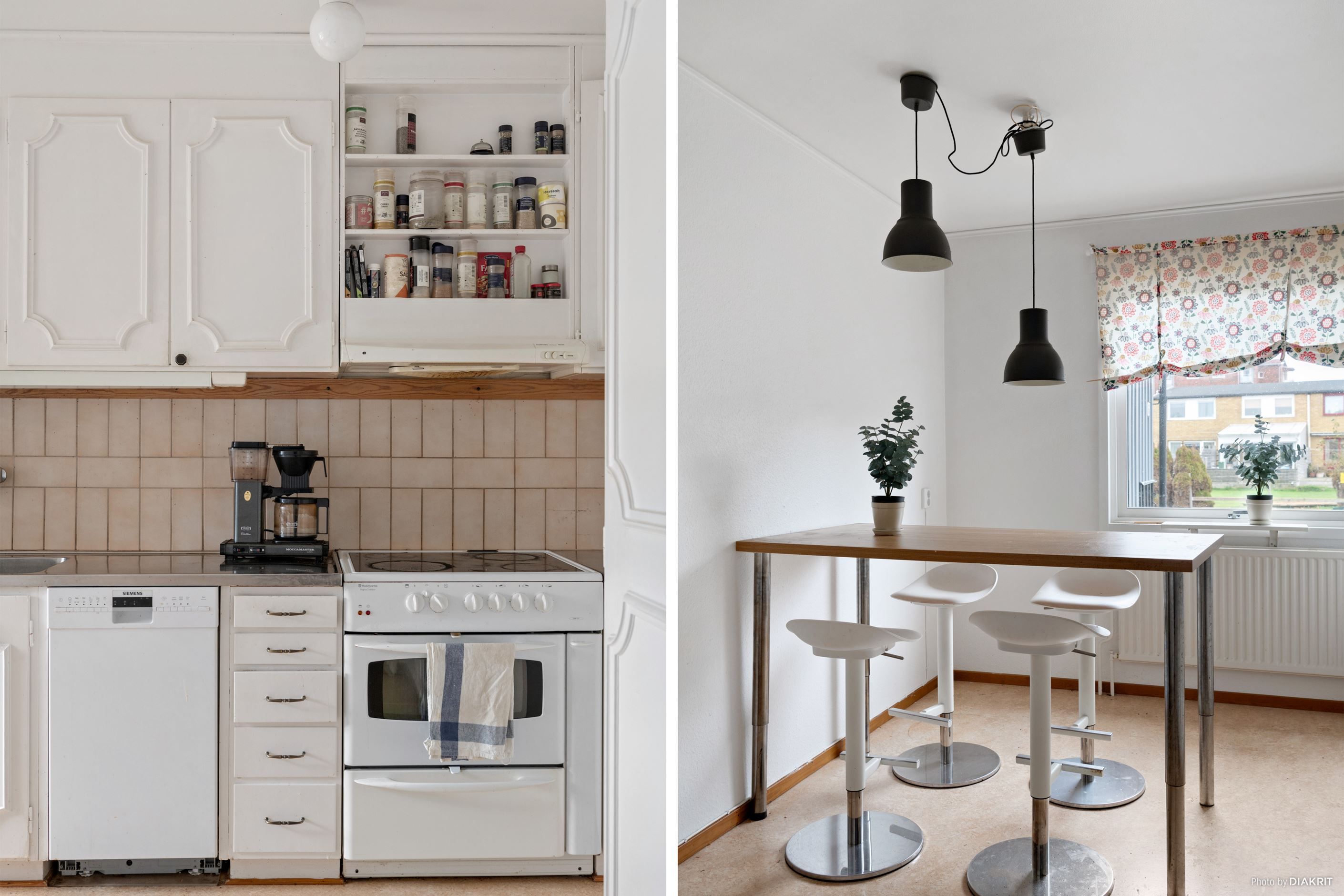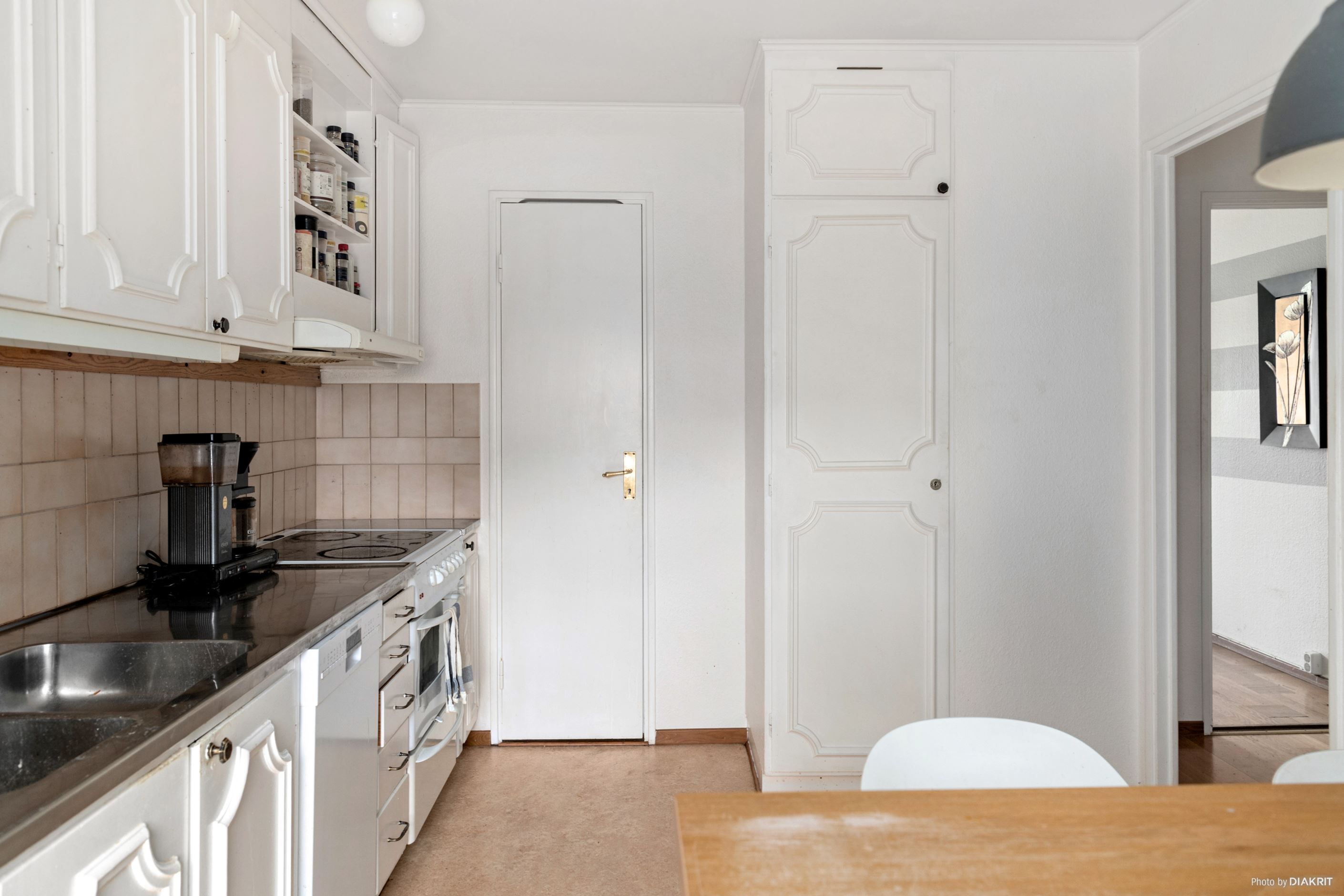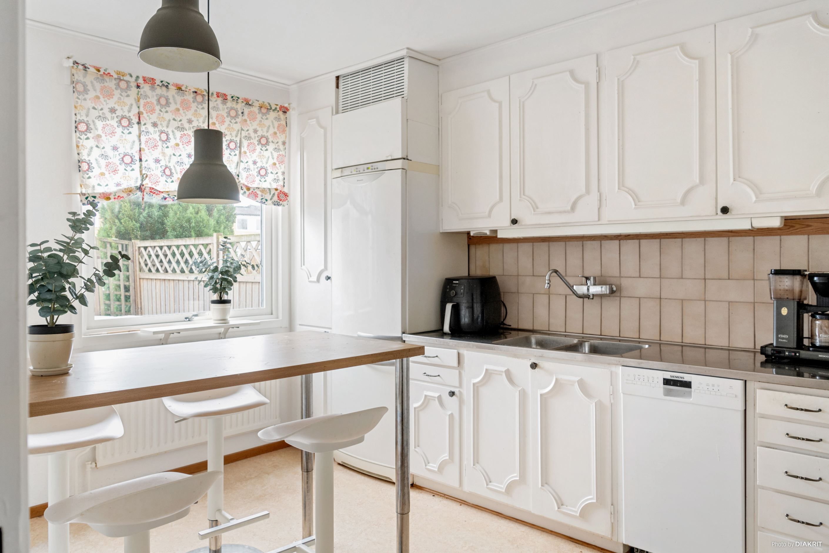 Köket ligger i anslutning till hallen och har en praktisk arbetsyta samt plats för matbord.