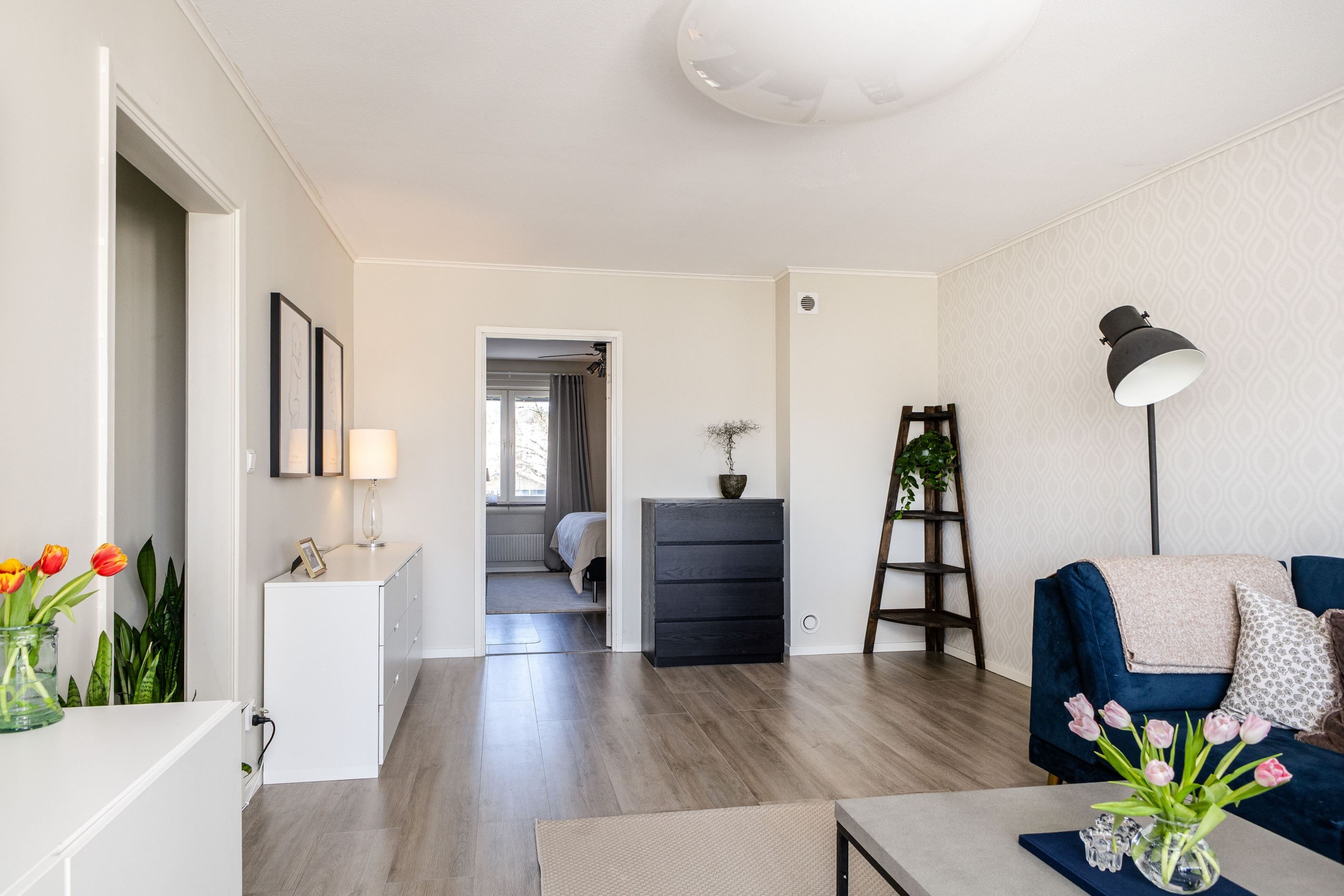 En trappa upp erbjuds en mycket välplanerad trea om generösa 86,5 kvm - ett hem att trivas i från första stund. För den som önskar ytterligare ett sovrum finns dessutom möjlighet att enkelt dela av det större sovrummet med eleganta pardörrar.