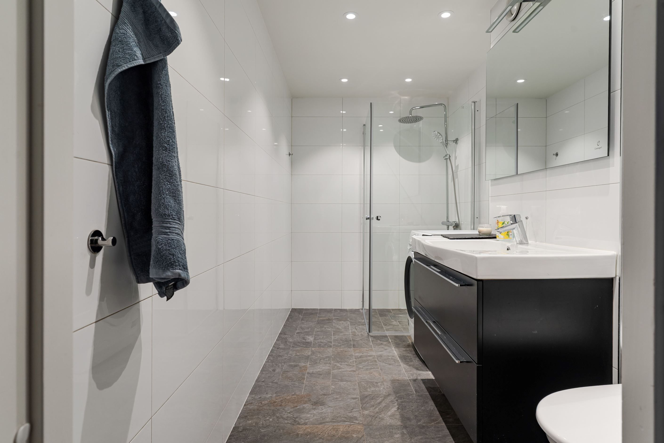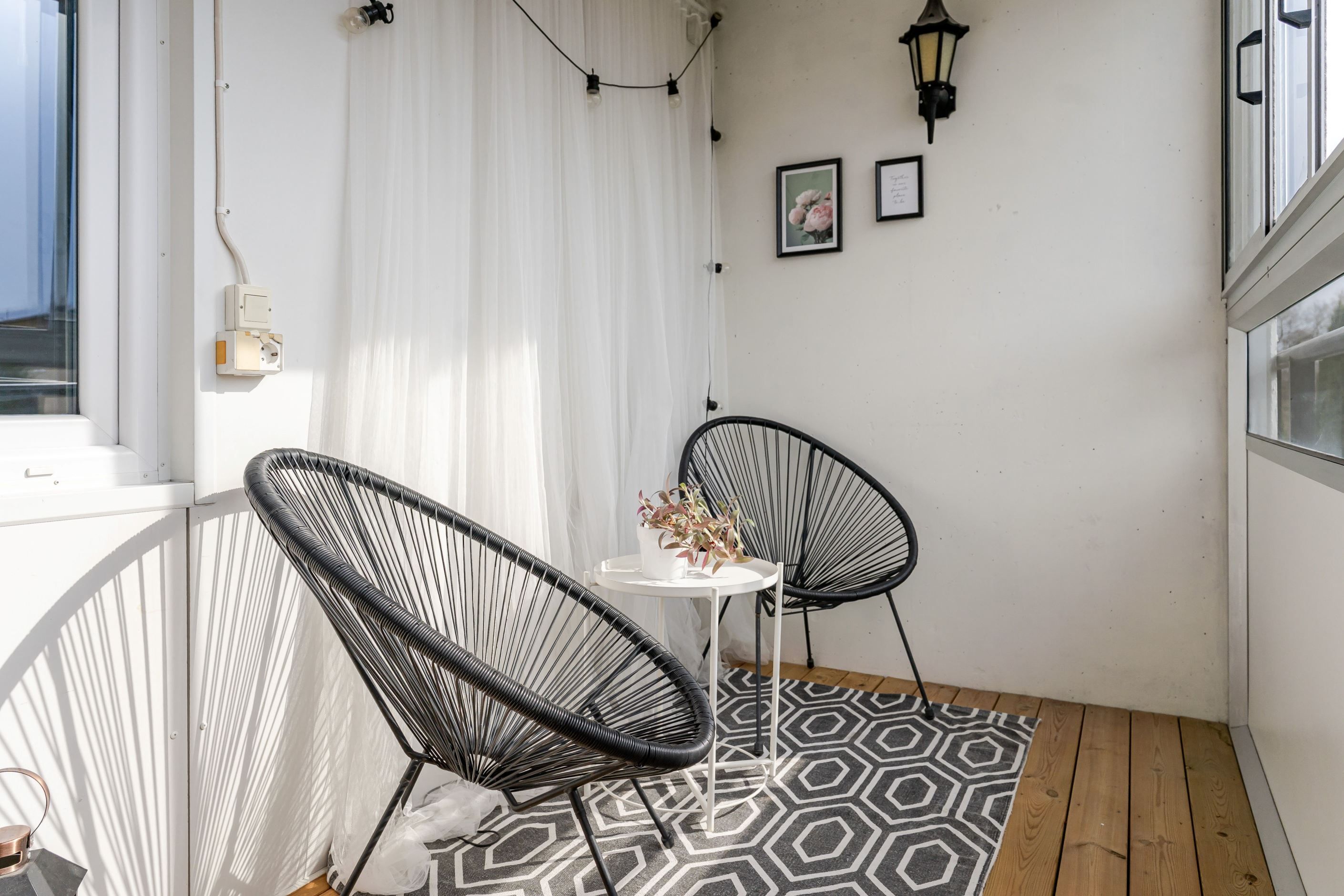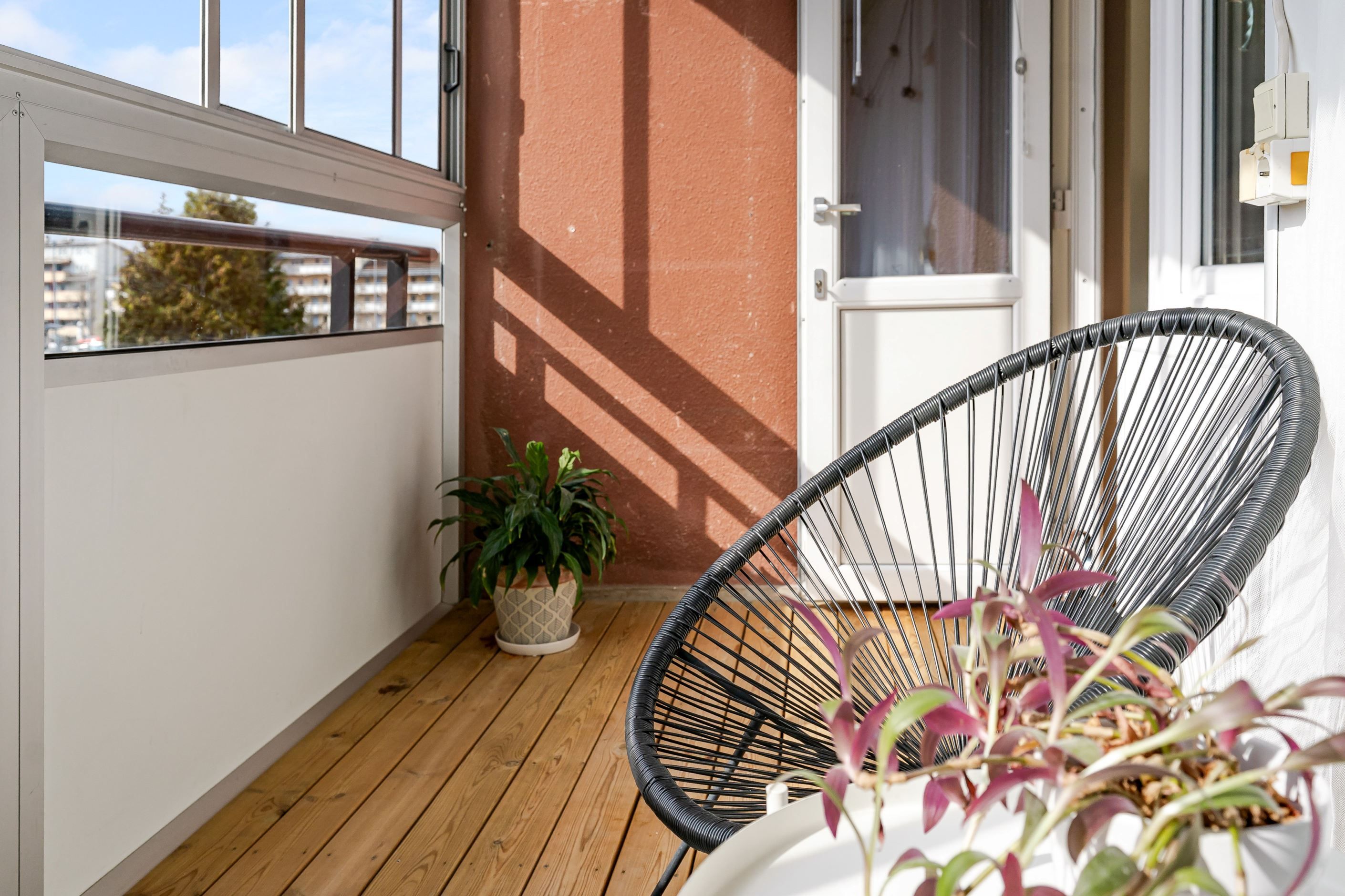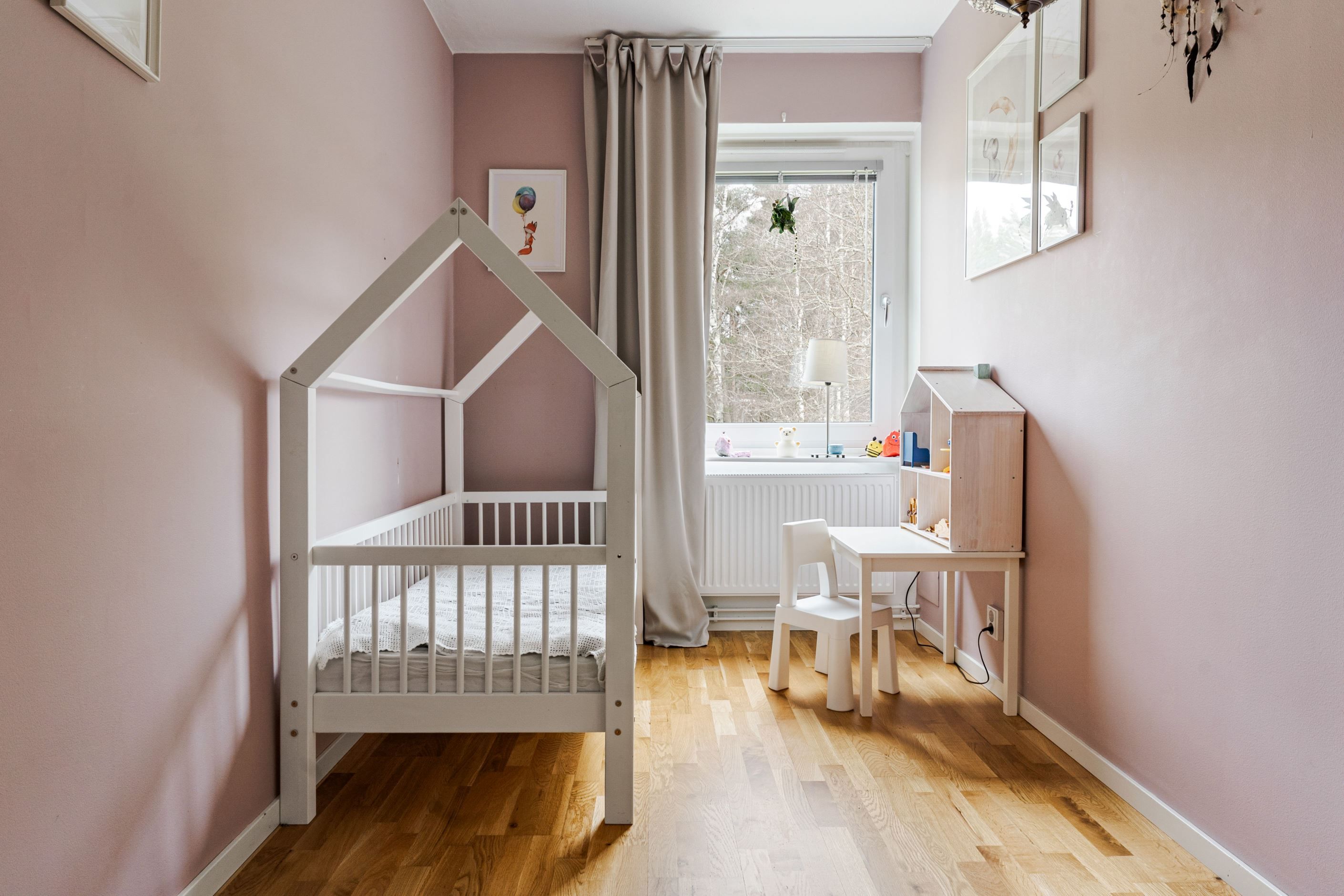 Den rymliga hallen öppnar upp mot bostadens sociala ytor där en vägg tagits bort för att skapa en härlig öppen planlösning mellan kök och hall – perfekt för både vardag och umgänge. Vardagsrummet vetter mot den lugna bakgården med utsikt över grönområde och skogsparti, och de stora fönsterpartierna ramar in utsikten som en levande tavla. Här finns även ett charmigt barnrum i mjuka rosa toner och ett rogivande kontor i grönt. Badrummet är stilrent med vitkaklade väggar, gråmelerat klinkergolv, duschhörna och egen tvättmaskin. Köket är rymligt och praktiskt med gott om arbetsytor, och det avskilda master bedroom erbjuder en lugn plats att dra sig tillbaka till – dessutom med utgång till en mysig inglasad balkong.