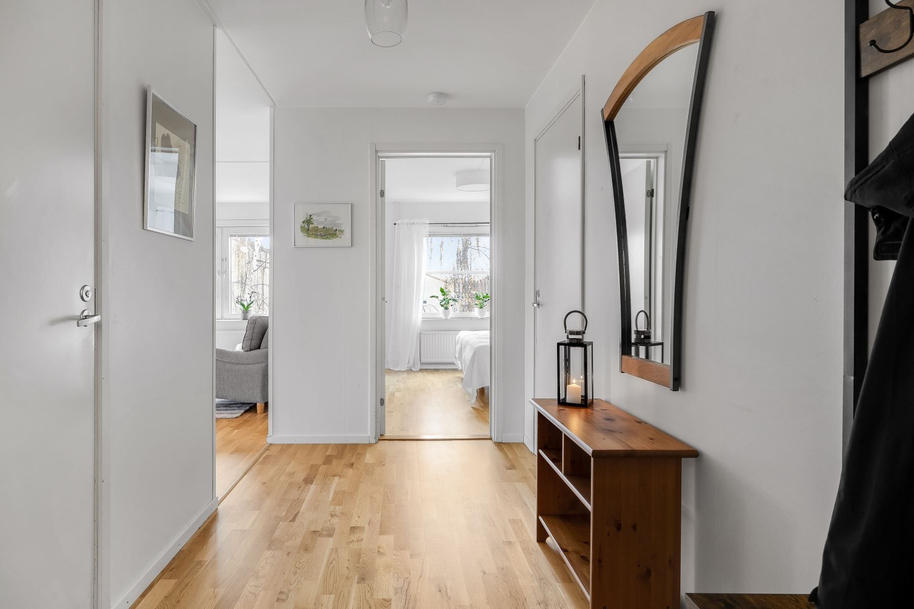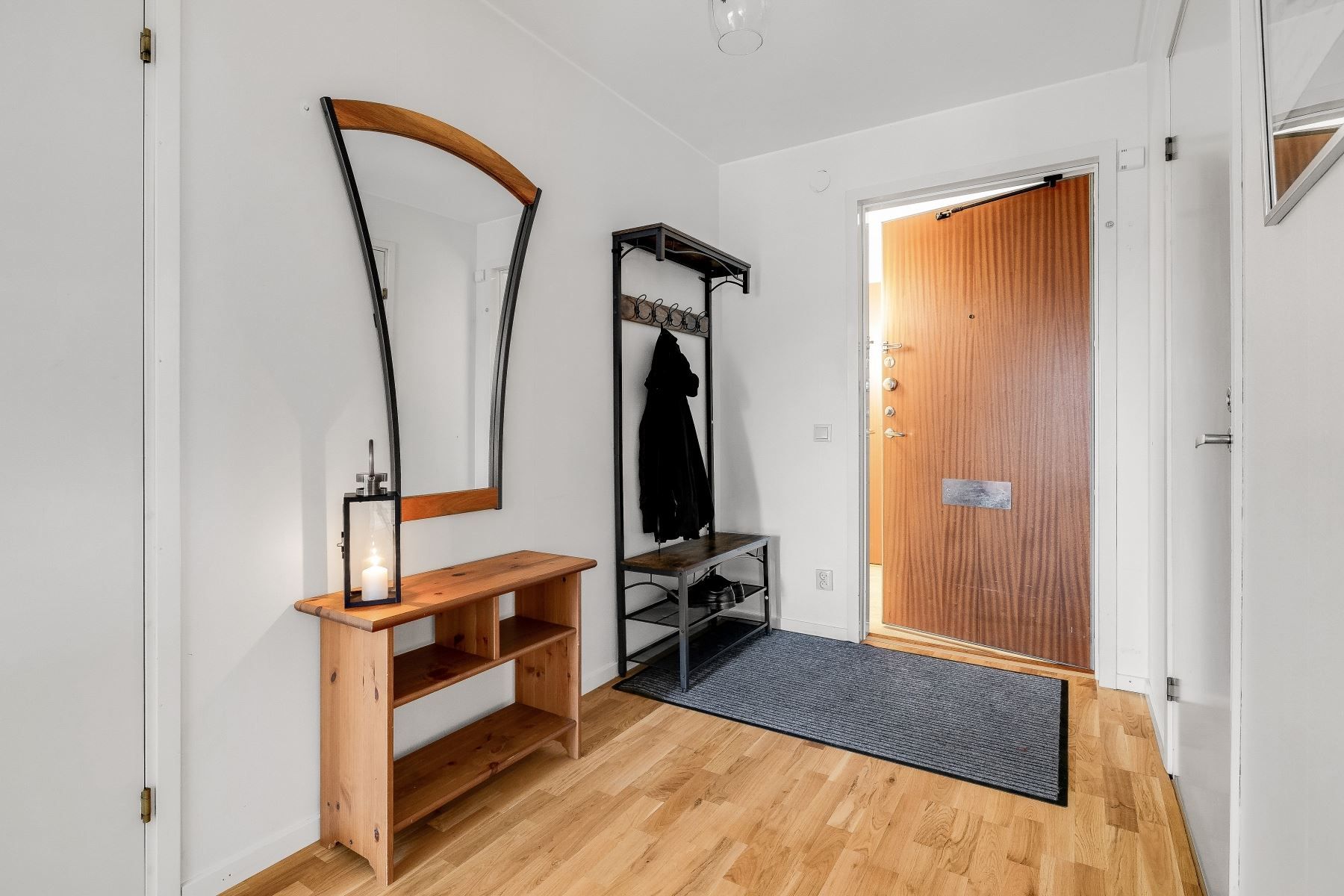 Inne i bostaden möts du av en välkomnande hall med gott om plats för avhängning. Här finns dessutom en stor klädkammare/förråd, perfekt för att organisera kläder, skor och allt du vill ha lättillgängligt men undanstuvat. Det finns även utrymme för barnvagn, rollator eller permobil.