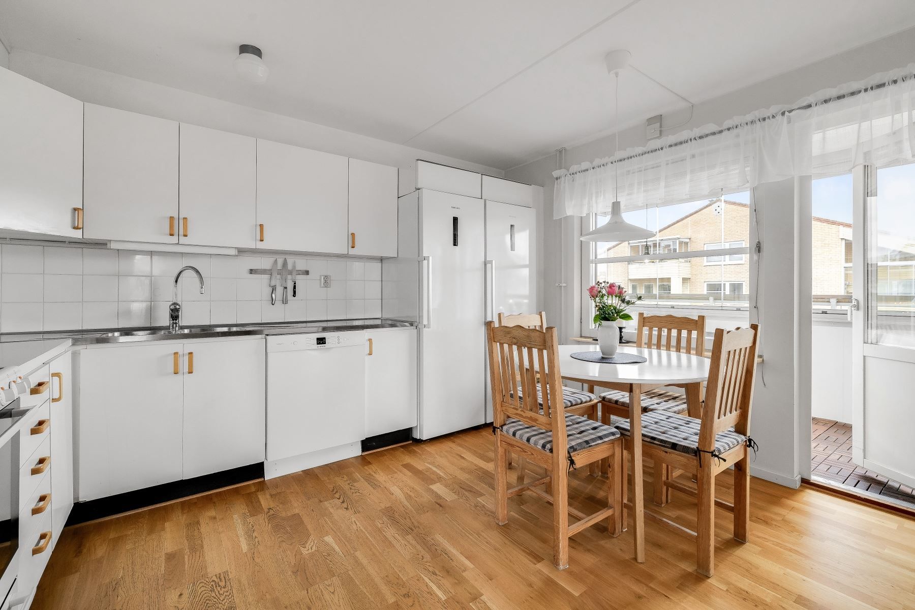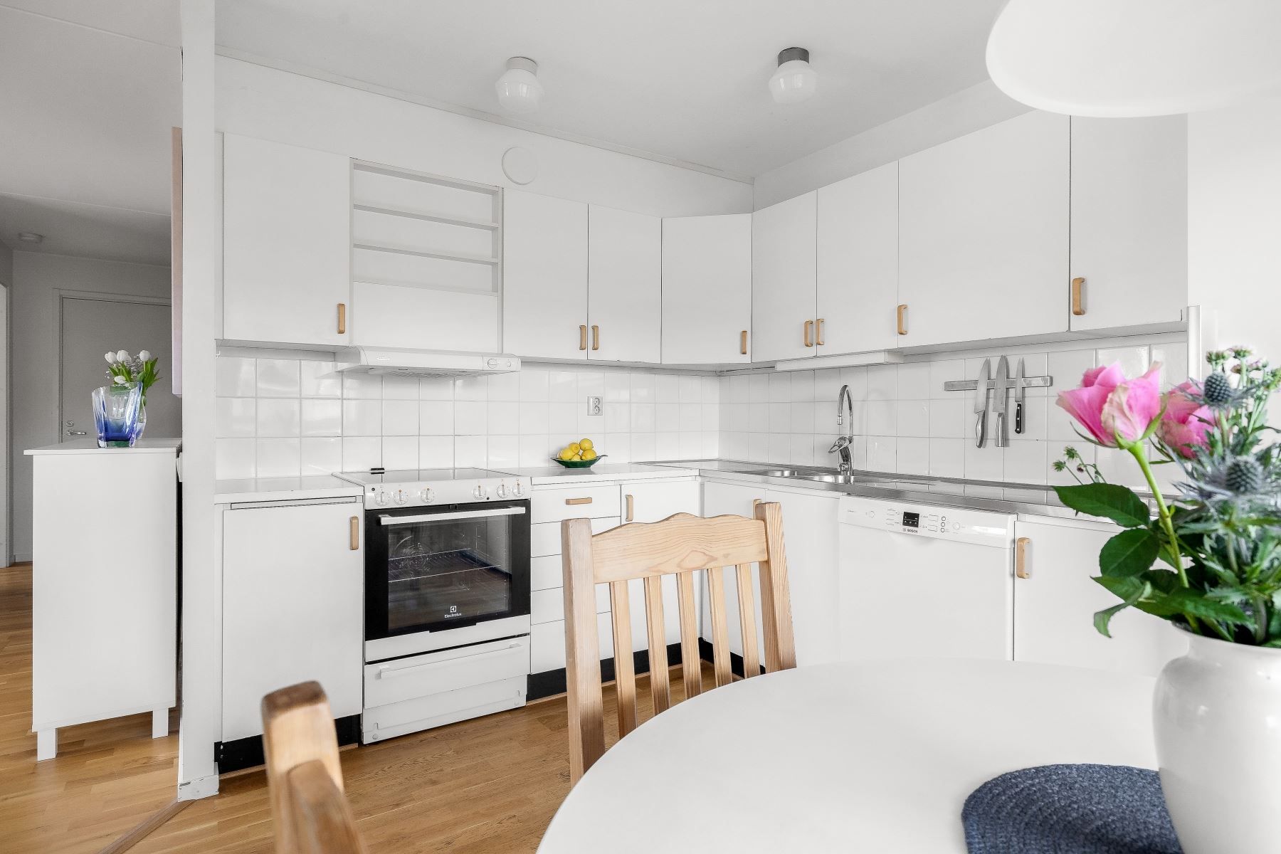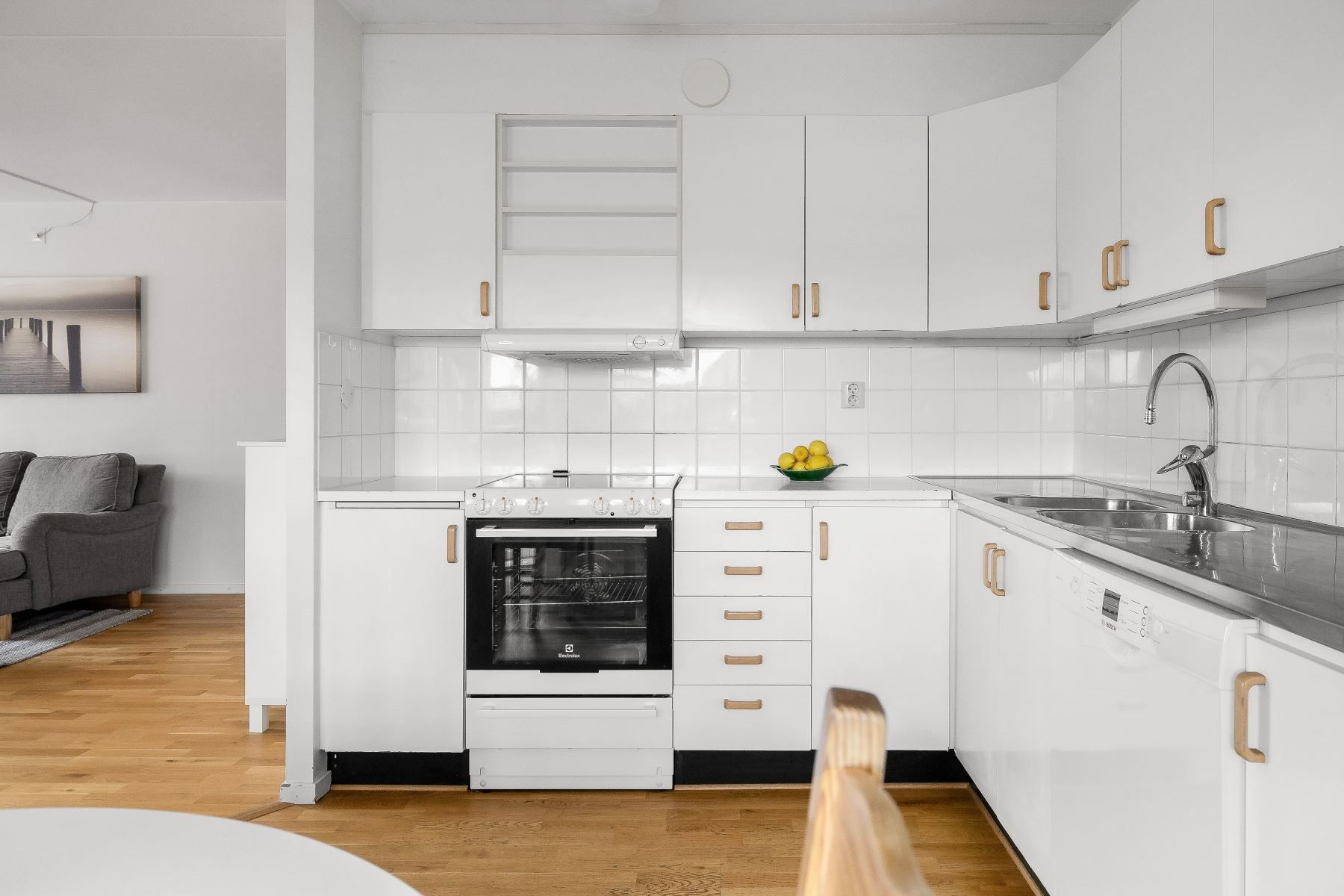 Köket är både funktionellt och inbjudande, med fullstor kyl och frys, spis med ugn, fläkt, diskmaskin, gott om förvaring och bra arbetsytor. Här finns även plats för matbord där familj och vänner kan samlas. Från köket kliver du ut på den inglasade balkongen, som vetter mot lugna omgivningar och bjuder på fin utsikt.