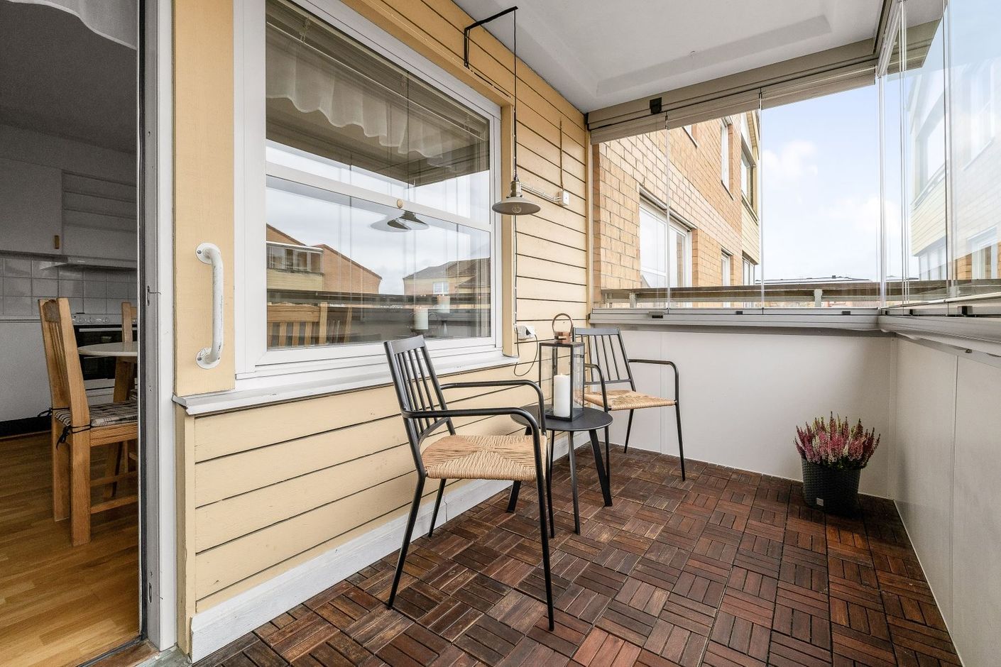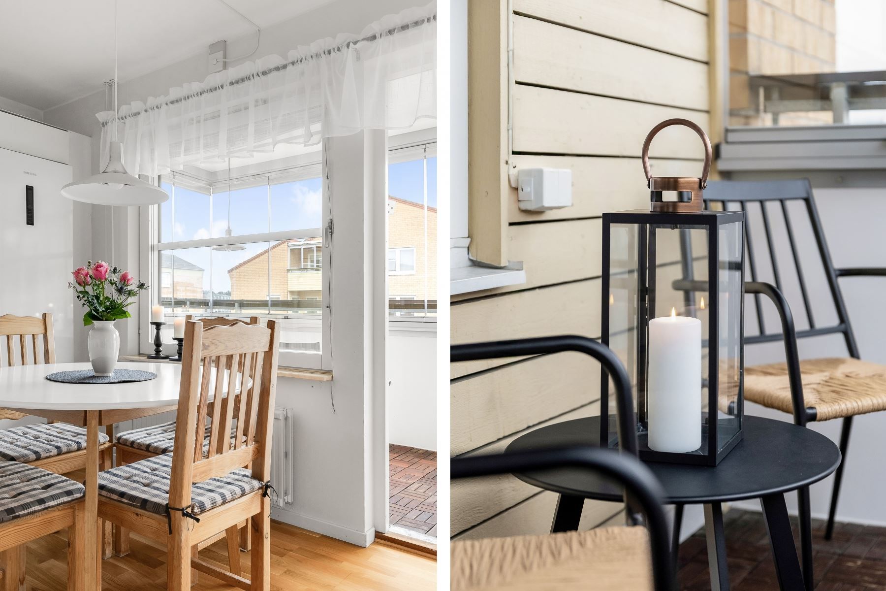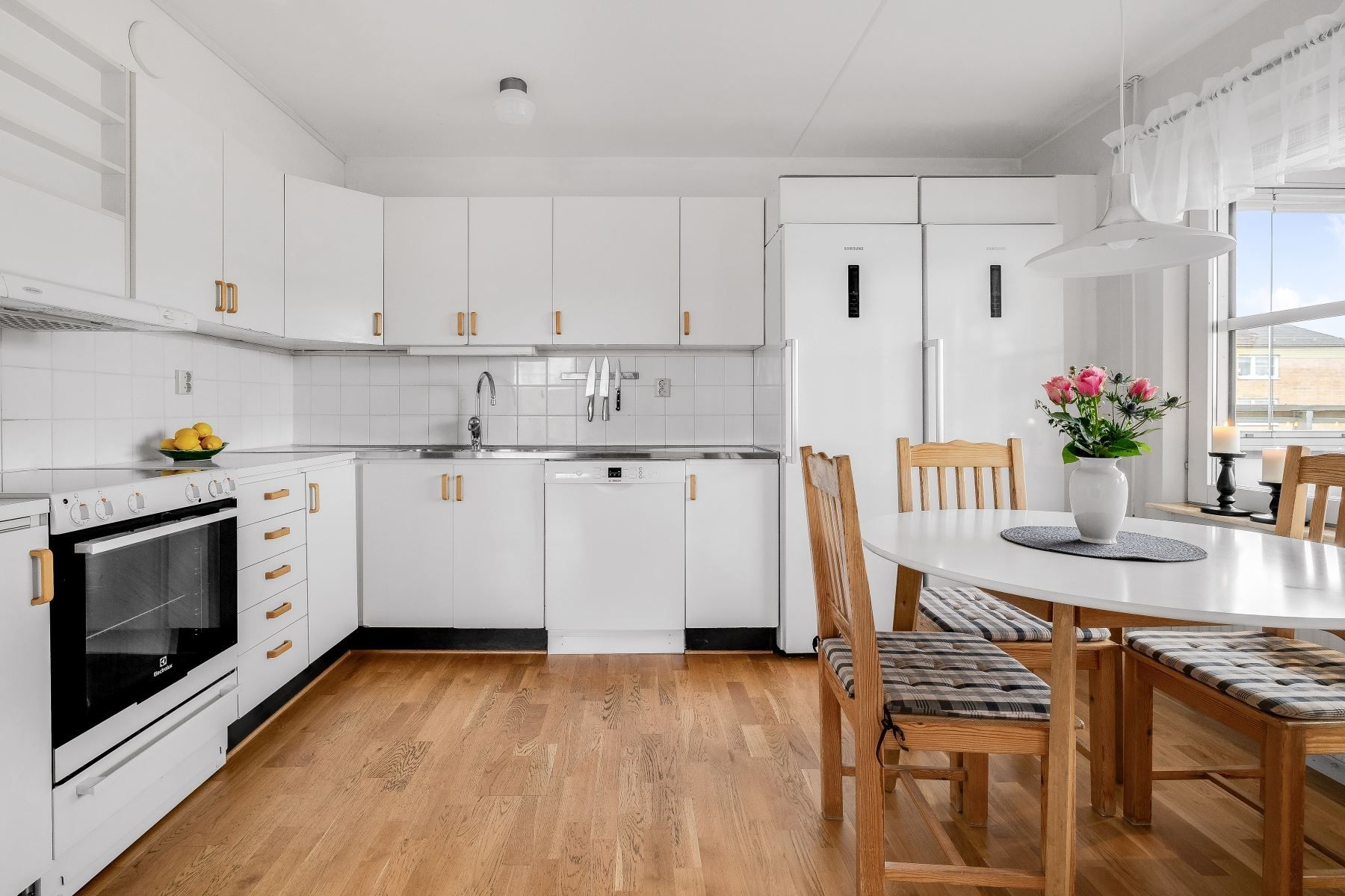 Köket är både funktionellt och inbjudande, med fullstor kyl och frys, spis med ugn, fläkt, diskmaskin, gott om förvaring och bra arbetsytor. Här finns även plats för matbord där familj och vänner kan samlas. Från köket kliver du ut på den inglasade balkongen, som vetter mot lugna omgivningar och bjuder på fin utsikt.