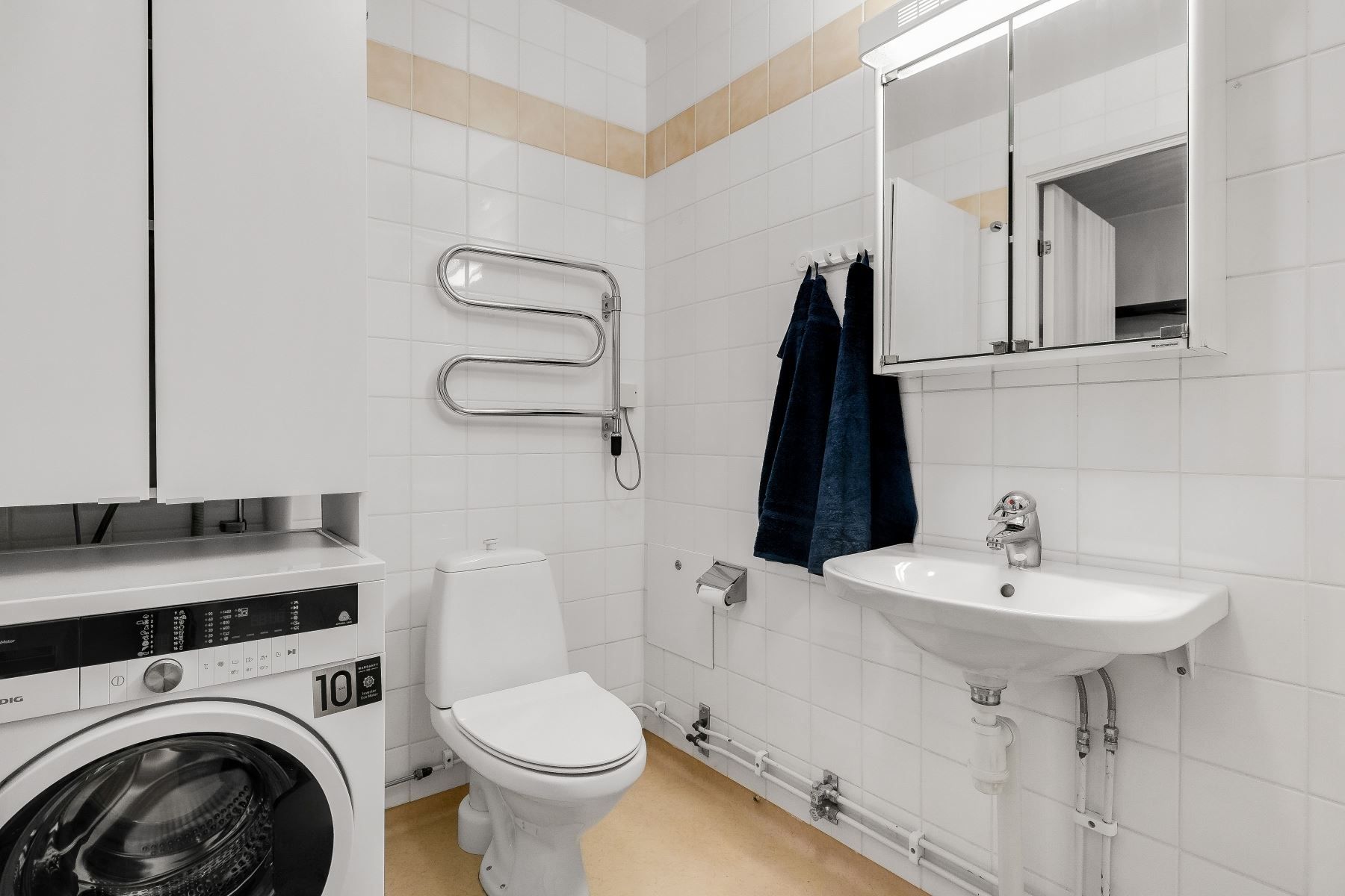 Till vänster i hallen finns badrummet som är utrustat med wc, handfat, spegelskåp med förvaring, handdukstork samt duschhörna. För den som vill går det utmärkt att installera ett badkar. Här finns även en tvättmaskin som är mycket sparsamt använd.. Föreningen erbjuder en närliggande välutrustad tvättstuga med gott om lediga tvättider.