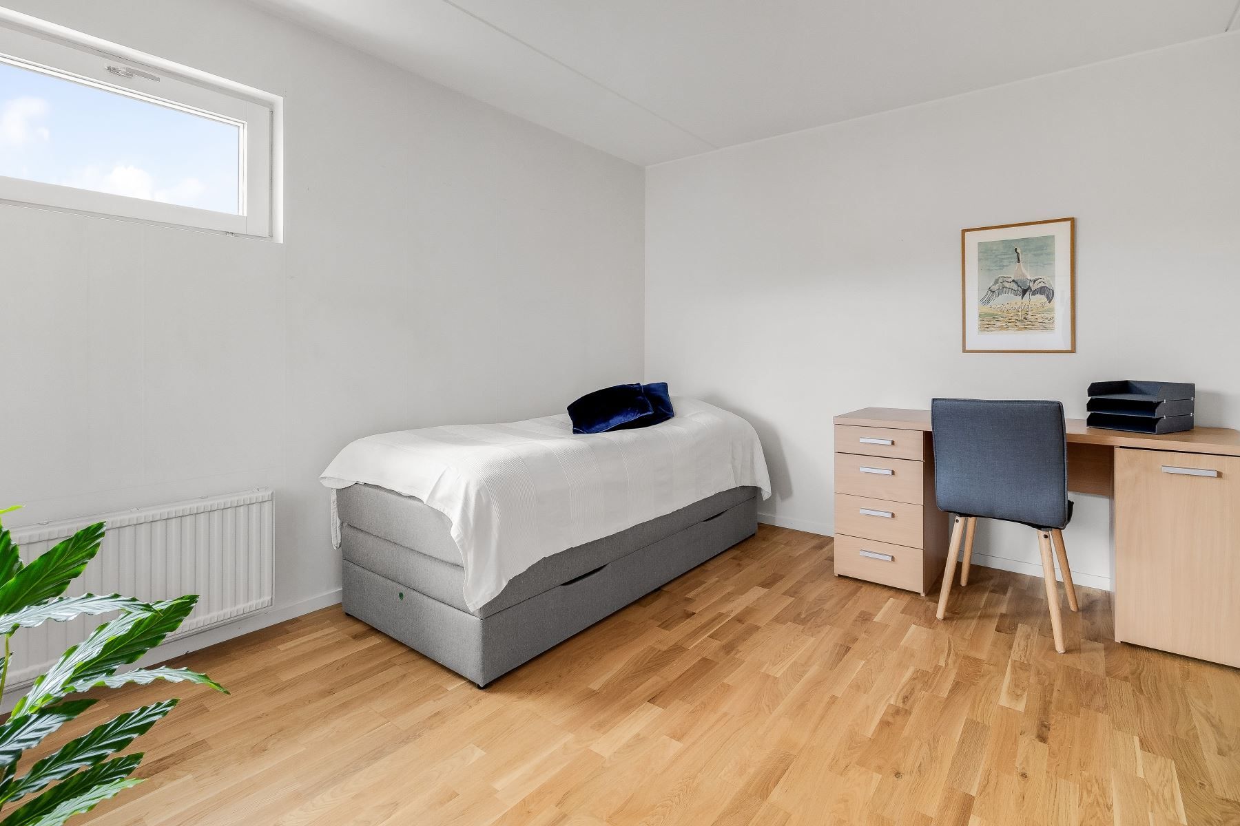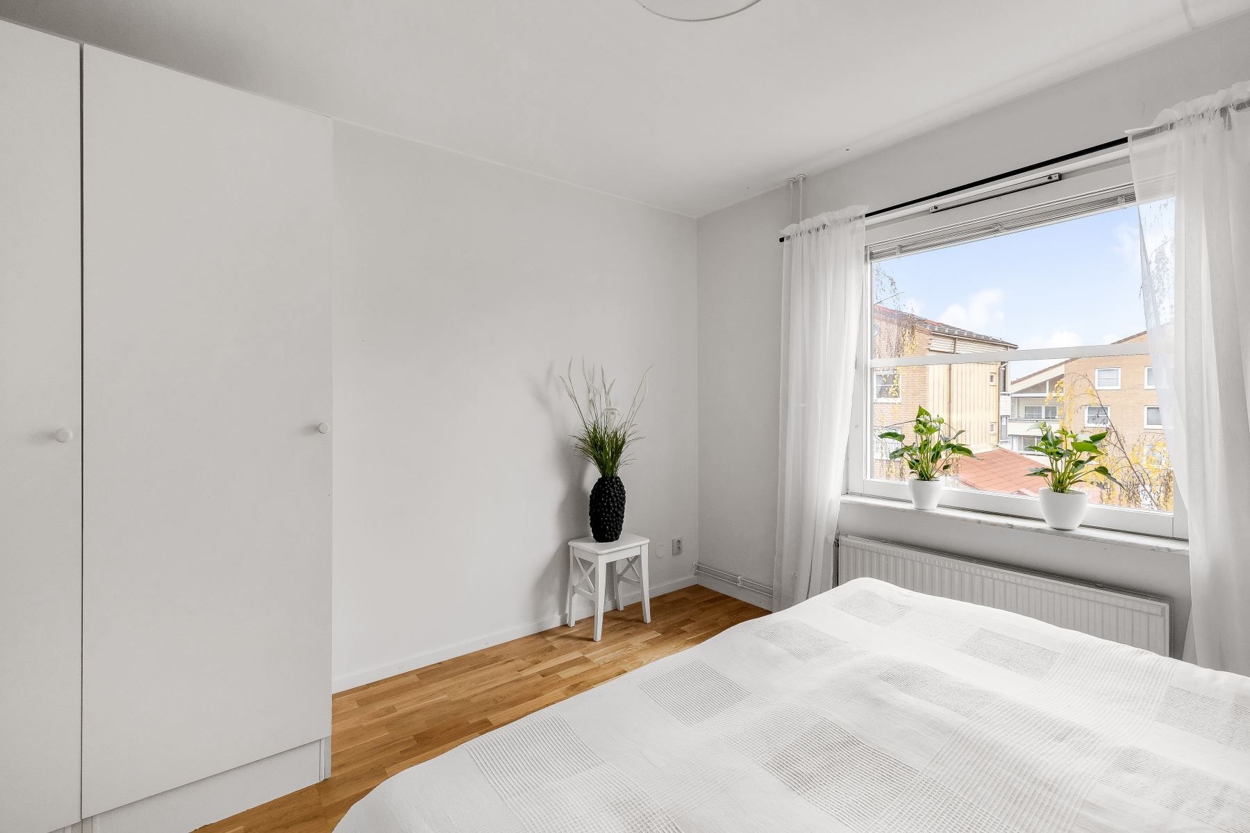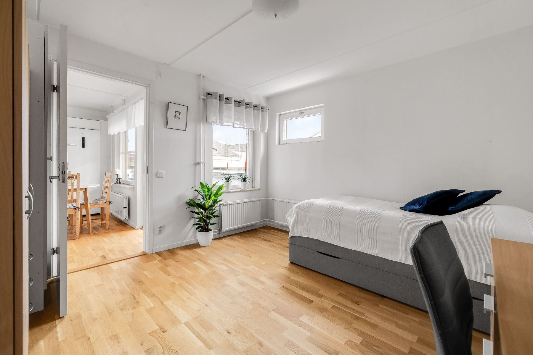 Det andra sovrummet, som nås via köket, passar utmärkt som barnrum, gästrum eller arbetsrum – även här finns garderober för praktisk förvaring.