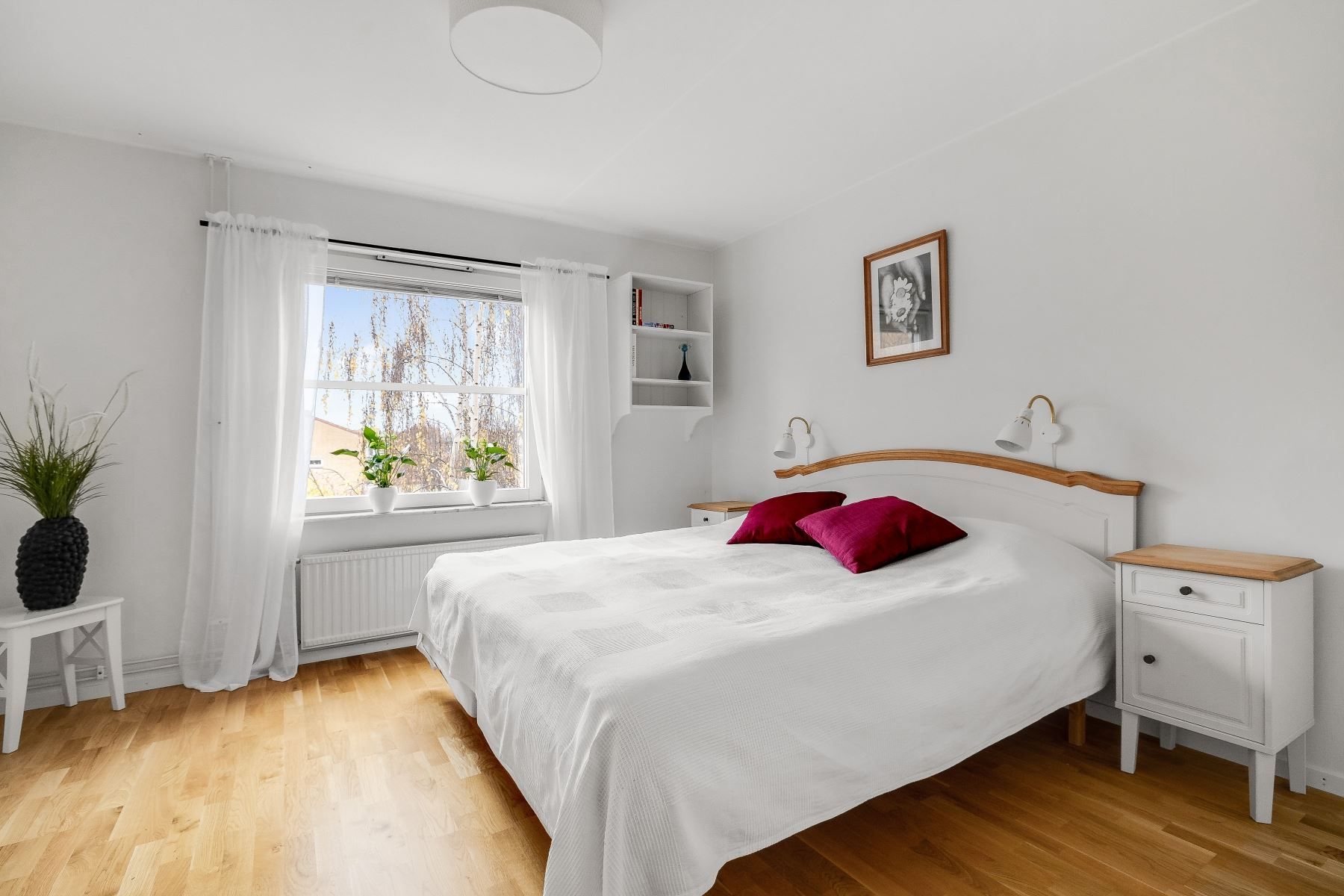 Vidare in i bostaden når man det större av bostadens två sovrum – master bedroom – här finns bra yta för dubbelsäng och annan möblering. Garderober ger god förvaring.