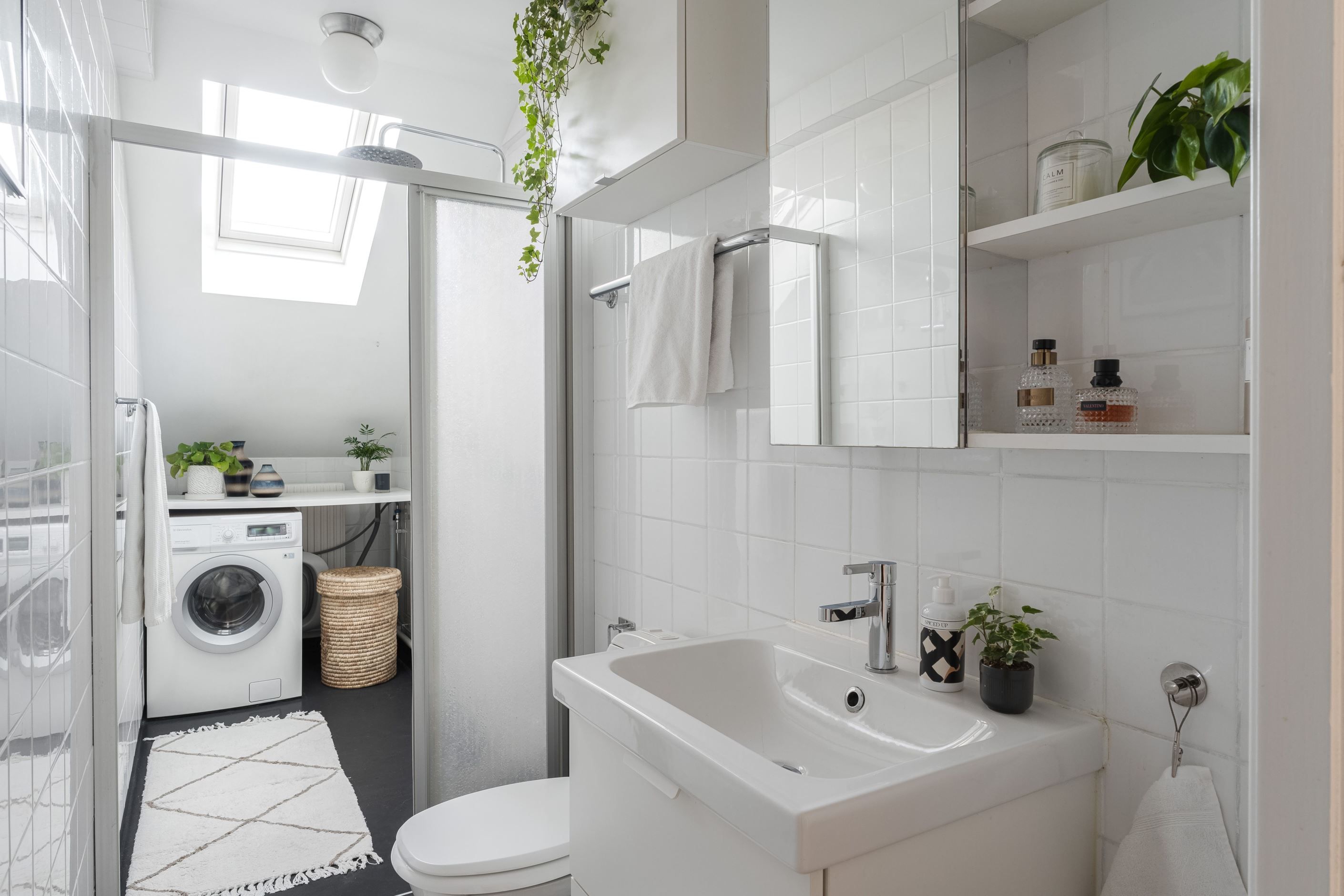 Stort kaklat badrum med takfönster. Här finns både dusch och kombimaskin.