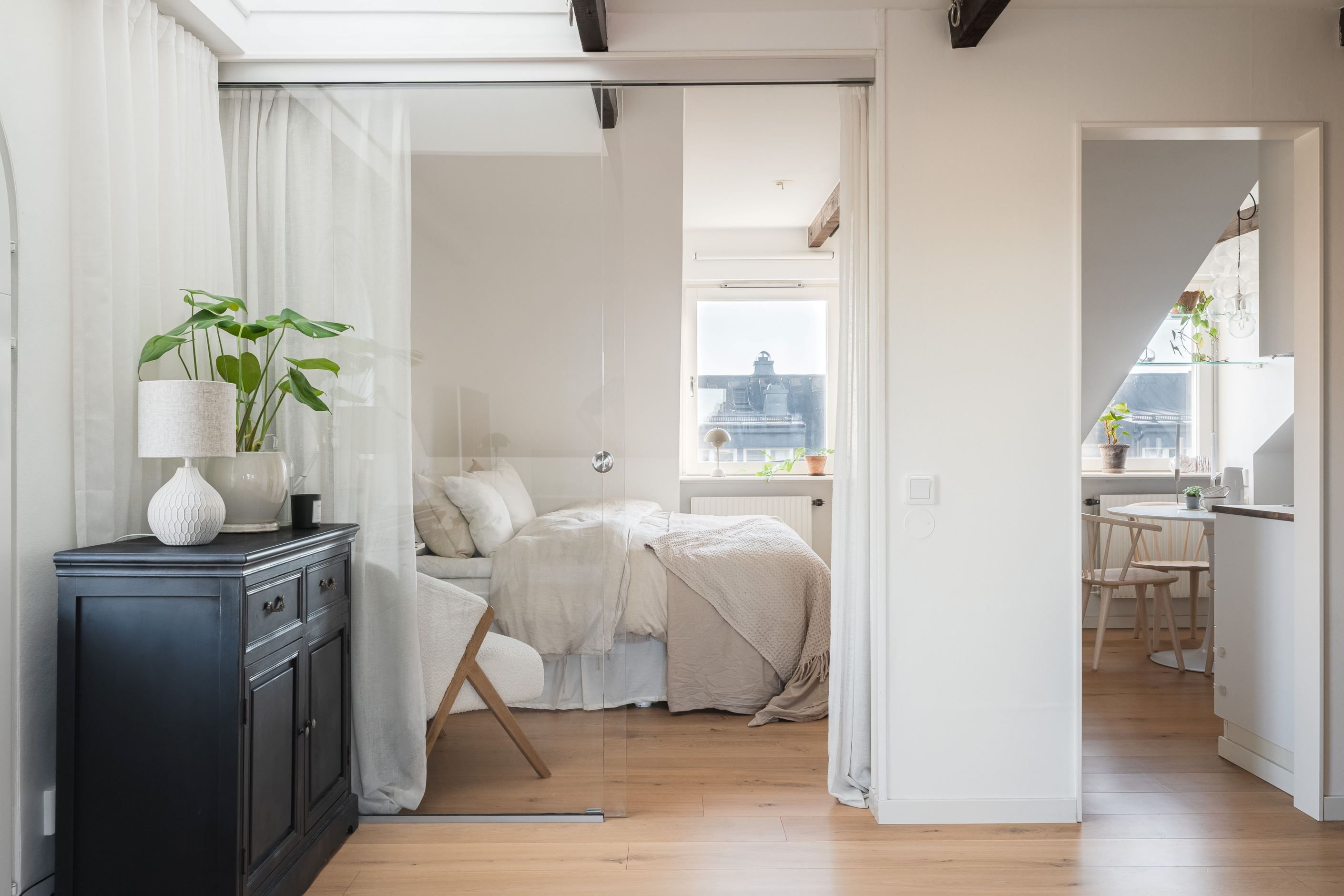 I anslutning till vardagsrummet når man det mysiga sovrummet bakom en läcker glasvägg. Här finns plats för dubbelsäng och sängbord.