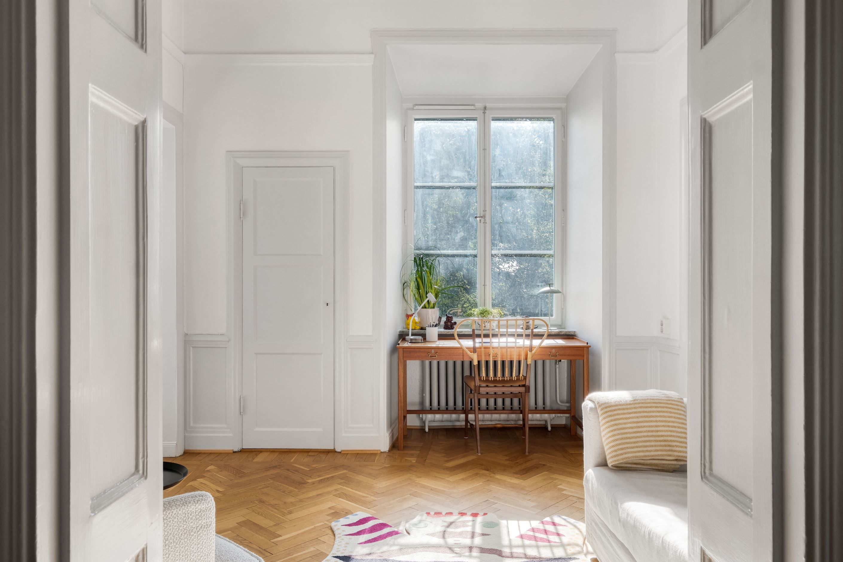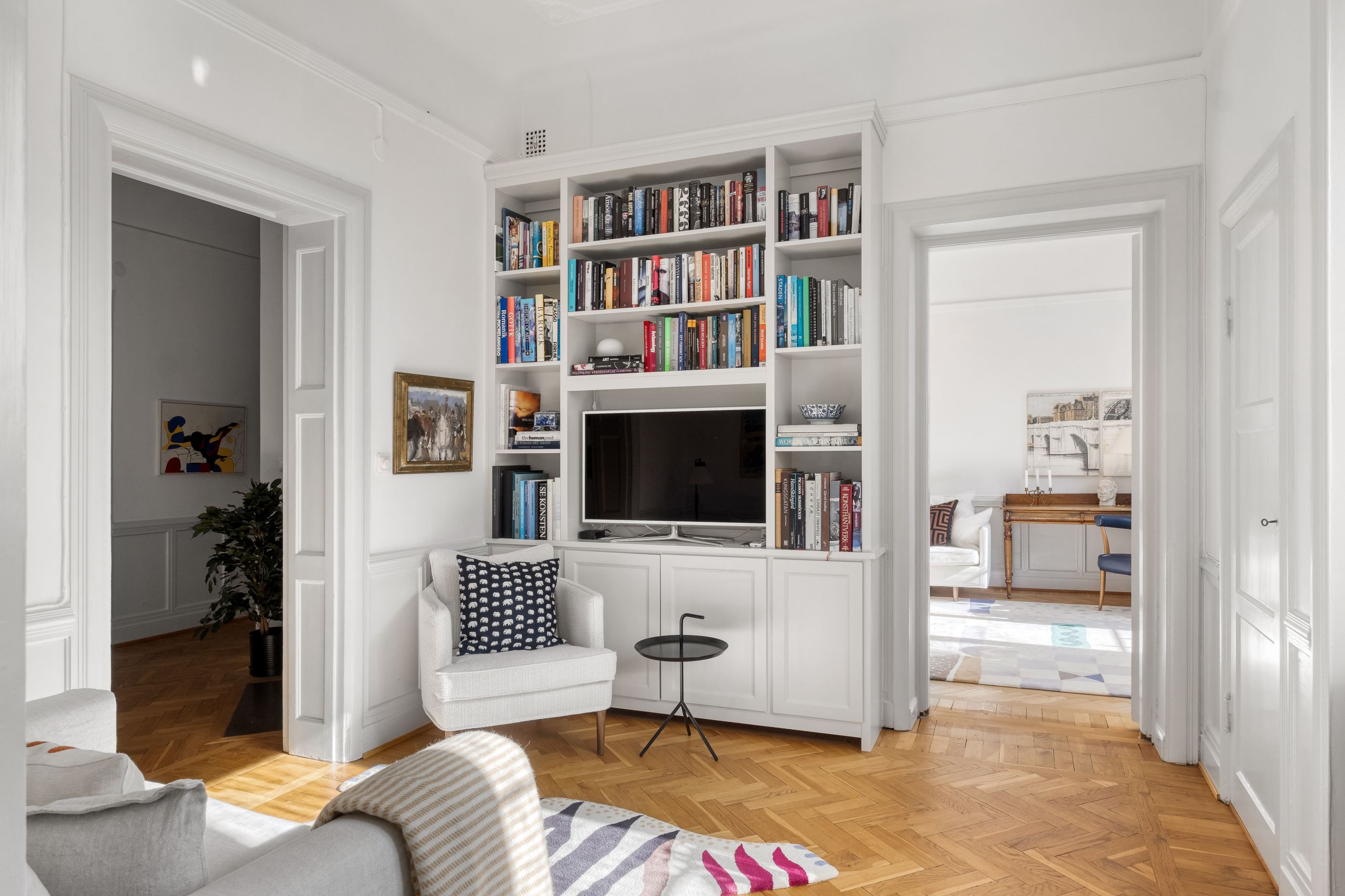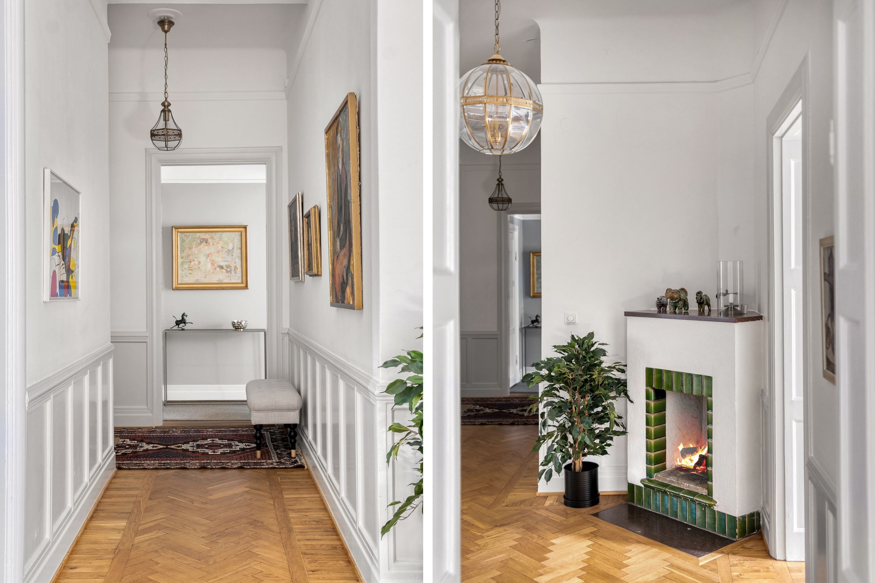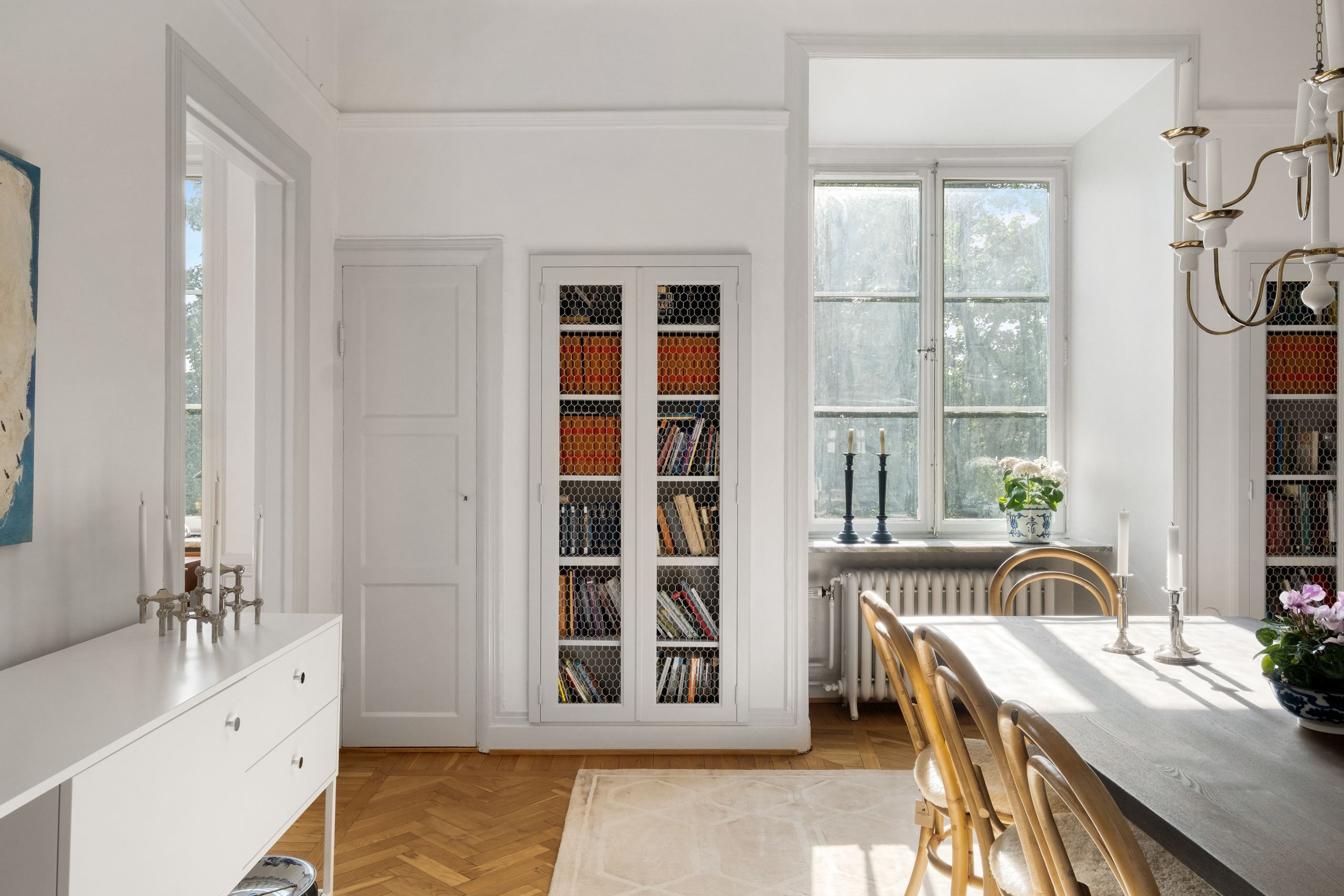 Bostaden är belägen högt upp i huset och bjuder på två fungerande öppna spisar, två badrum samt gäst-wc – perfekt för både vardag och festliga tillfällen. De generösa sällskapsytorna ramas in av tidstypiska detaljer såsom vackra stuckaturer, takutsmyckningar, speglade dörrar, djupa fönsternischer, höga golvsocklar och spröjsade fönster. Genomgående löper en elegant fiskbensparkett som förhöjer den klassiska atmosfären. Platsbyggda bokhyllor erbjuder både stil och smart förvaring.