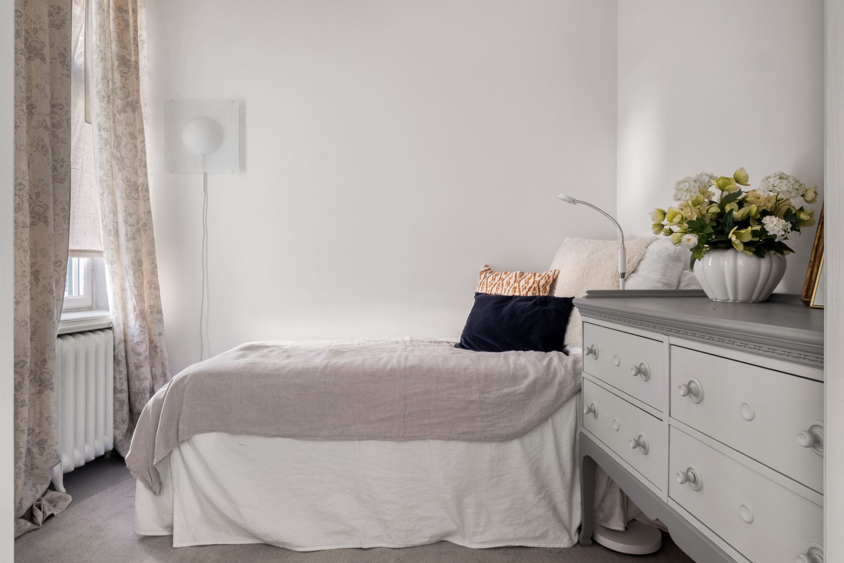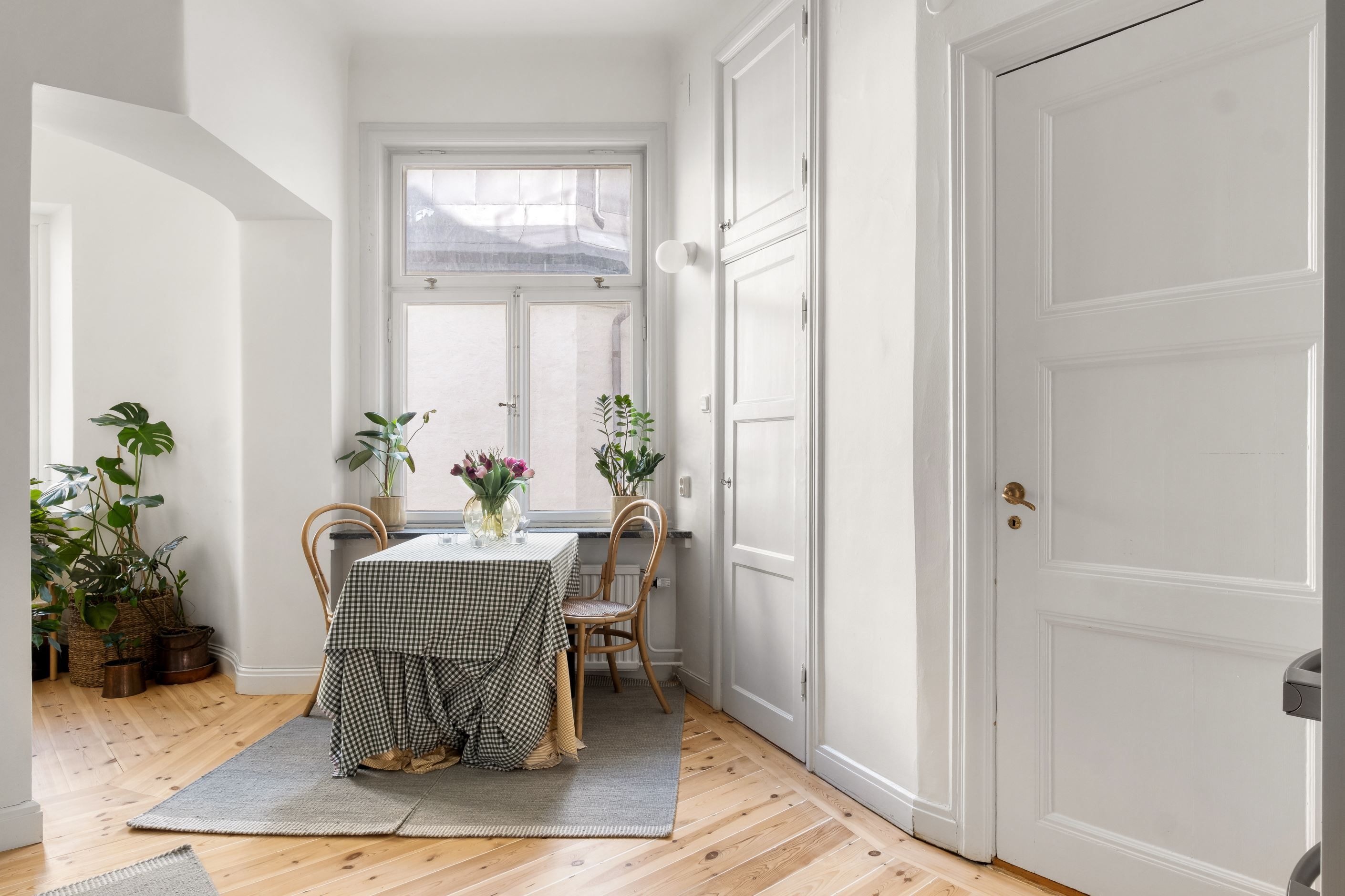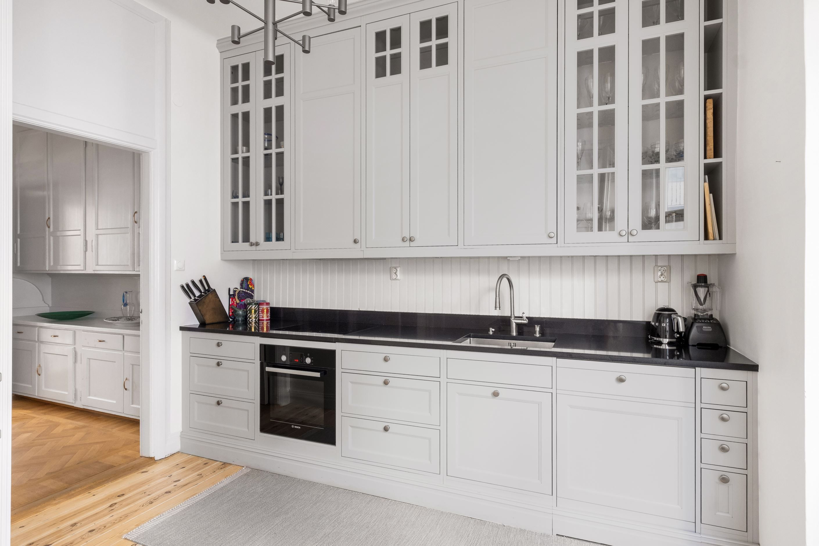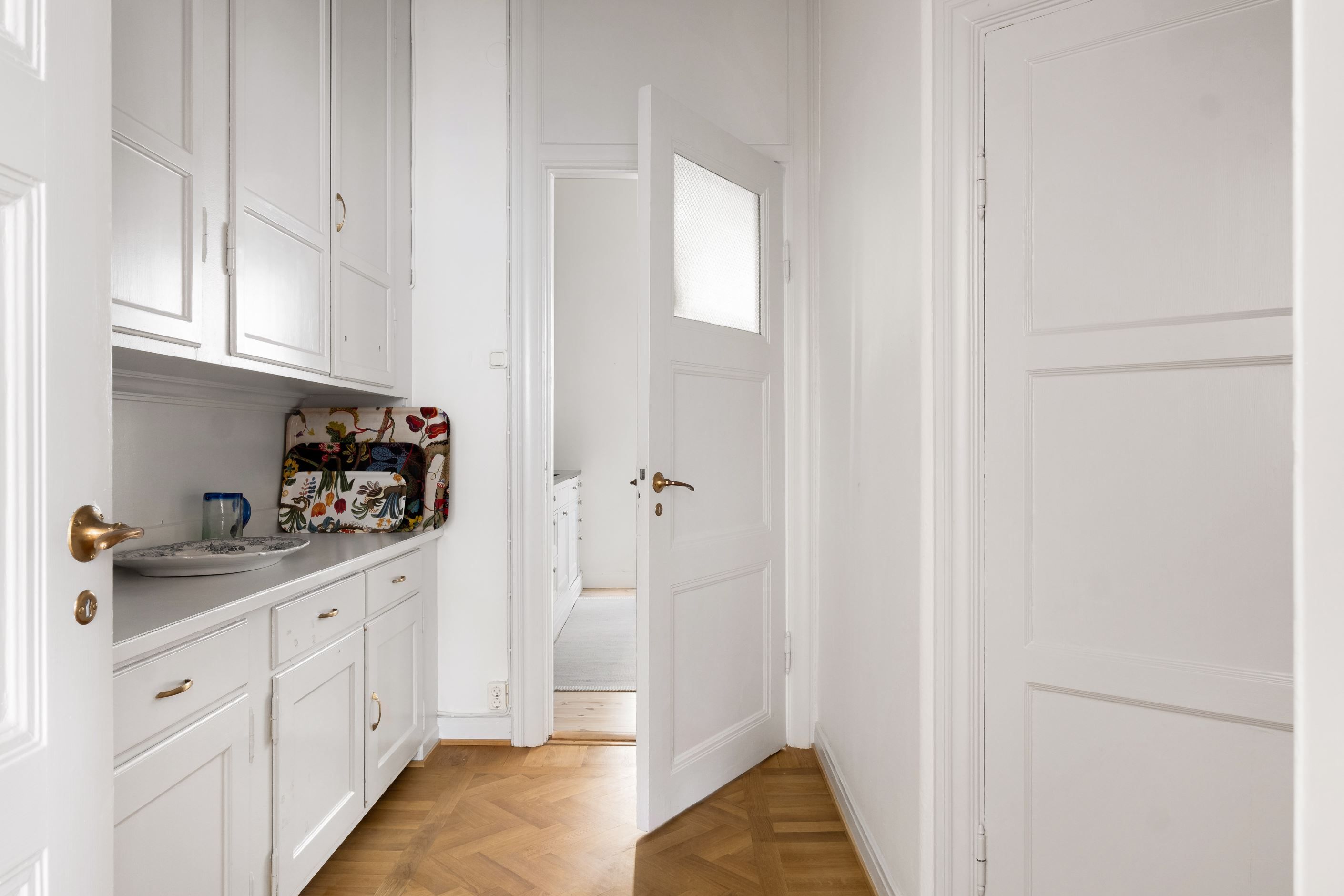 Bostaden är belägen högt upp i huset och bjuder på två fungerande öppna spisar, två badrum samt gäst-wc – perfekt för både vardag och festliga tillfällen. De generösa sällskapsytorna ramas in av tidstypiska detaljer såsom vackra stuckaturer, takutsmyckningar, speglade dörrar, djupa fönsternischer, höga golvsocklar och spröjsade fönster. Genomgående löper en elegant fiskbensparkett som förhöjer den klassiska atmosfären. Platsbyggda bokhyllor erbjuder både stil och smart förvaring.