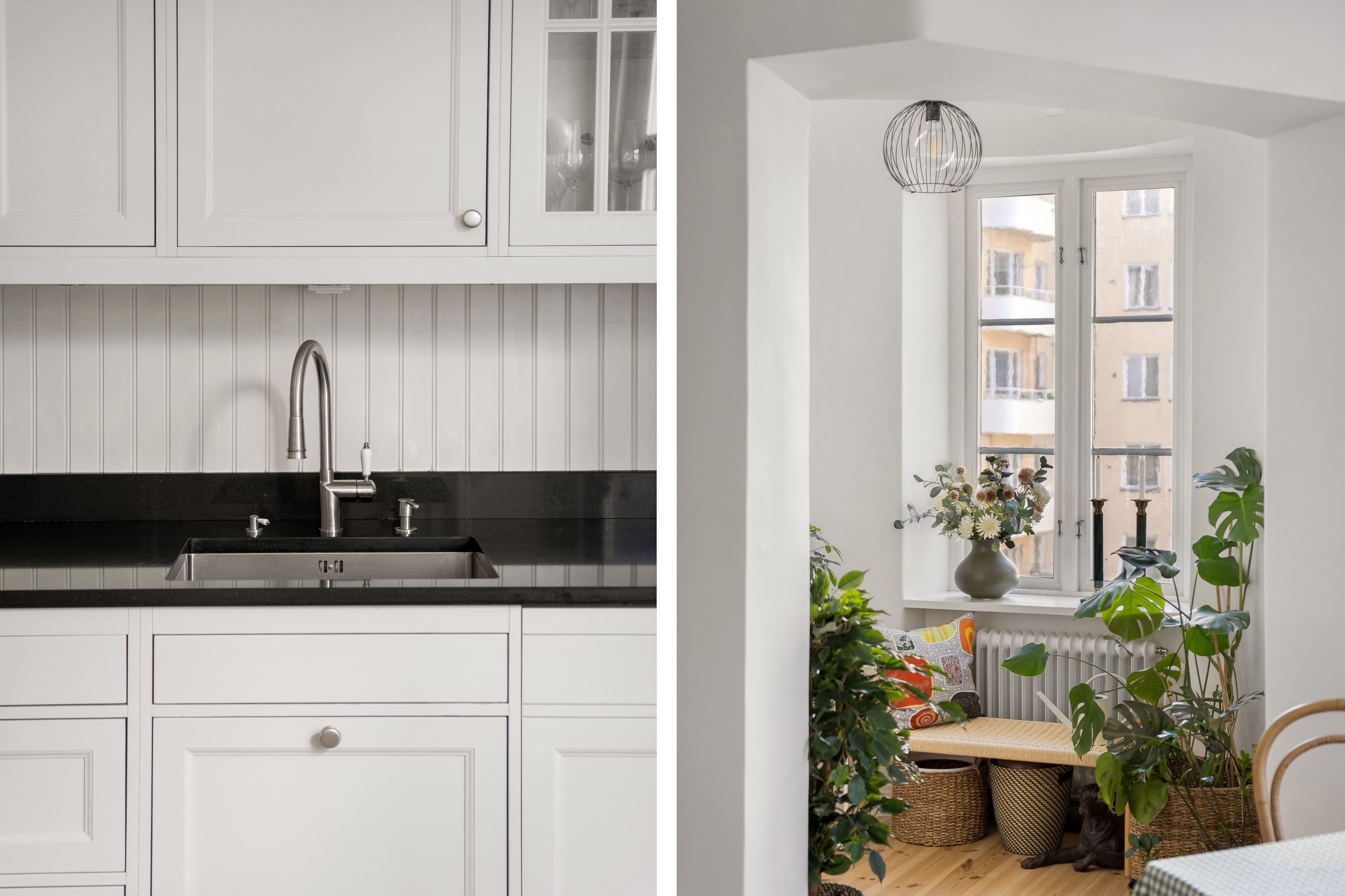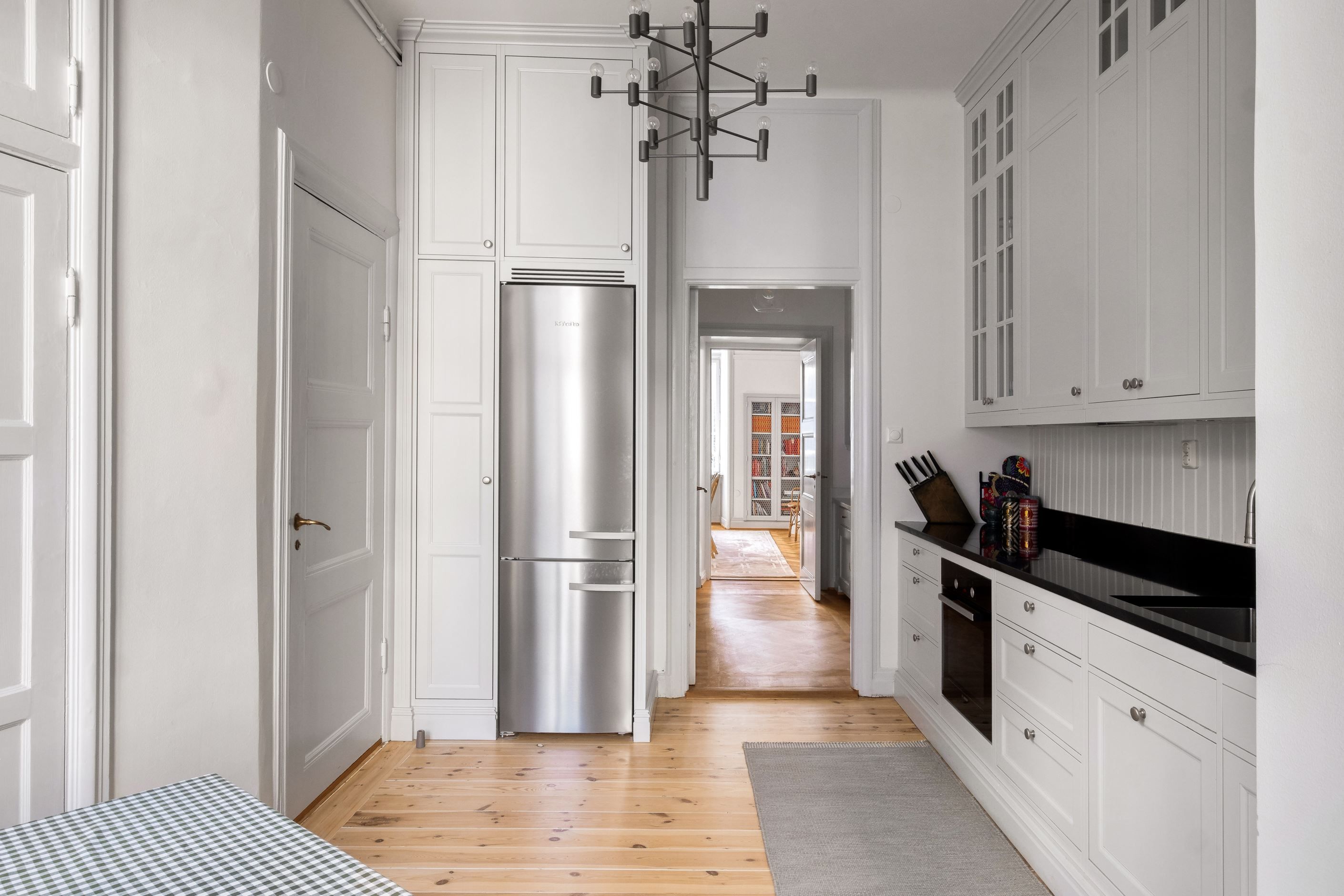 Köket är platsbyggt från Stockholmskök och kombinerar tidlös design med hög funktionalitet. Här finns gott om förvaring och arbetsyta – en dröm för den matlagningsintresserade.