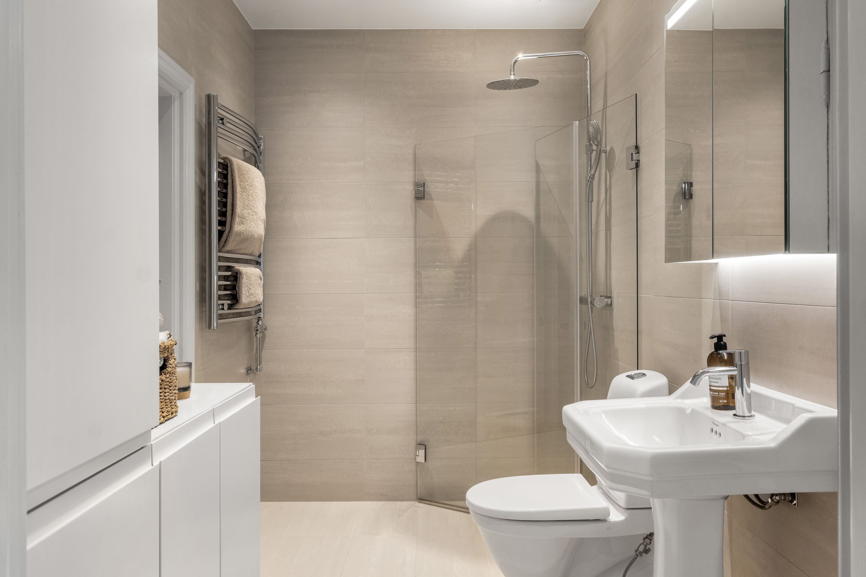 Bostaden präglas av sin luftiga känsla med högt i tak, stora sociala ytor och en planlösning som både är representativ och inbjudande.