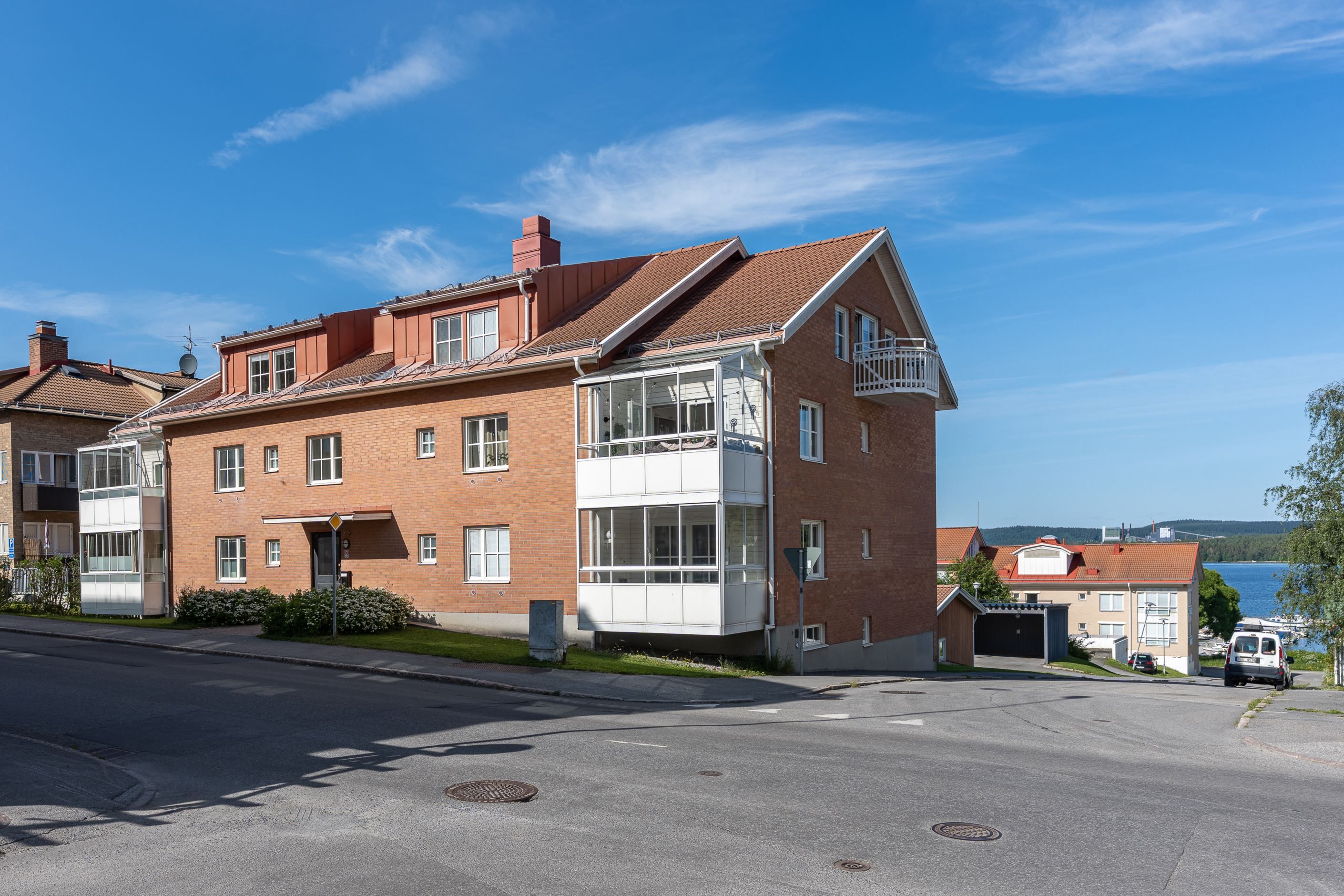 Lägenheten erbjuder ett luftigt allrum med plats för både soffgrupp och sängdel. Härifrån nås balkongen, där du kan njuta av utsikten mot Storsjön – en rogivande vy som förhöjer vardagen.