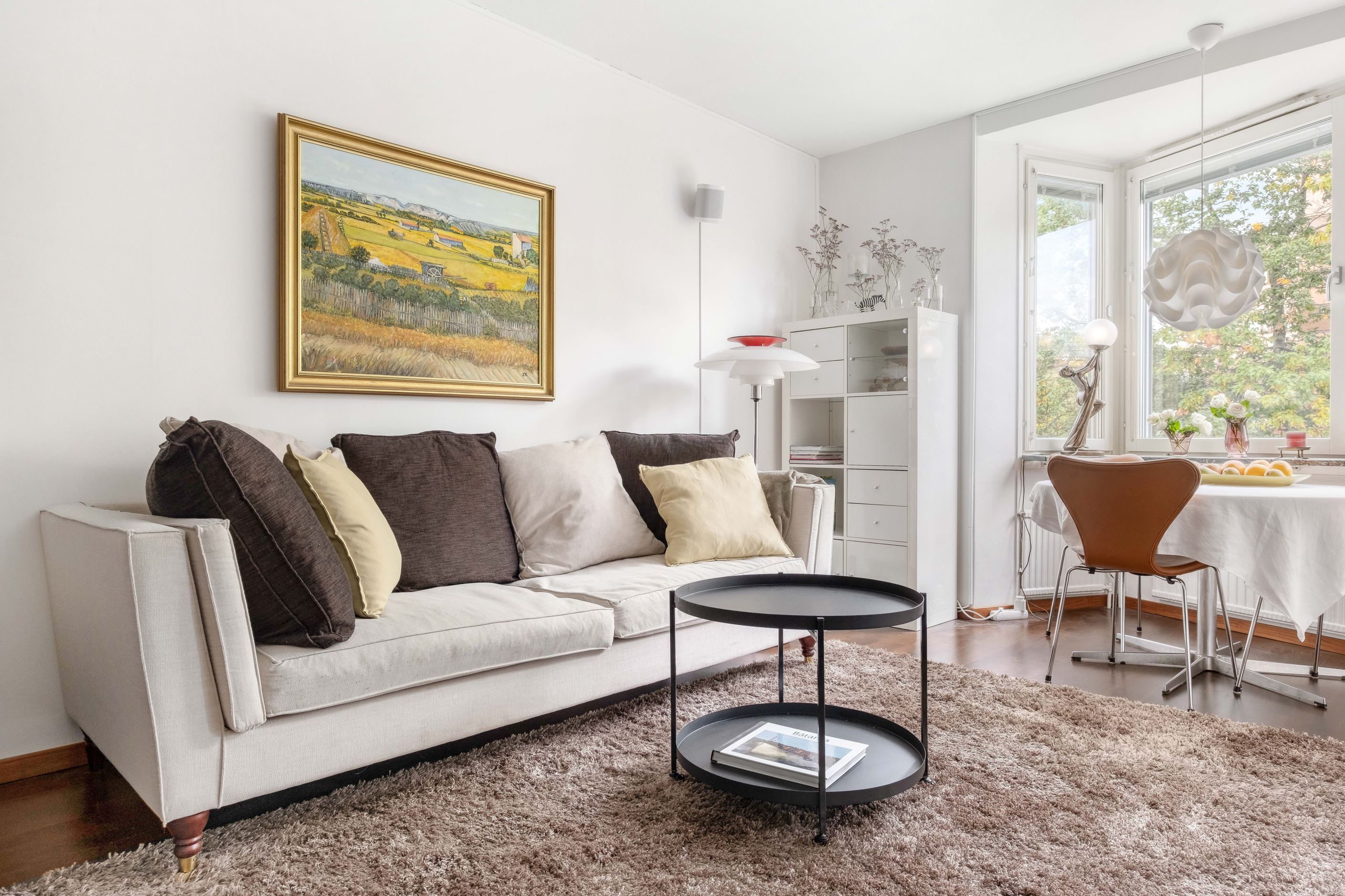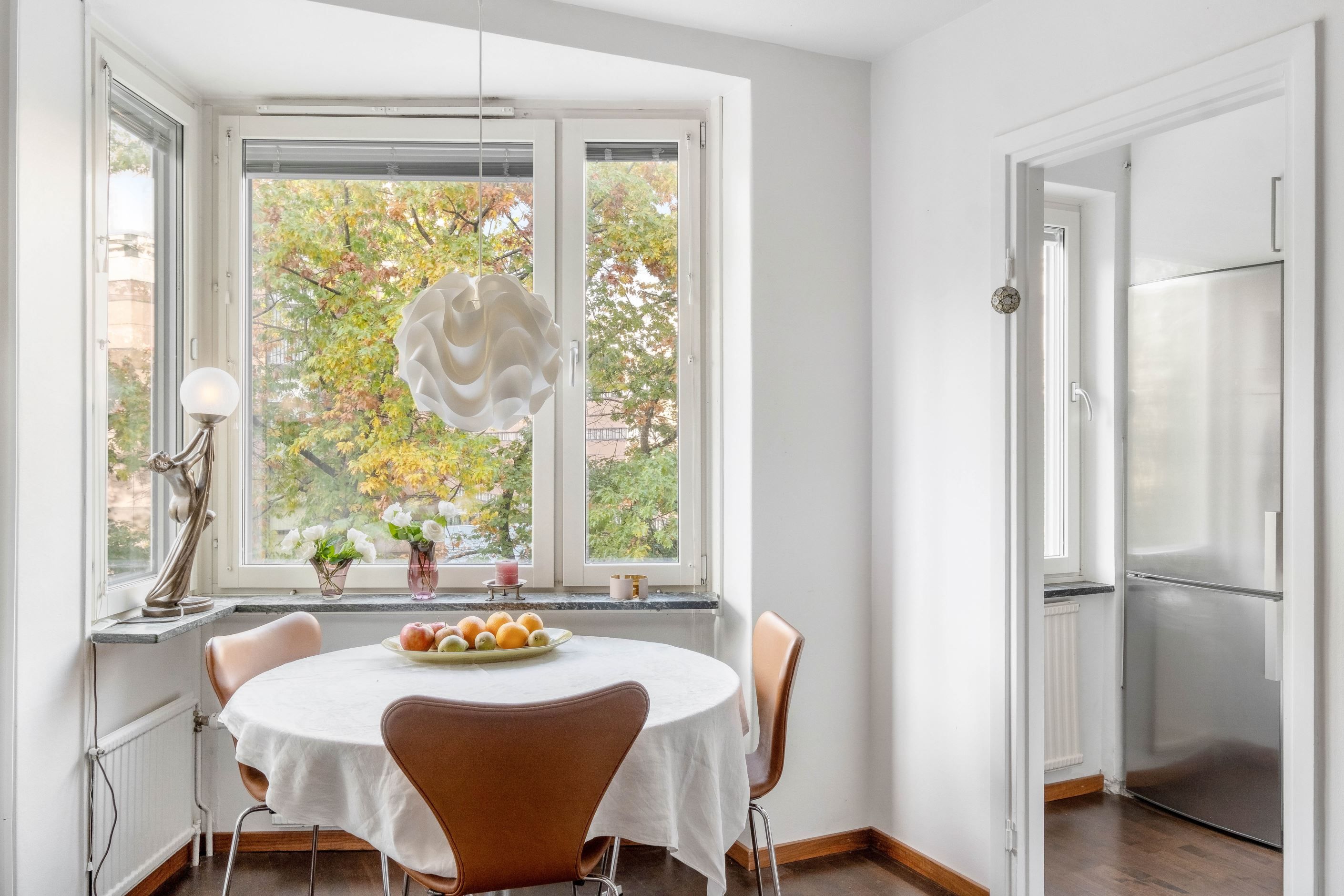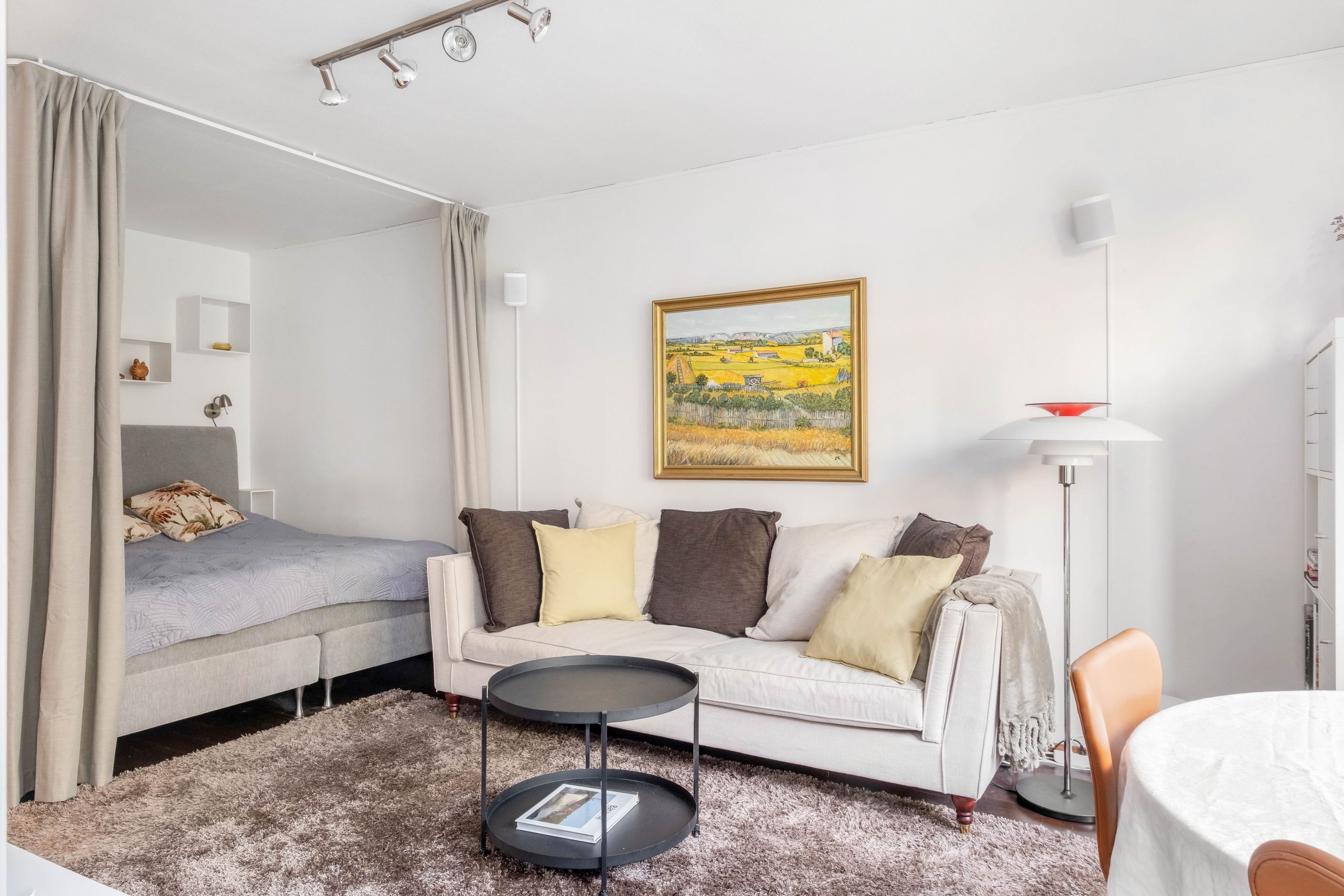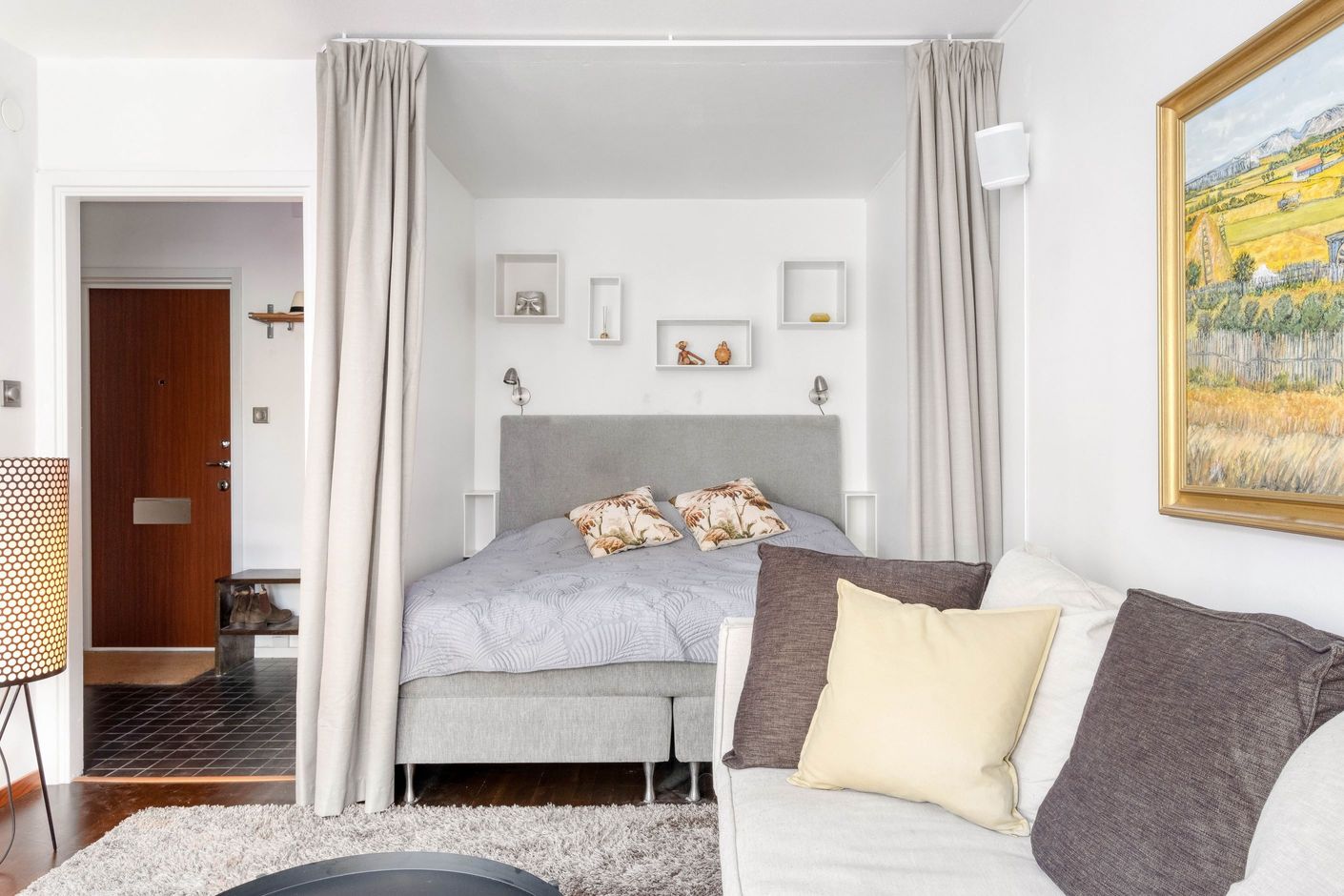 I den trivsamma sovalkoven, som ramas in av eleganta takhängda draperier, finns gott om plats för en dubbelsäng. Vid vardagsrummets karaktäristiska hörnfönster ryms en naturlig matplats där man gärna njuter av dagens måltider med utsikt över grönskan utanför. Ljuset strömmar in genom fönstren och skapar en varm och inbjudande atmosfär.