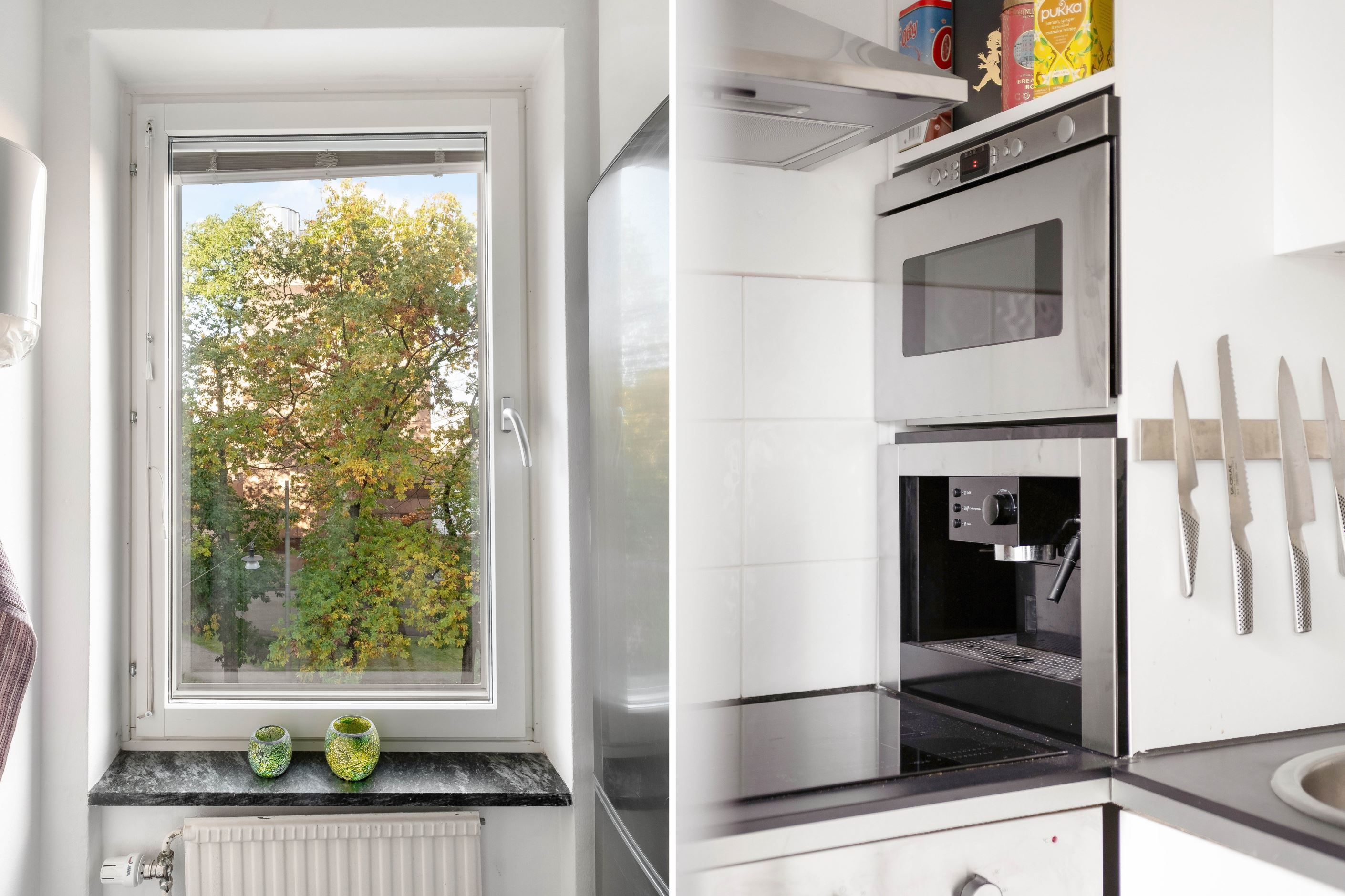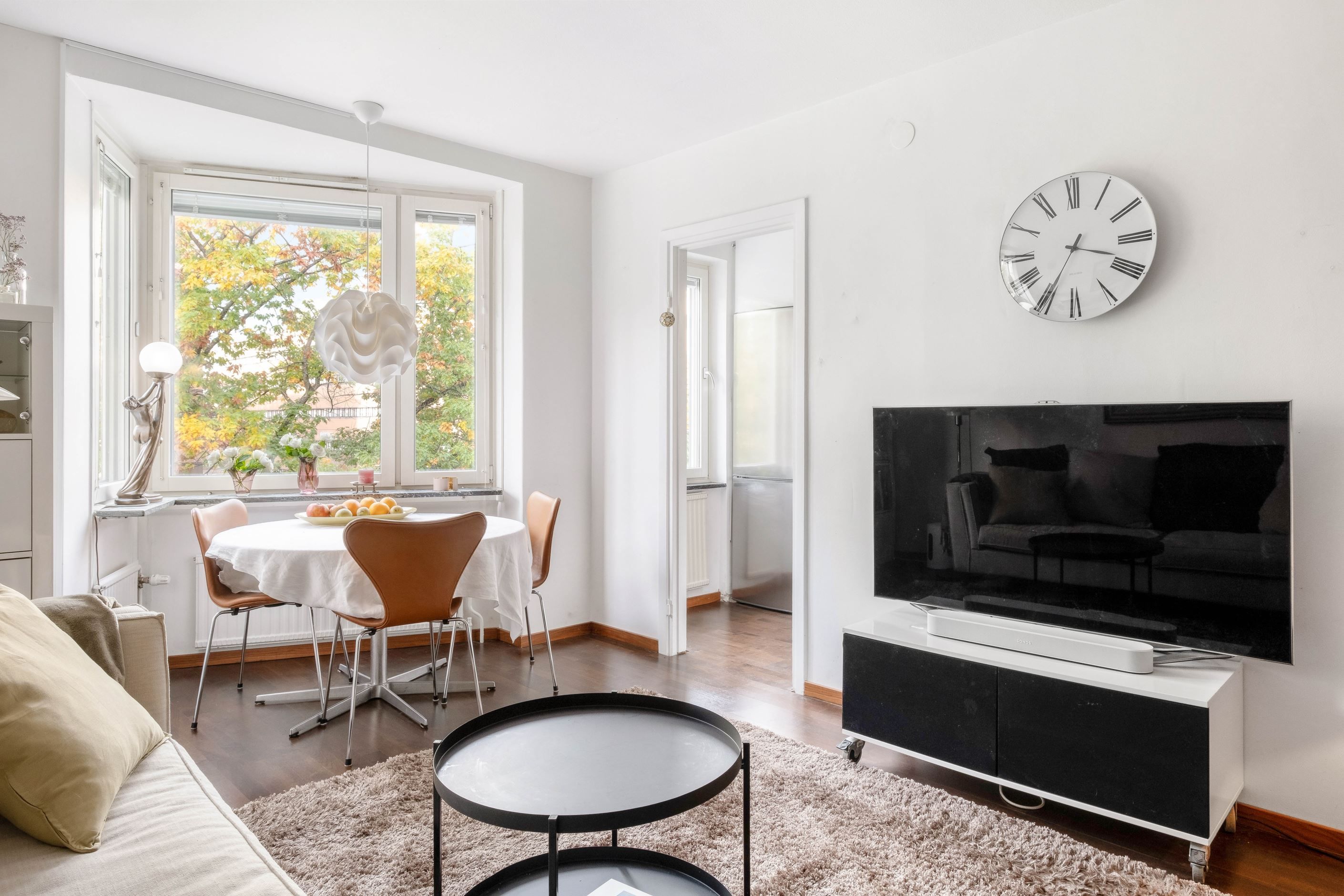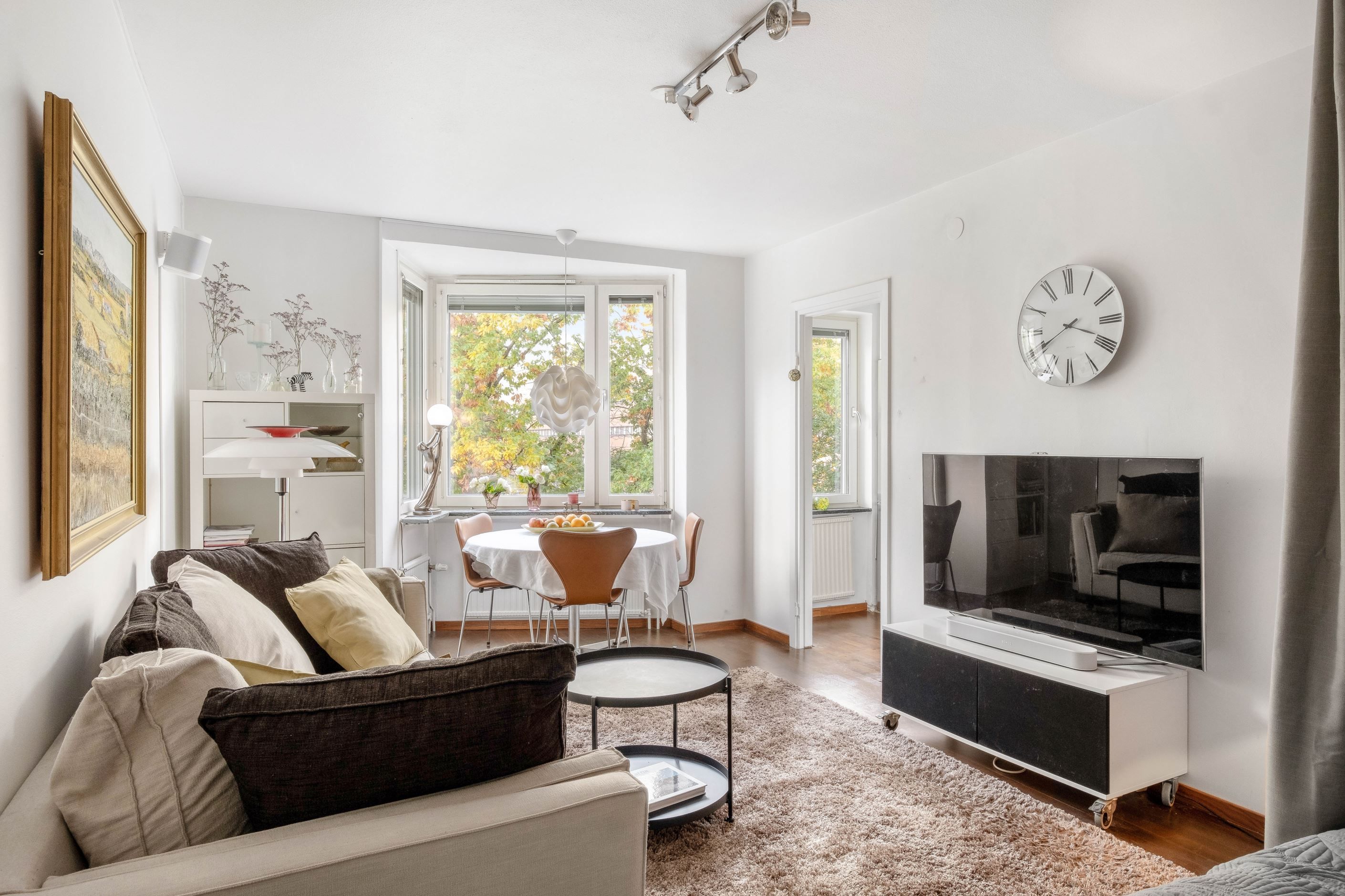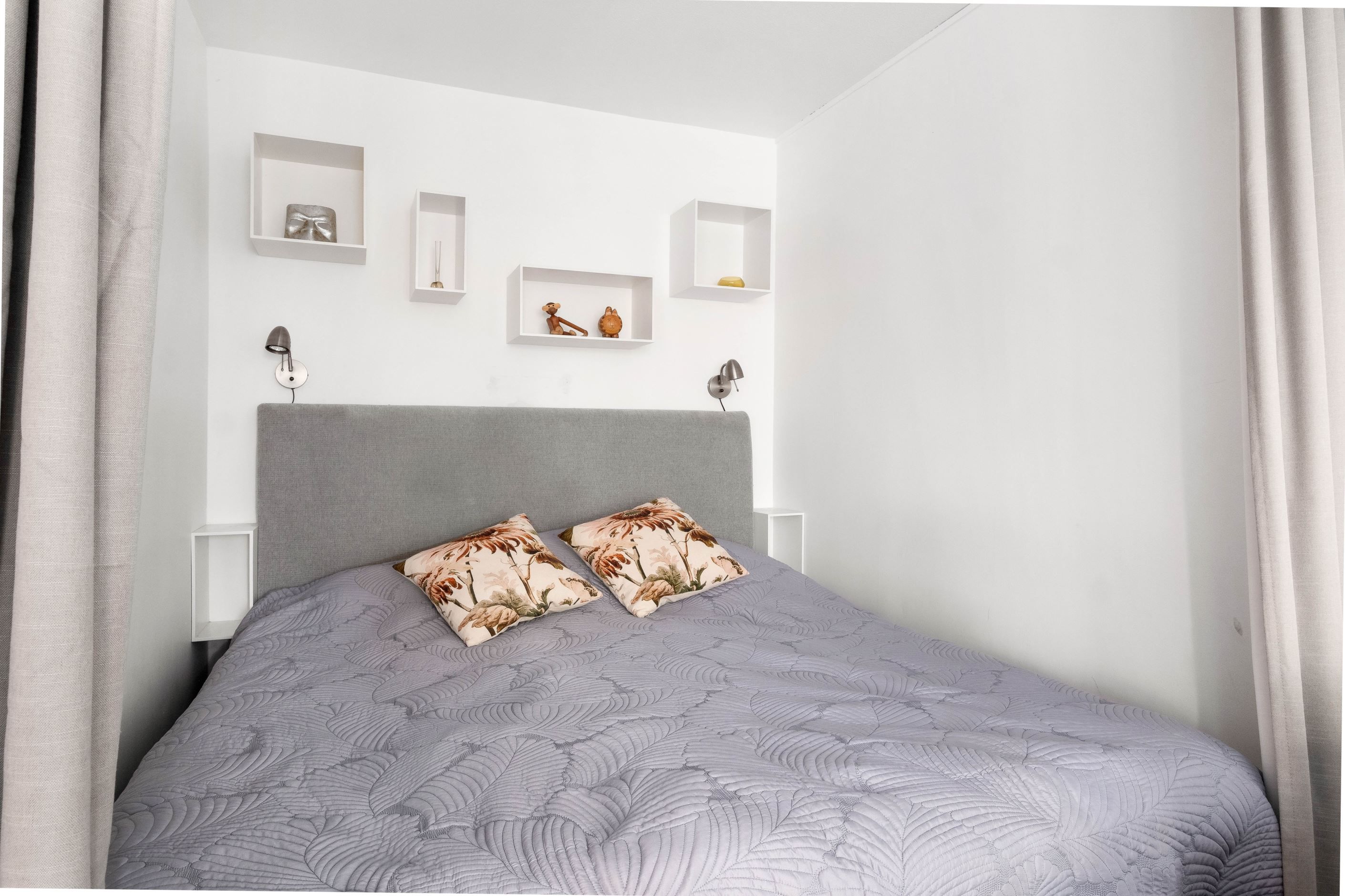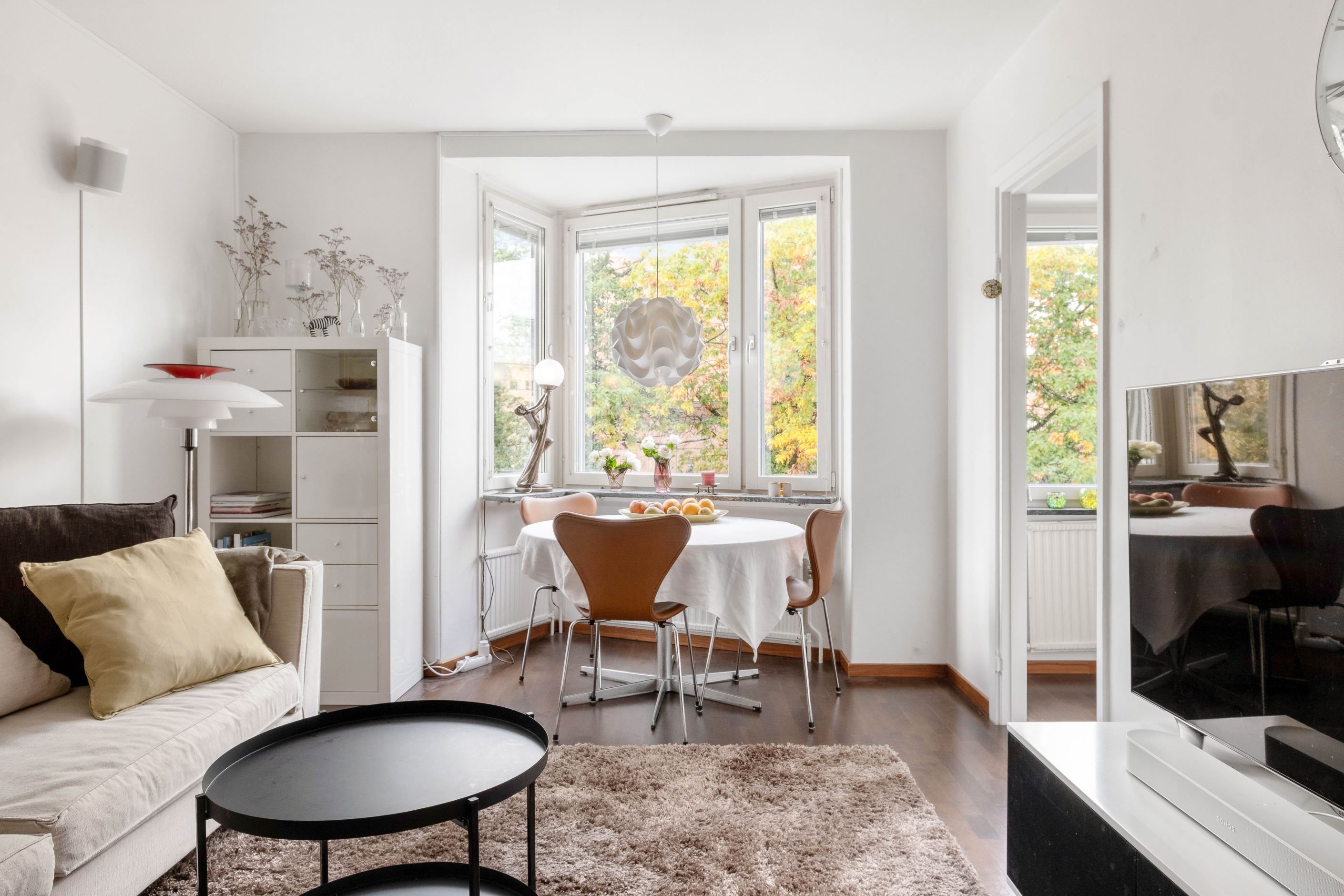 I den trivsamma sovalkoven, som ramas in av eleganta takhängda draperier, finns gott om plats för en dubbelsäng. Vid vardagsrummets karaktäristiska hörnfönster ryms en naturlig matplats där man gärna njuter av dagens måltider med utsikt över grönskan utanför. Ljuset strömmar in genom fönstren och skapar en varm och inbjudande atmosfär.