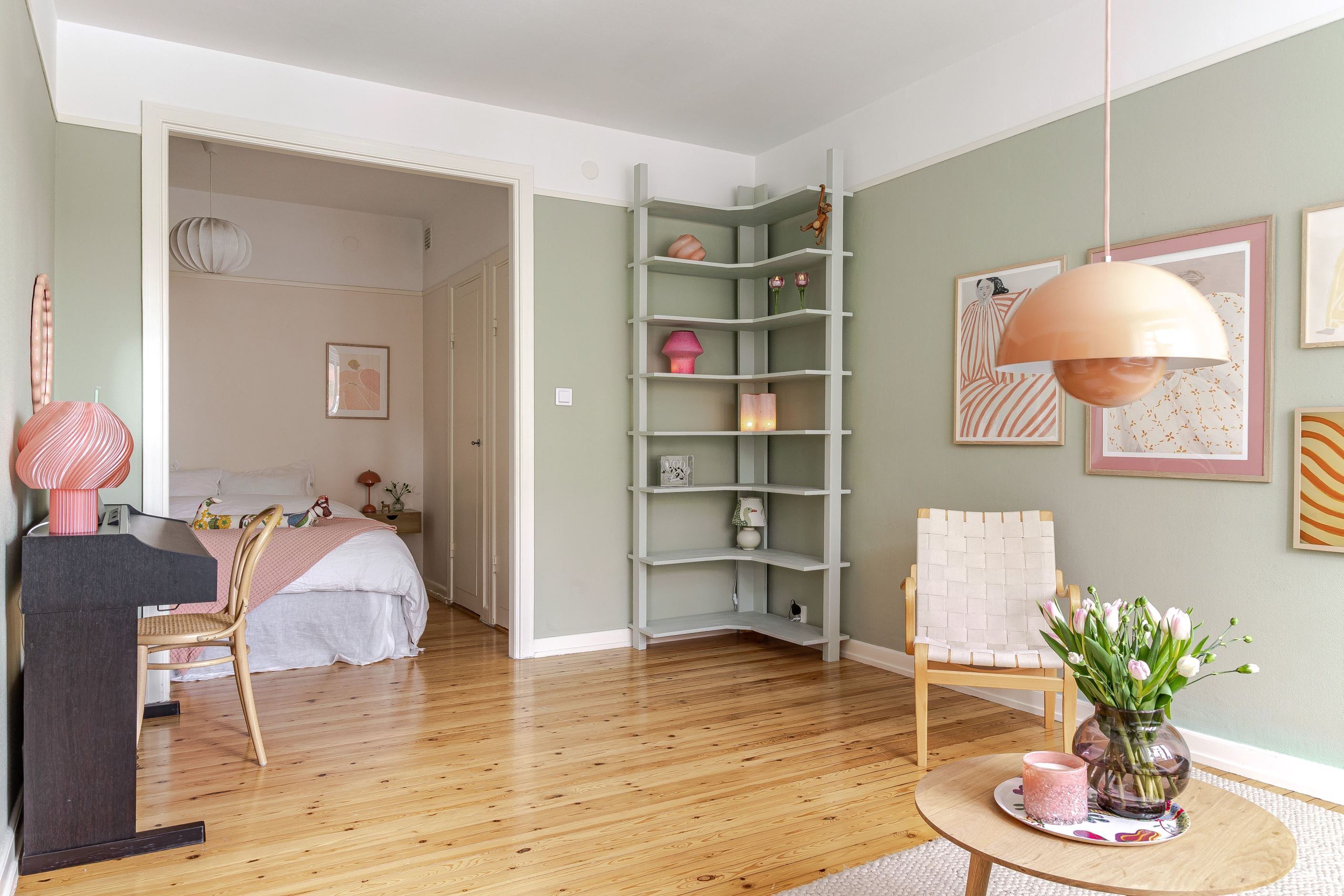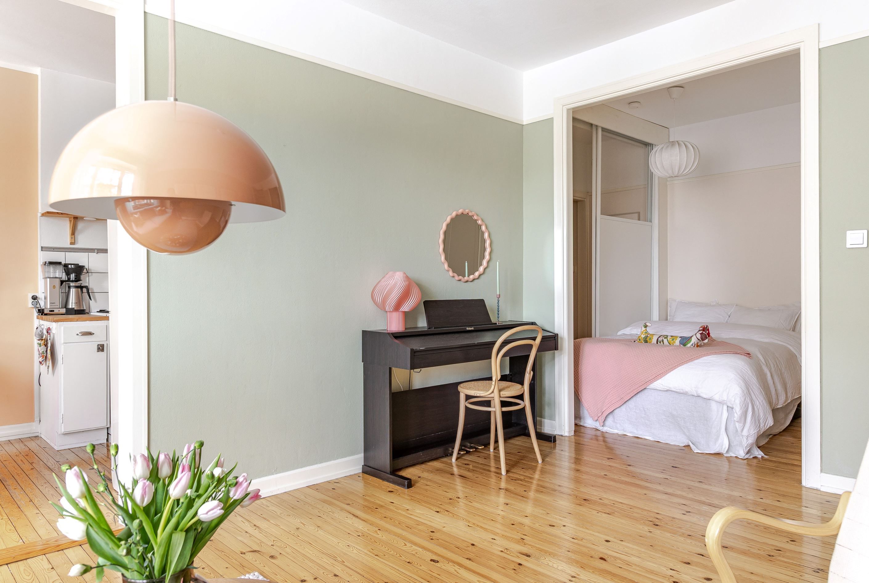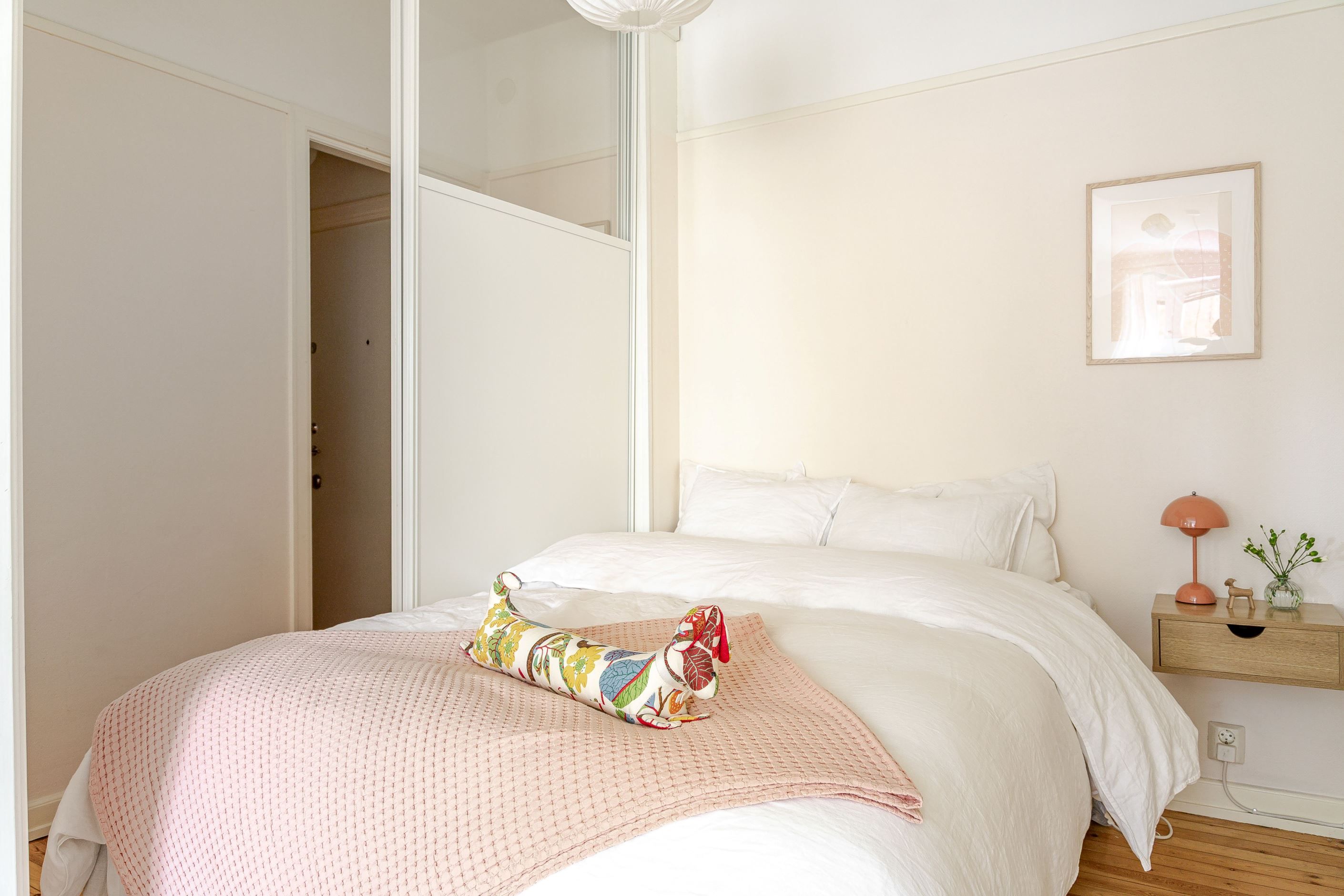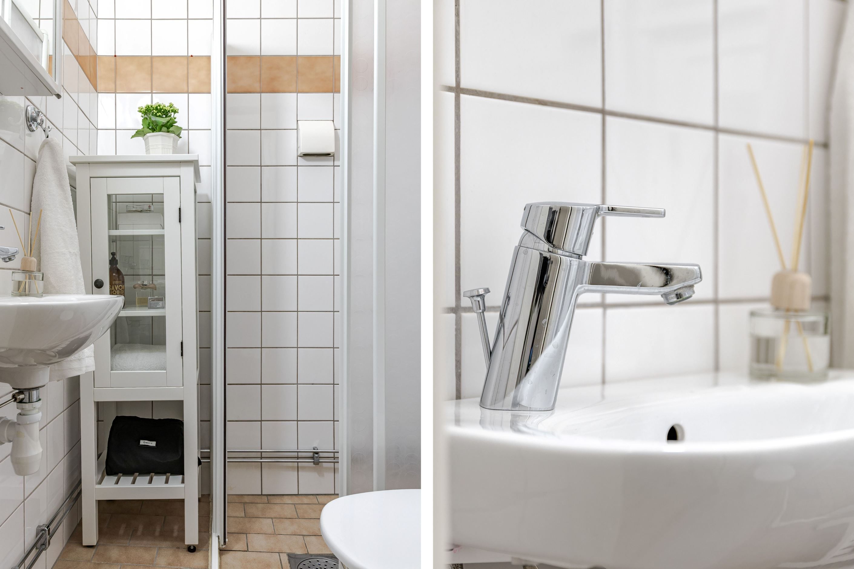 Välkommen in i hallen med vackert furuplank under fötterna och avhängningsmöjligheter. Från hallen når man det helkaklade stambytta badrummet med dusch, toalett, badrumsskåp och handfat, badrummet är förberett för tvättmaskin. Invid hallen har du sovrummet med plats för dubbelsäng och förvaringsmöjligheter, du kan enkelt stänga och öppna med fina skjutdörrar med glasparti som släpper in ljus från huvudhöjd.