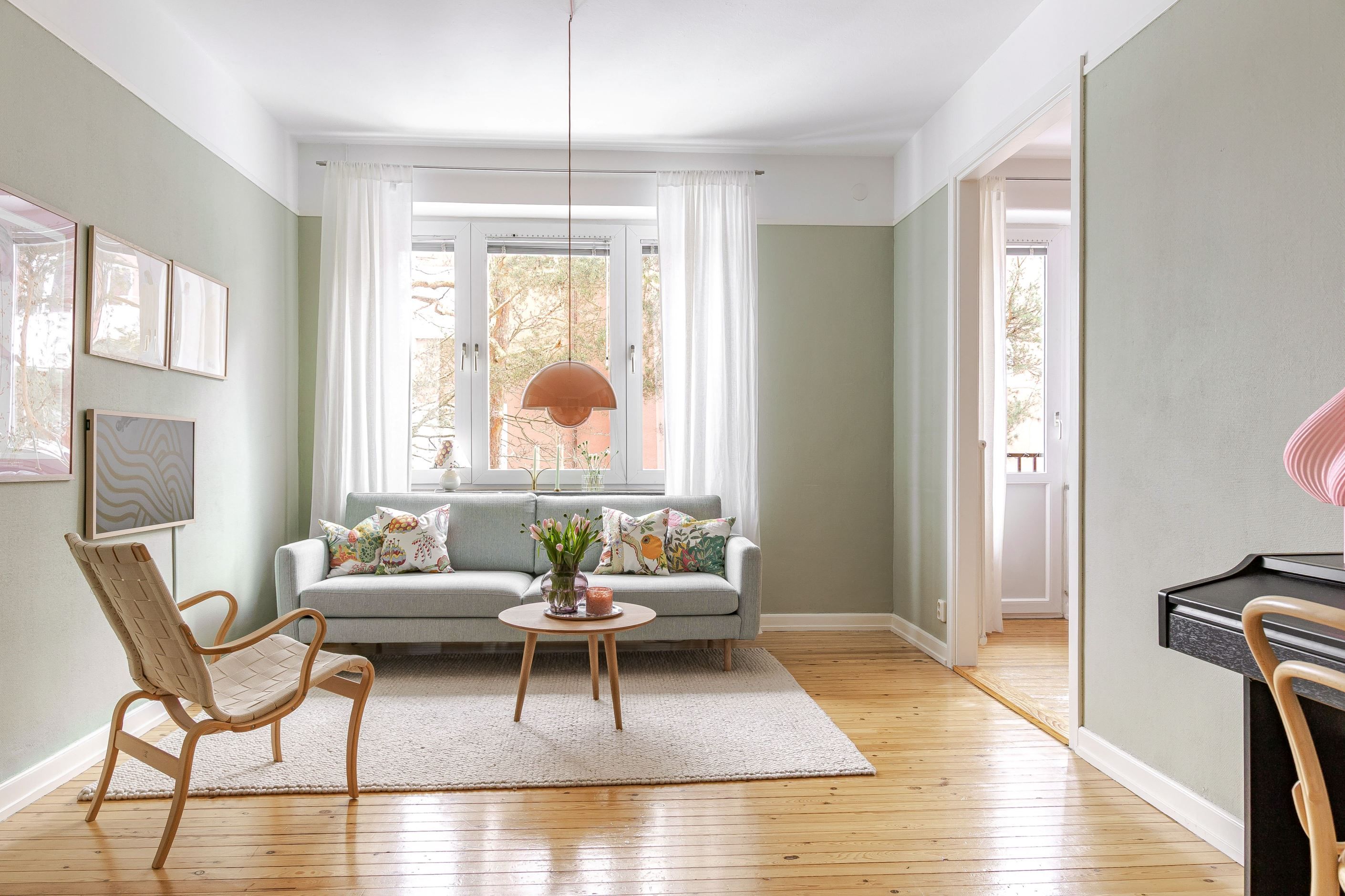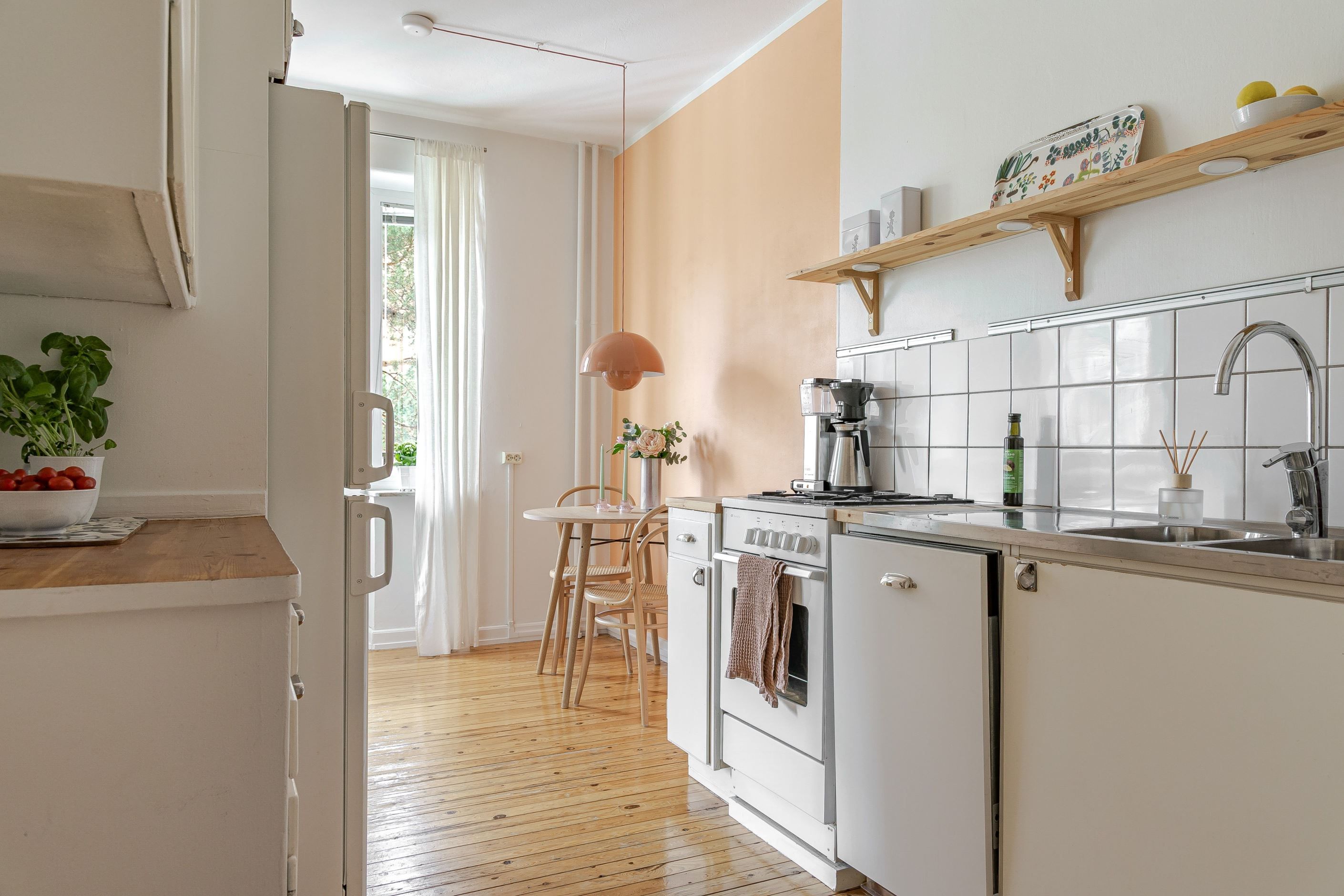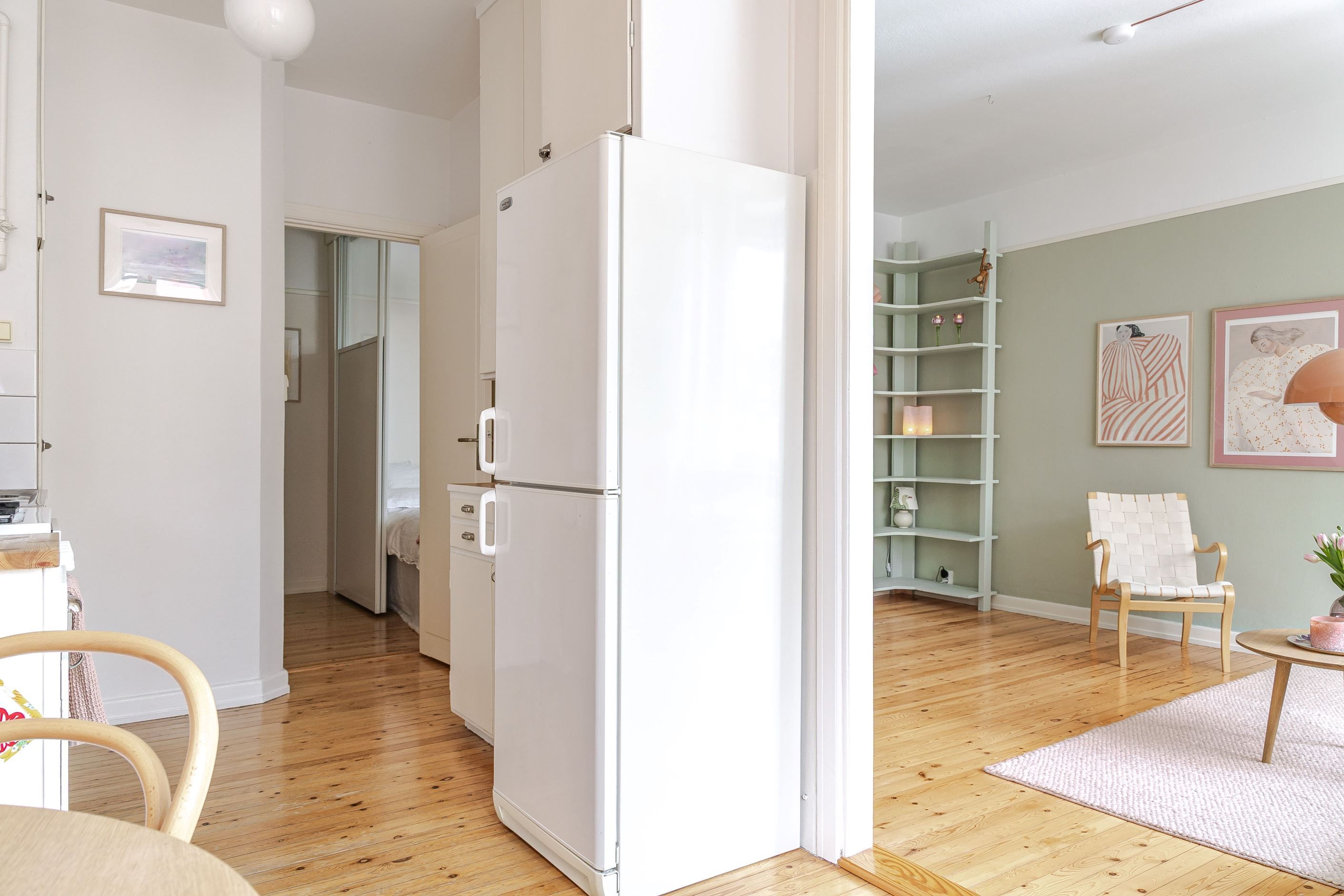 Vidare in i lägenheten är det en halvöppen planlösning mellan kök och vardagsrum. Köket erbjuder gott om arbetsyta och förvaring samt är fullt utrustat med diskmaskin, spis, ugn och kyl & frys. Genomgående följer vackra furuplanket i hela lägenheten. Från köket har du plats för matbordsyta och utgång till balkongen. På balkongen kan du njuta av solen i fritt insynsskyddat läge med vacker grönska och solen som närmsta granne. Invid köket når du till vardagsrummet med rejäla fönsterpartier som släpper in ett härligt ljusflöde. Här finns plats för en stor soffgrupp samt tv möbler.