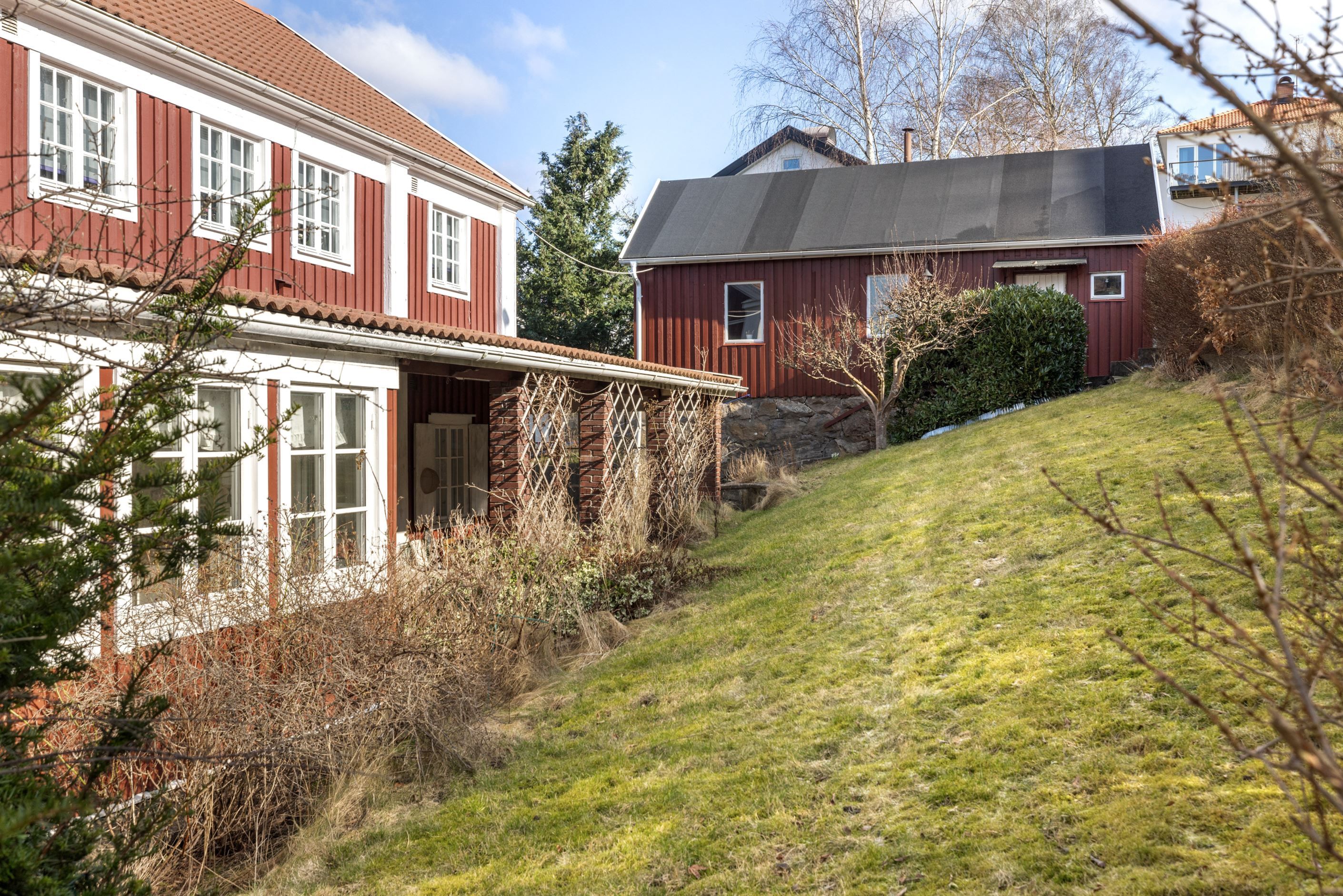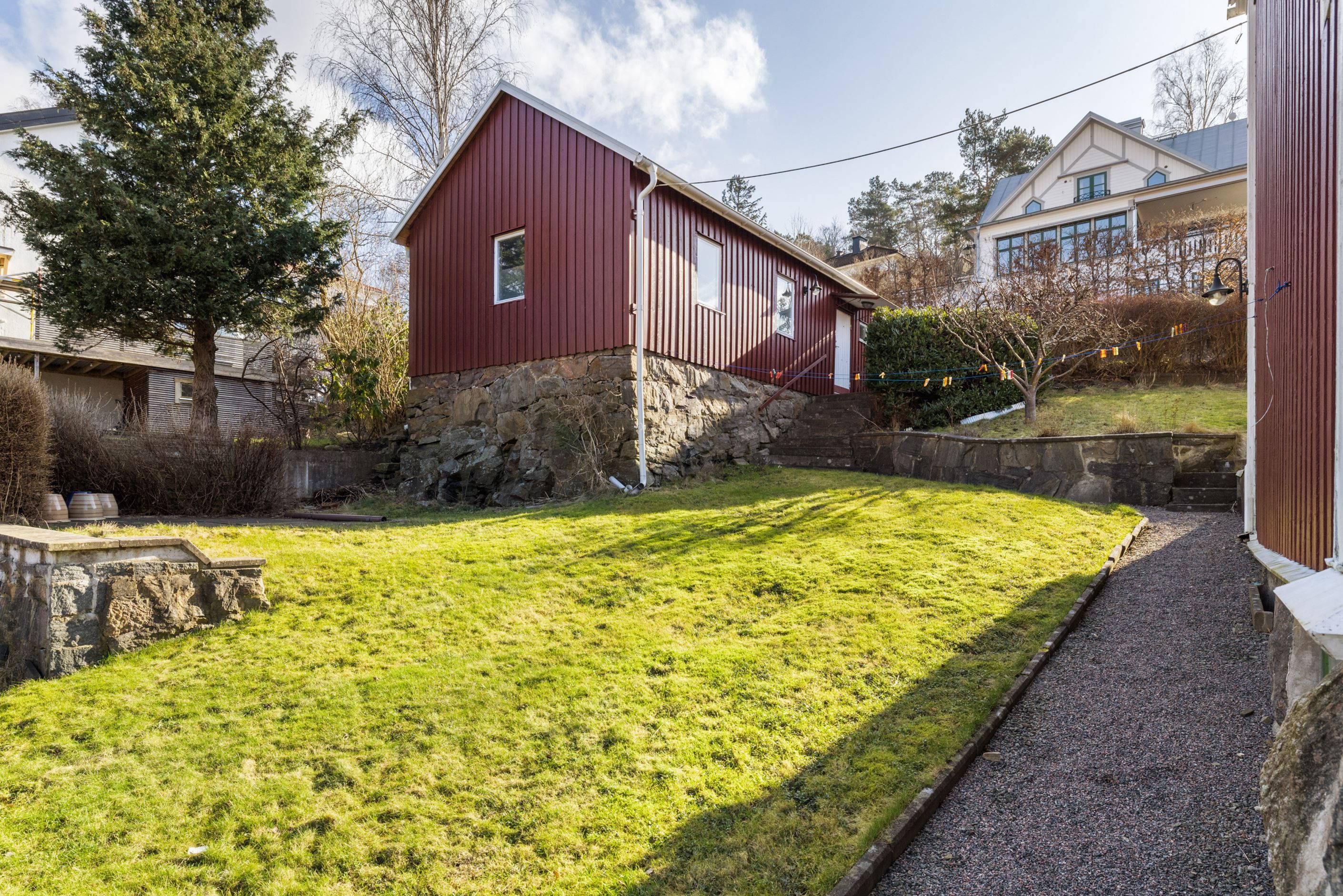 Villan omges av en härlig grönskade trädgård och upp för den fina stentrappan på husets trädgårdssida finner ni en komplementbyggnad om hela 50 kvadratmeter. Bara fantasin sätter gränser, här finns möjlighet att skapa just det ni önskar och villhöver här. Denna byggnad har tidigare huserat både möbelverkstad och keramikverkstad.