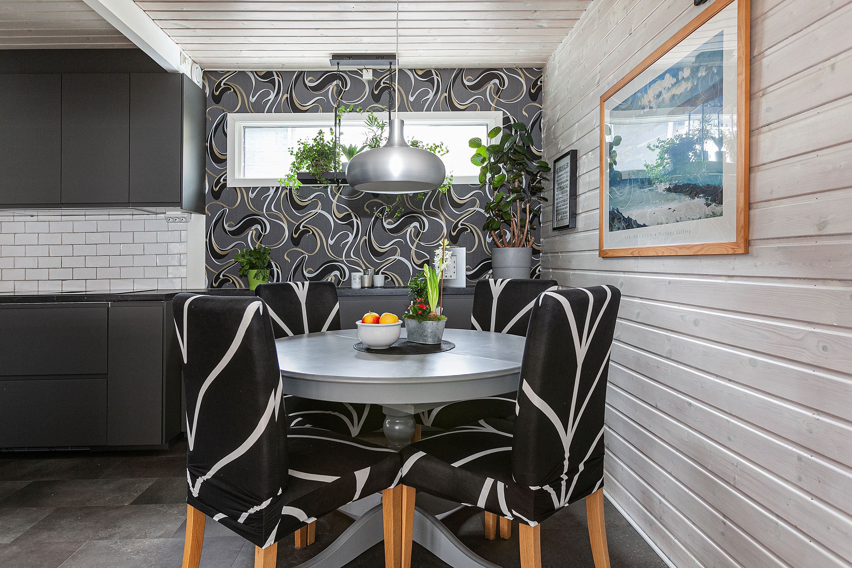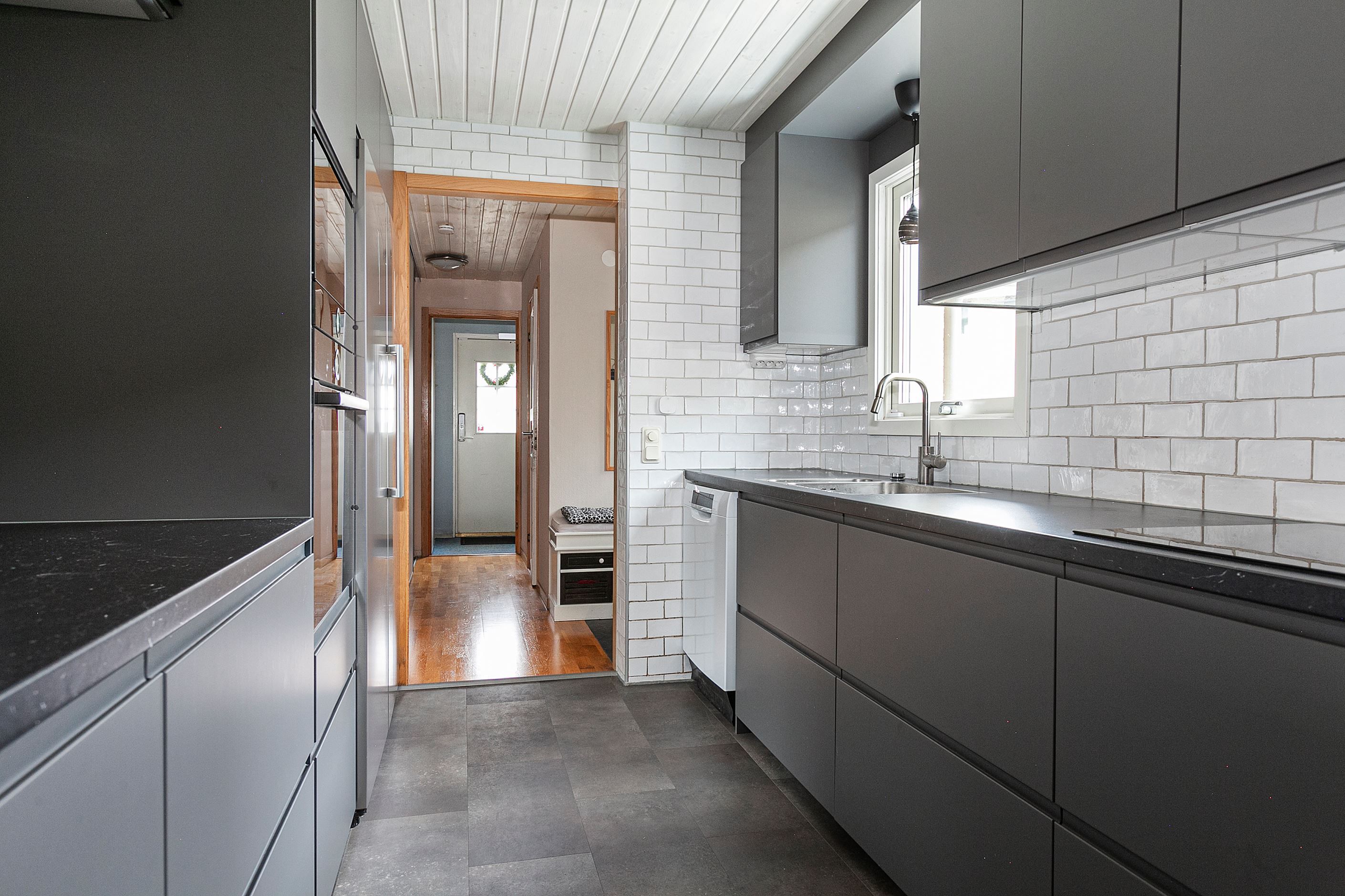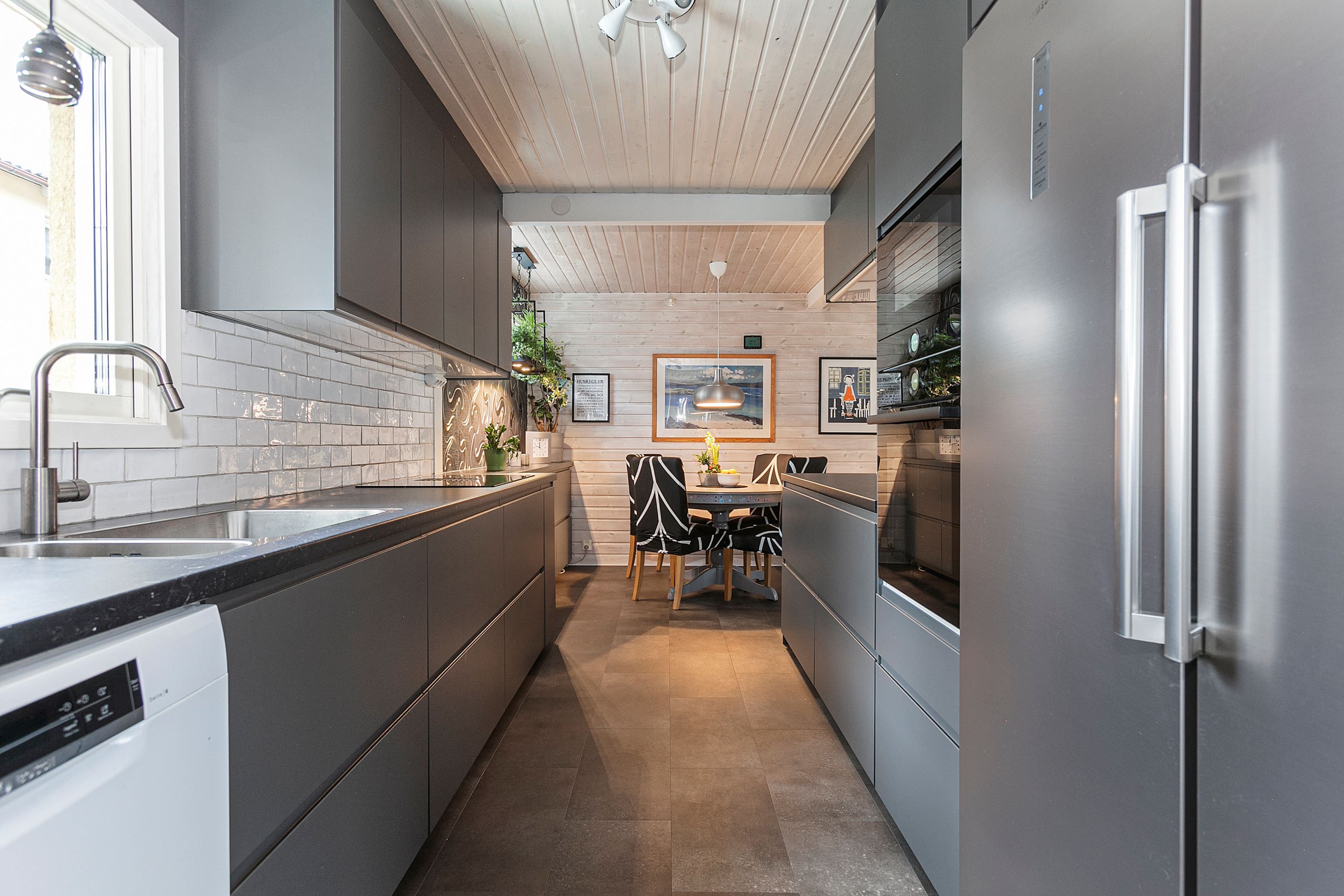 Bär in matkassarna i det moderna och rymliga köket från 2022 där luckor och skåp rymmer mycket förvaring. Den inspirerade kocken har spishäll, diskmaskin, inbyggd ugn och mikro samt kyl och frys i fullhöjd till sitt förfogande. När middagen är klar serverar ni den vid matbordet som har sin givna placering intill fönstret.