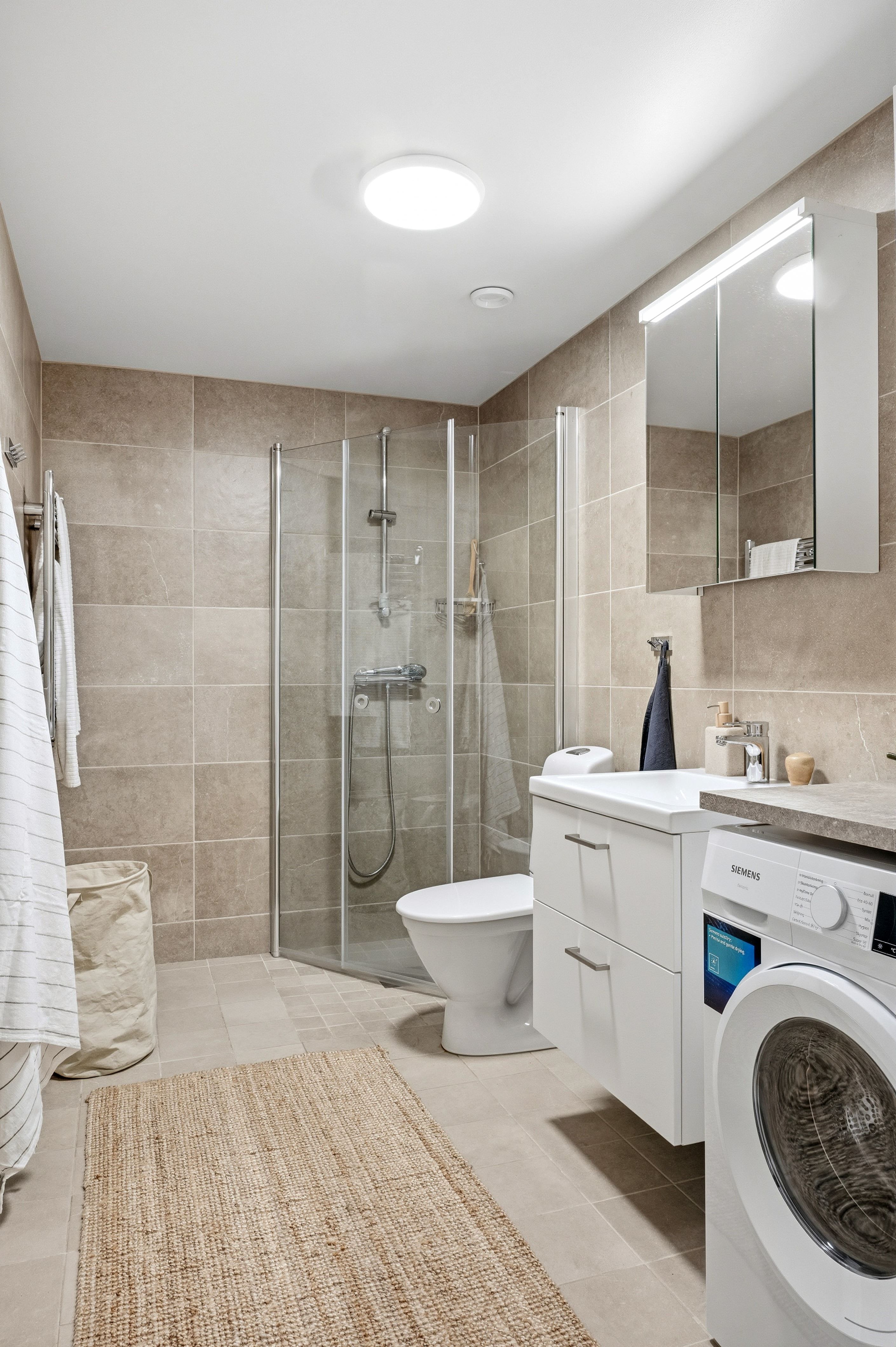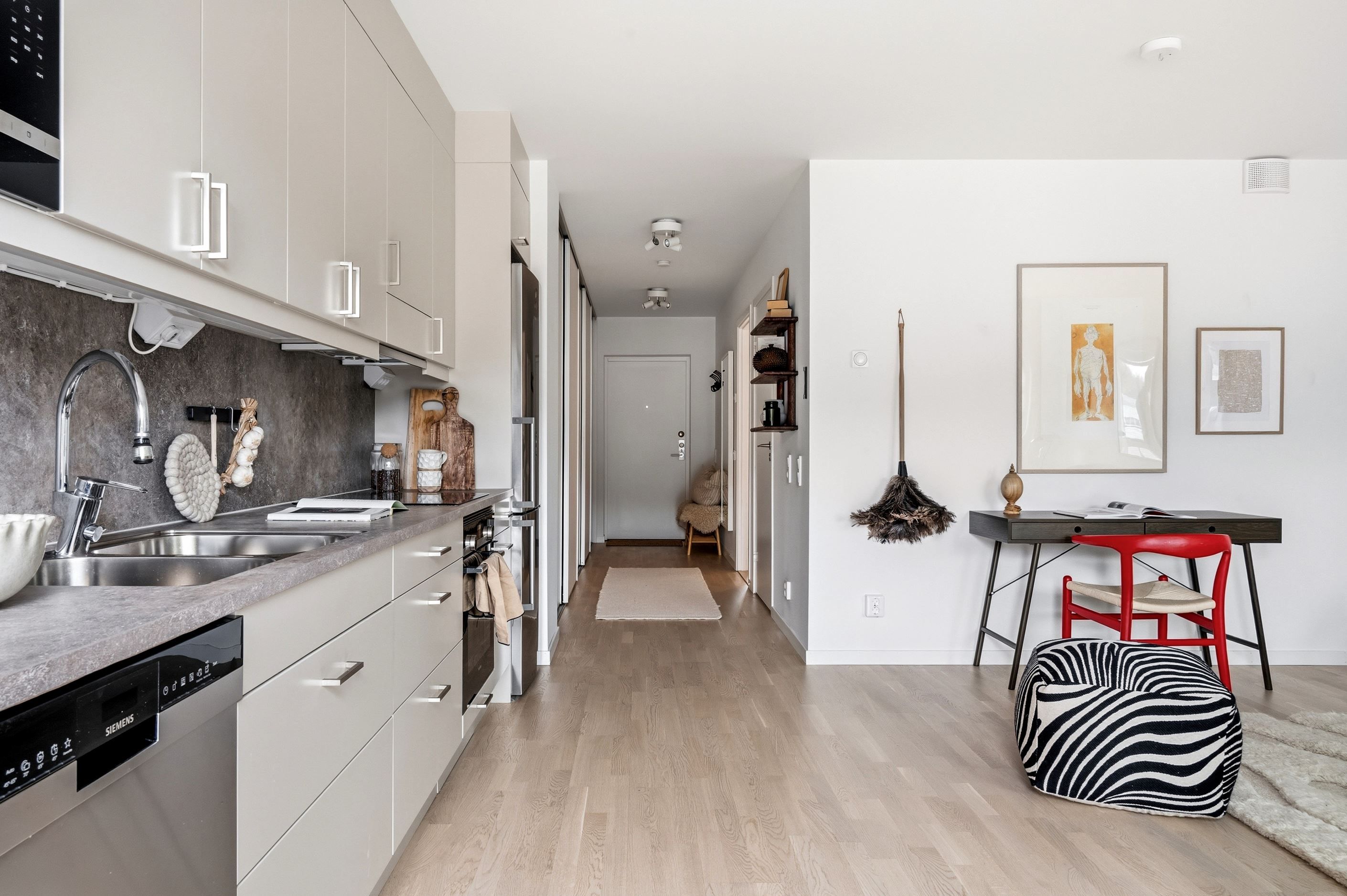 Redan i hallen möts du av en välkomnande atmosfär och gott om förvaring i form av garderober som löper längs väggen och smidigt tar dig vidare in i bostaden. Direkt till vänster ligger sovrummet, en lugn och rofylld plats att landa i. Lite längre in finner du det helkaklade badrummet, utrustat med dusch, wc, tvättmaskin och handdukstork, allt för en bekväm vardag.