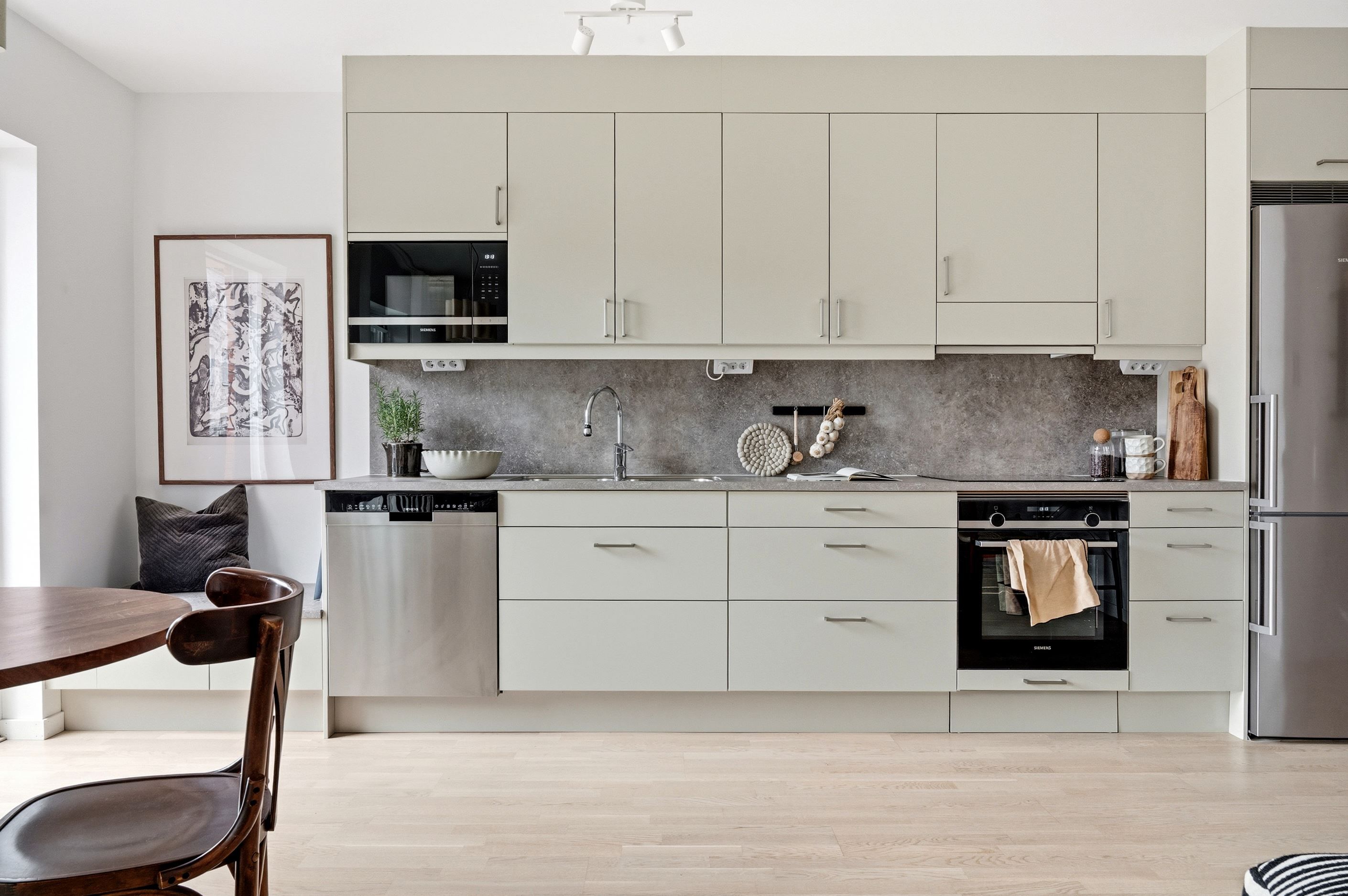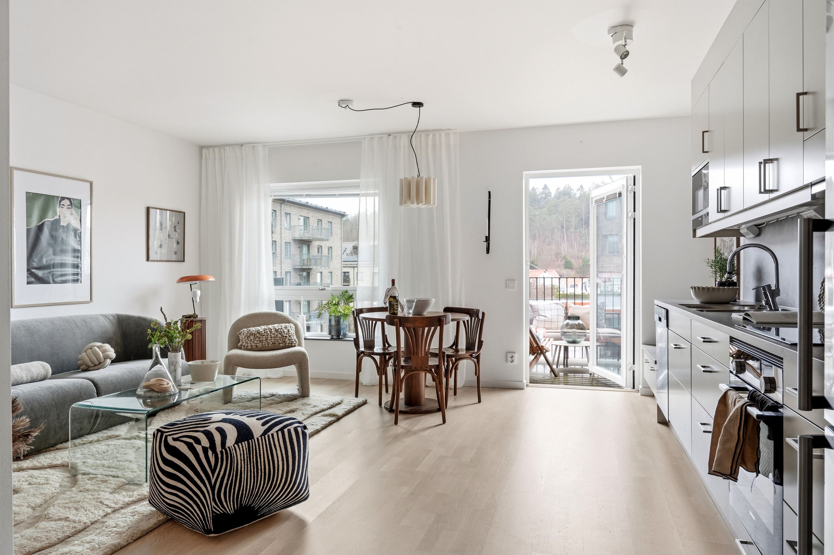 Hallen öppnar sedan upp mot hemmets sociala yta, där kök och vardagsrum möts i en öppen och inbjudande planlösning. Här skapas en naturlig plats för både vardag och umgänge. Från rummet kliver du ut på balkongen, där du möts av en rofylld vy mot vackra Änggårdsbergen, en perfekt plats att njuta av lugnet efter en lång dag.