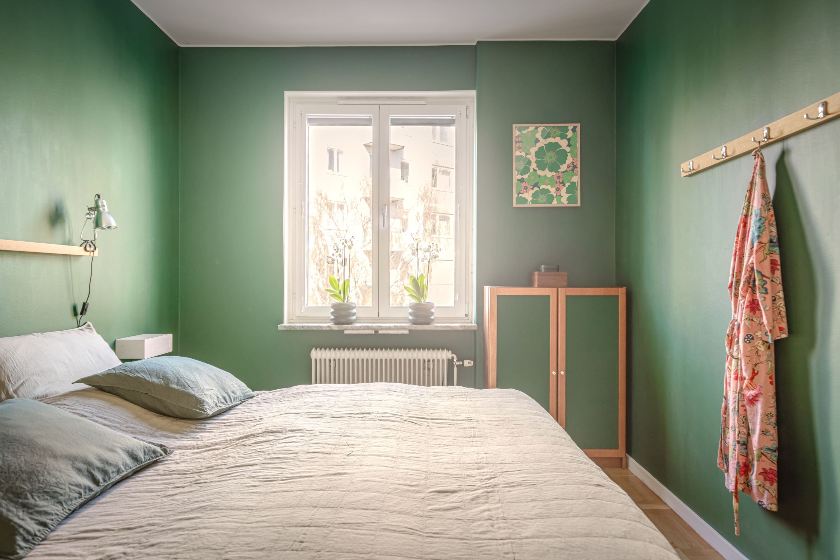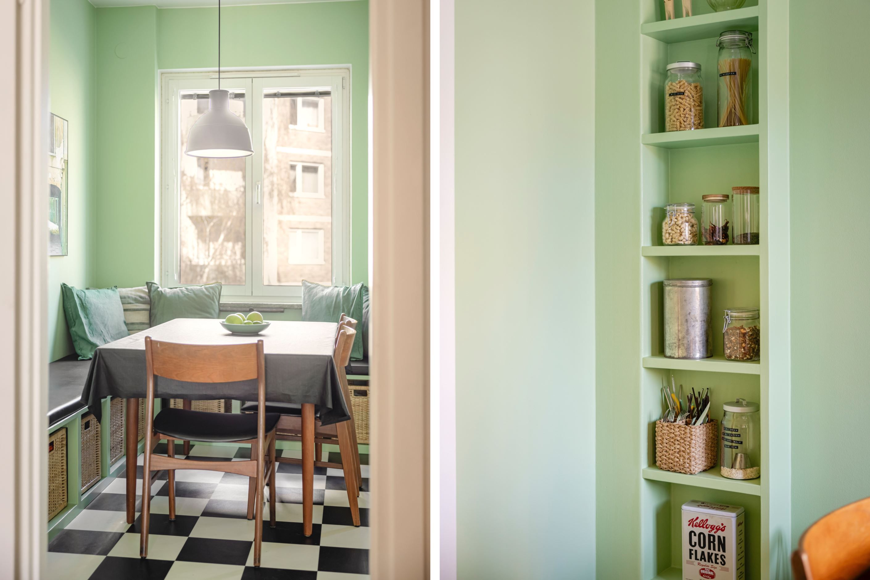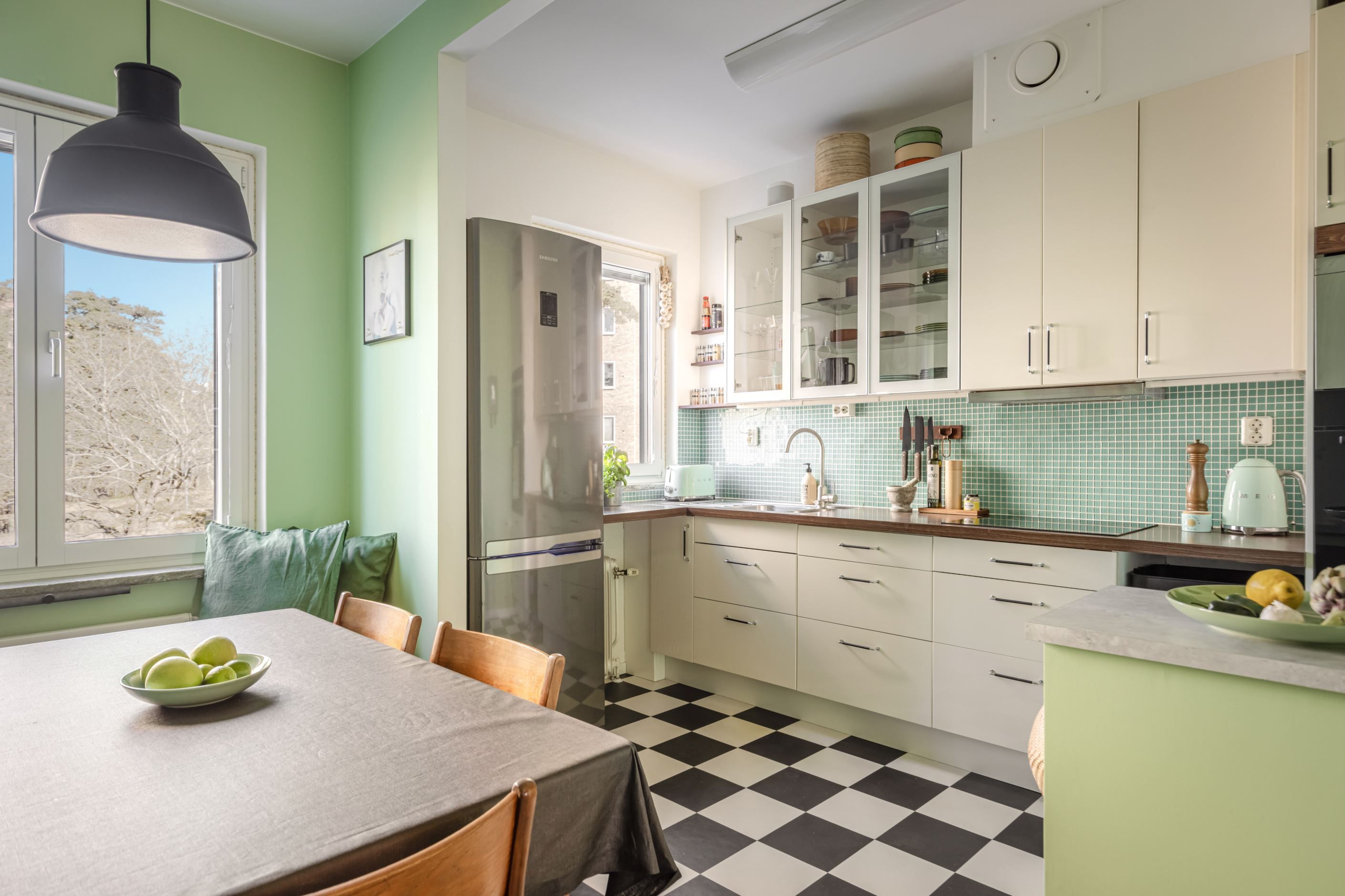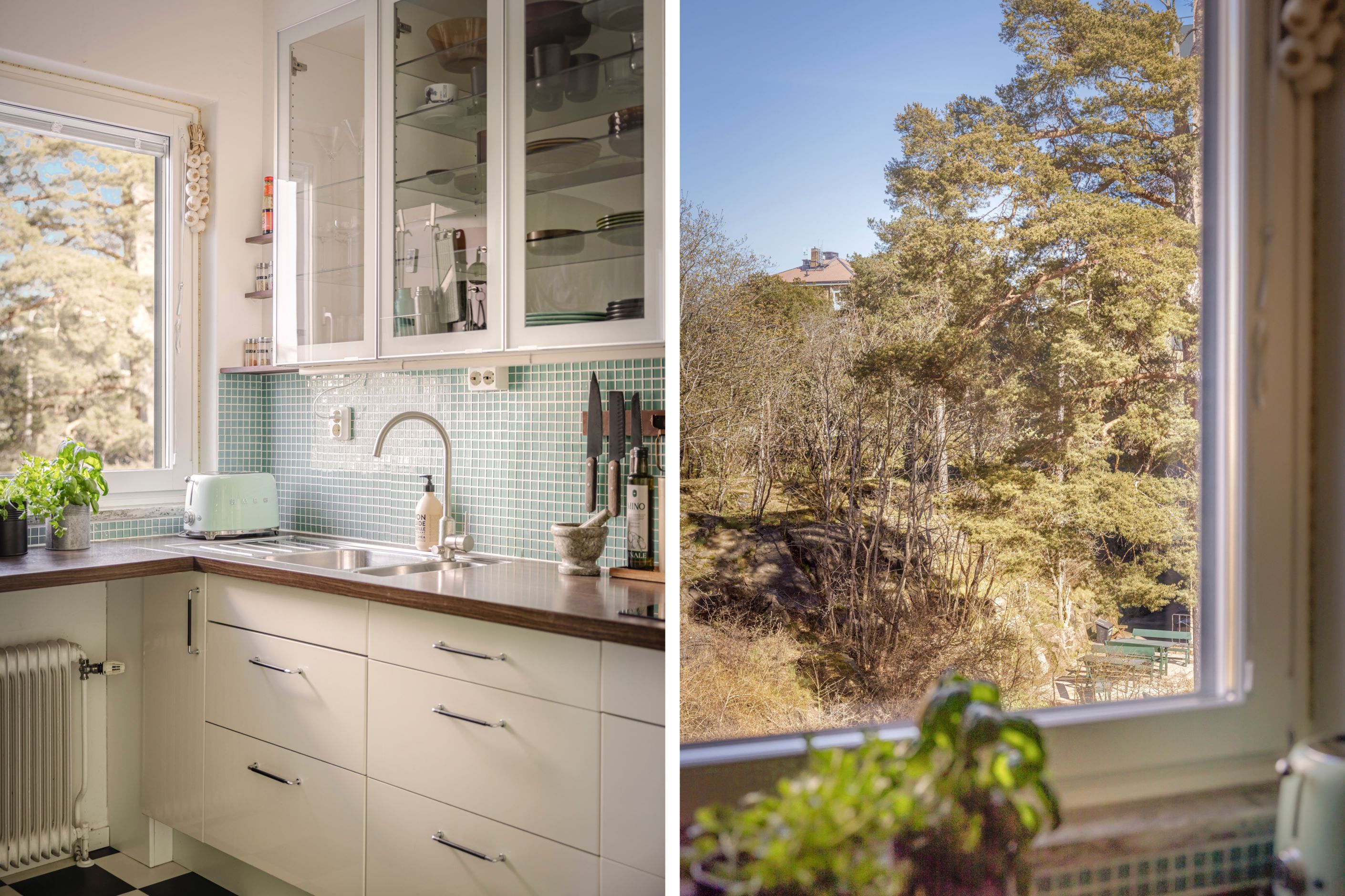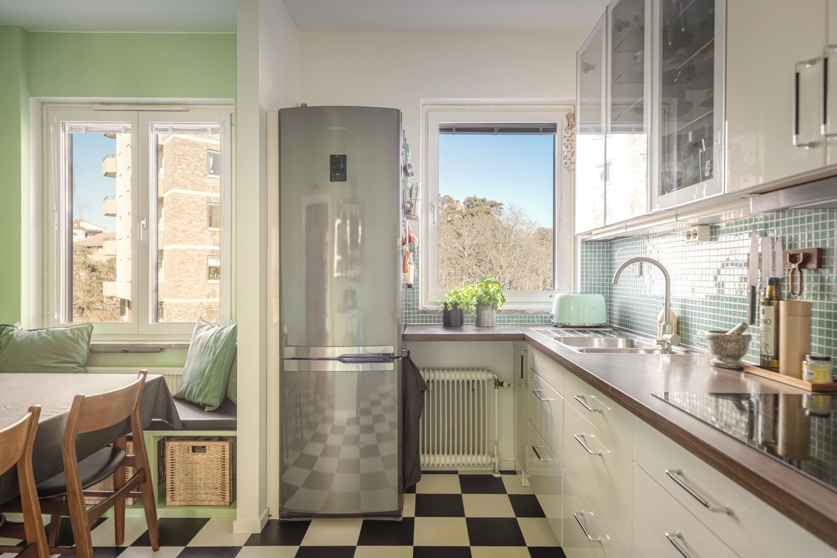 Vidare in i bostaden nås det fullt utrustade köket som är charmigt inrett med schackrutigt golv, ljusa över- och underskåp samt en generös arbetsyta i mörkare trä. Ovan arbetsytan sitter en glasmosaik i grönblå ton som ger köket karaktär. Intill köket ligger sovrummet som rymmer en dubbelsäng med sängbord samt ytterligare förvaring i form av inbyggda garderober.