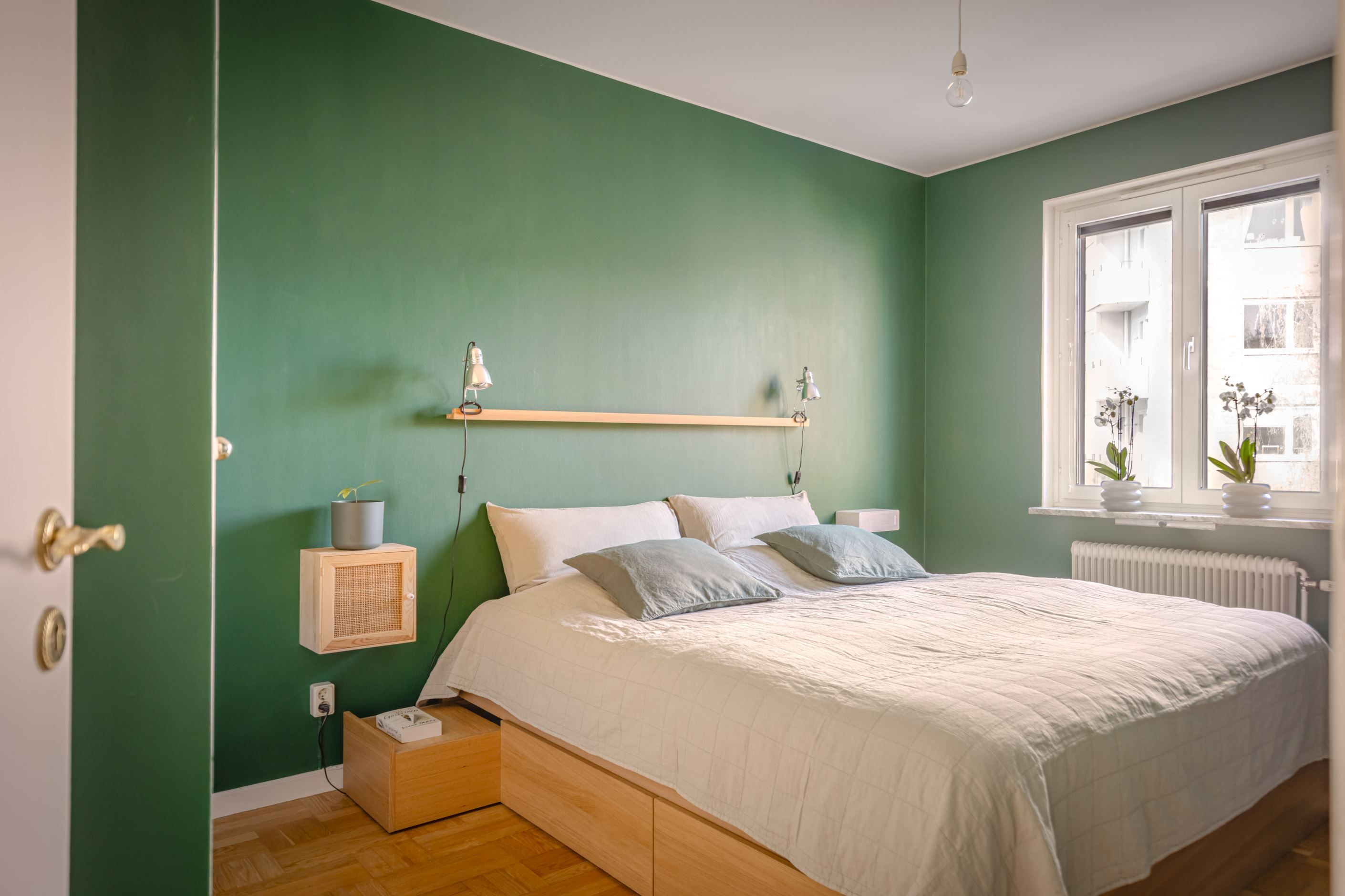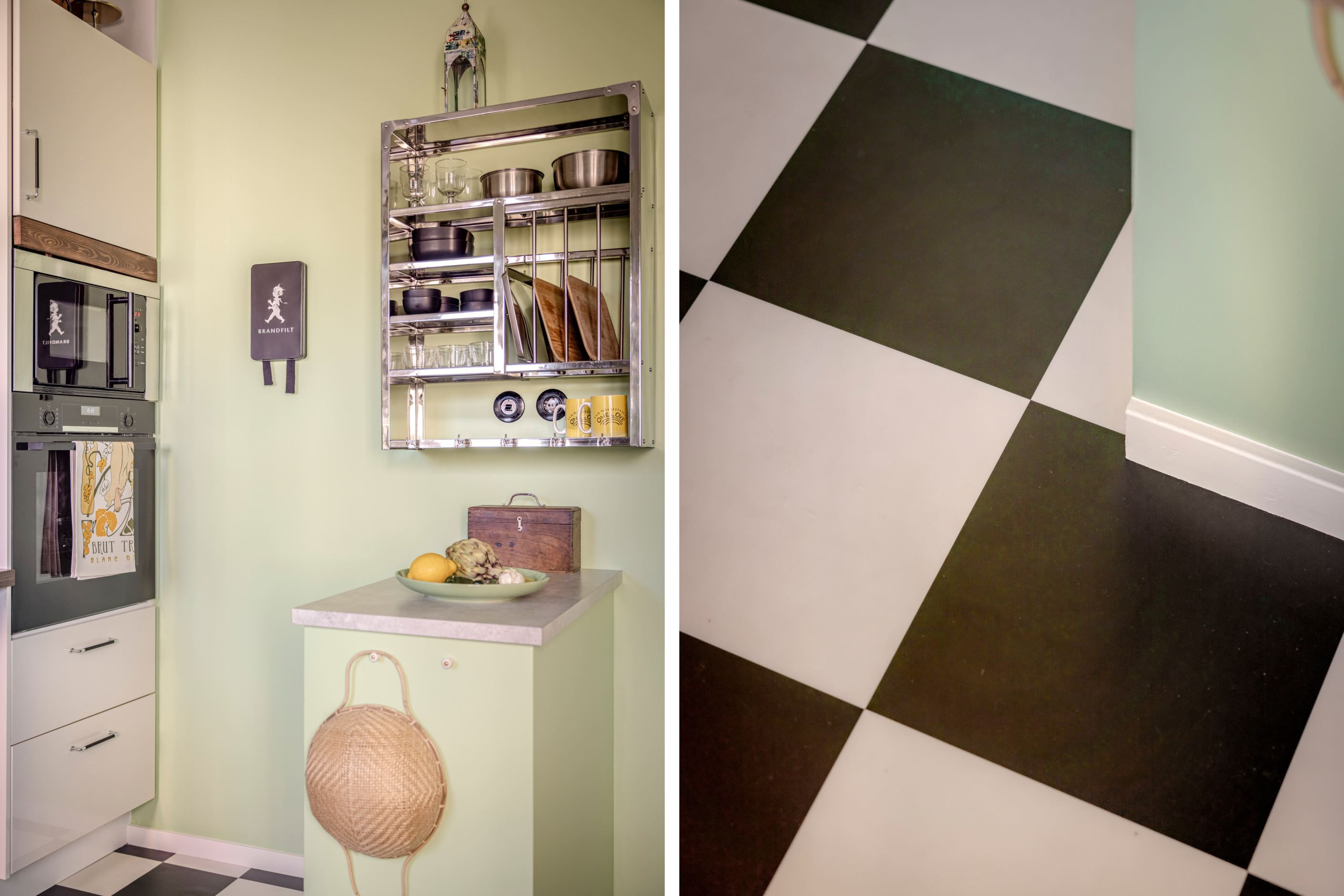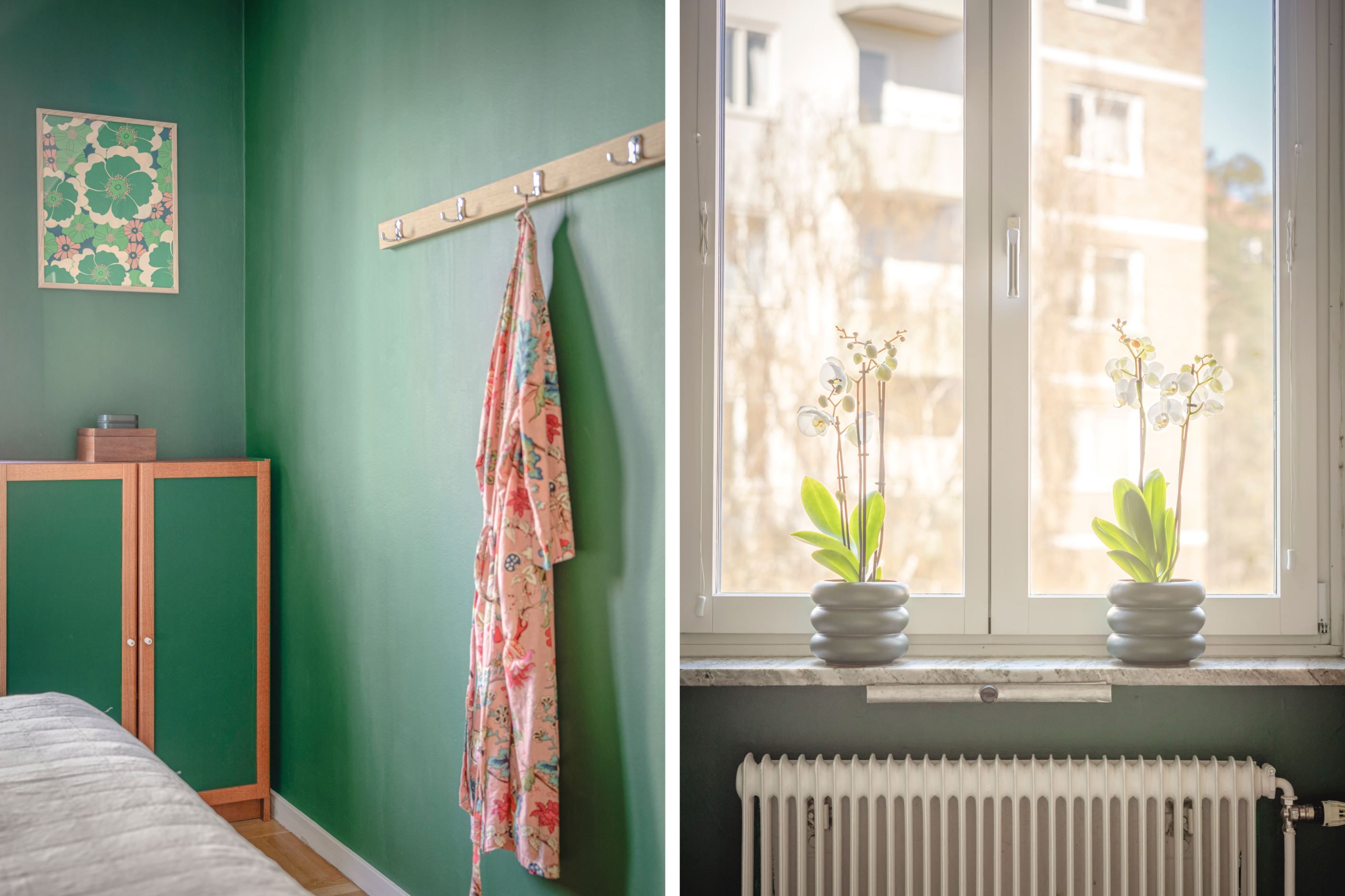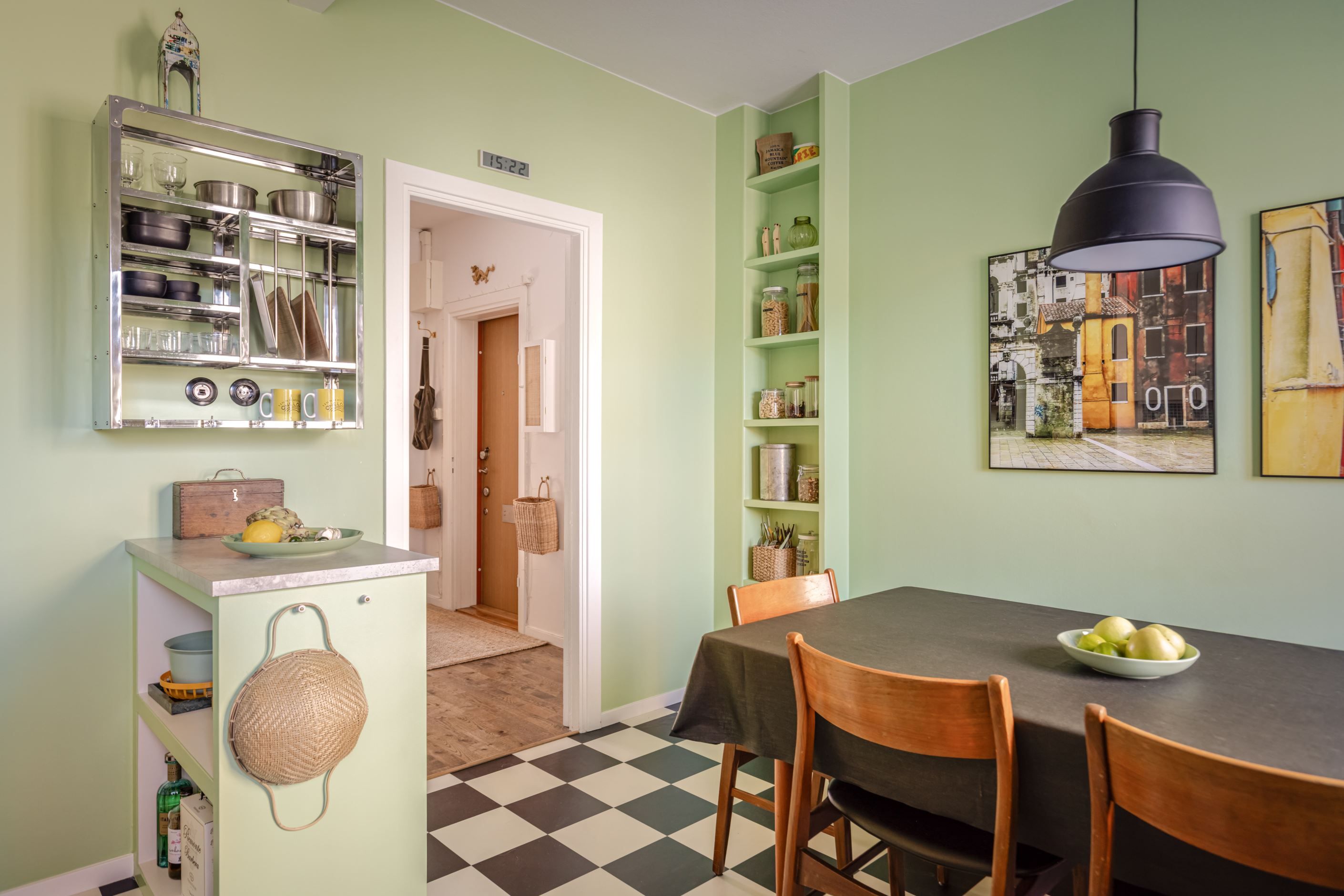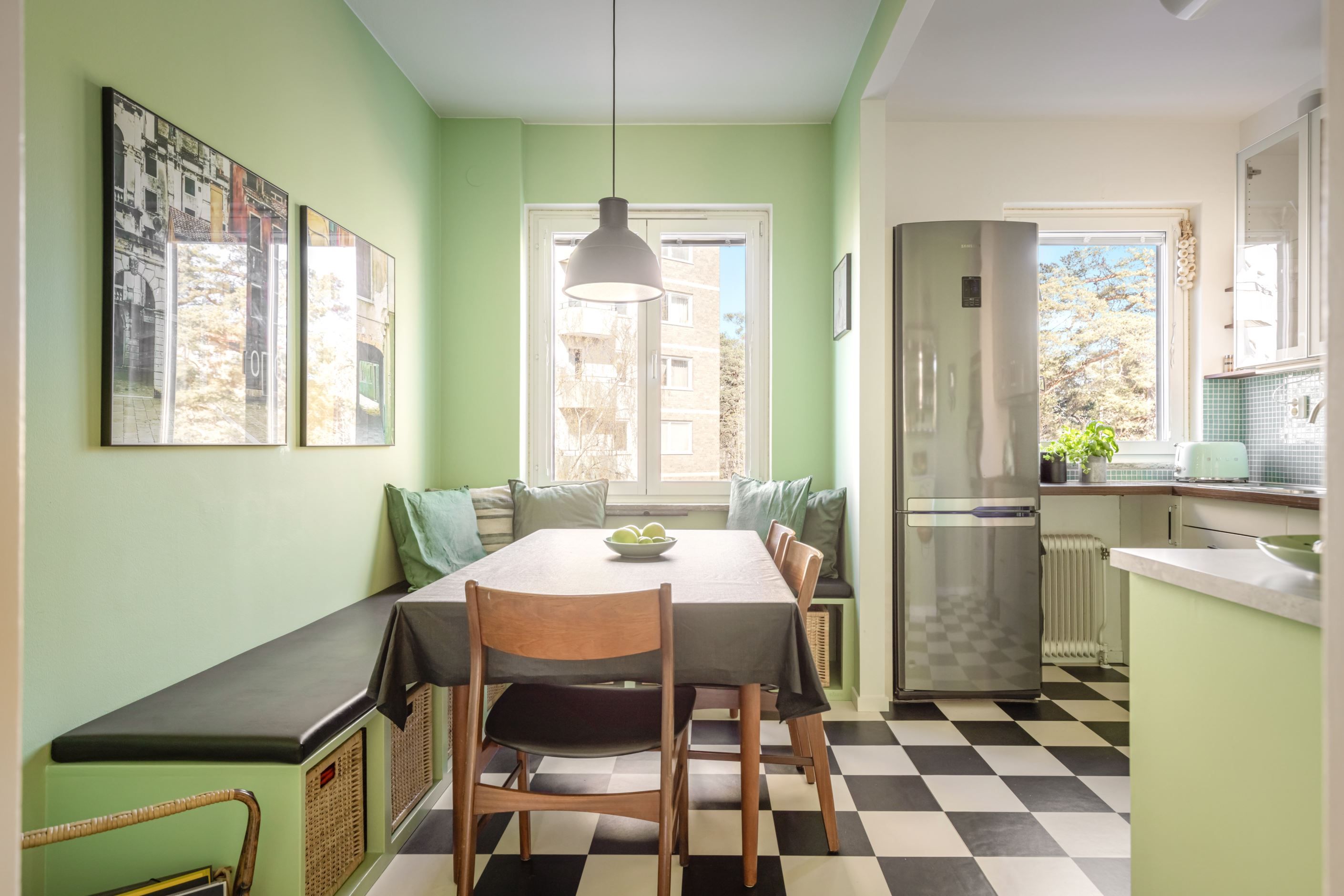Vidare in i bostaden nås det fullt utrustade köket som är charmigt inrett med schackrutigt golv, ljusa över- och underskåp samt en generös arbetsyta i mörkare trä. Ovan arbetsytan sitter en glasmosaik i grönblå ton som ger köket karaktär. Intill köket ligger sovrummet som rymmer en dubbelsäng med sängbord samt ytterligare förvaring i form av inbyggda garderober.