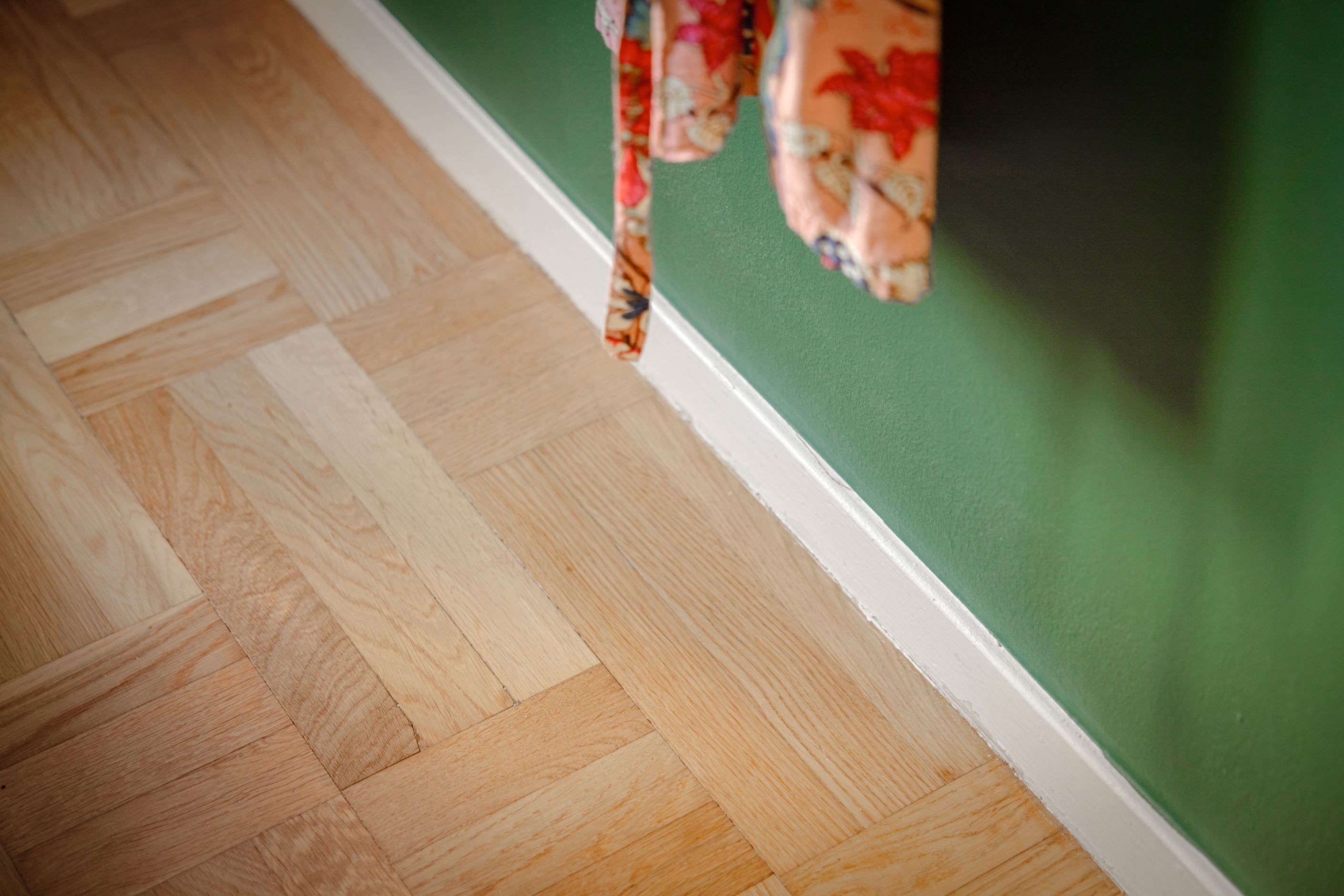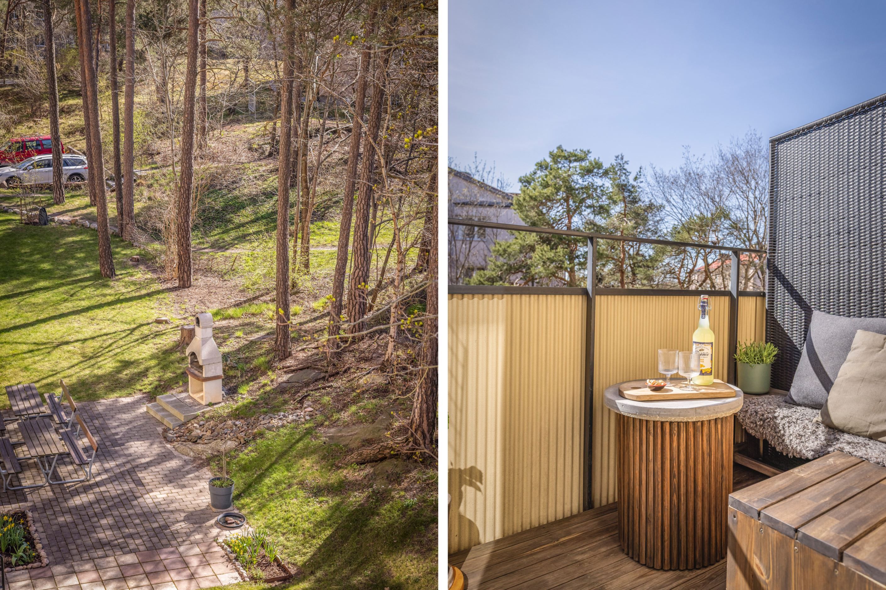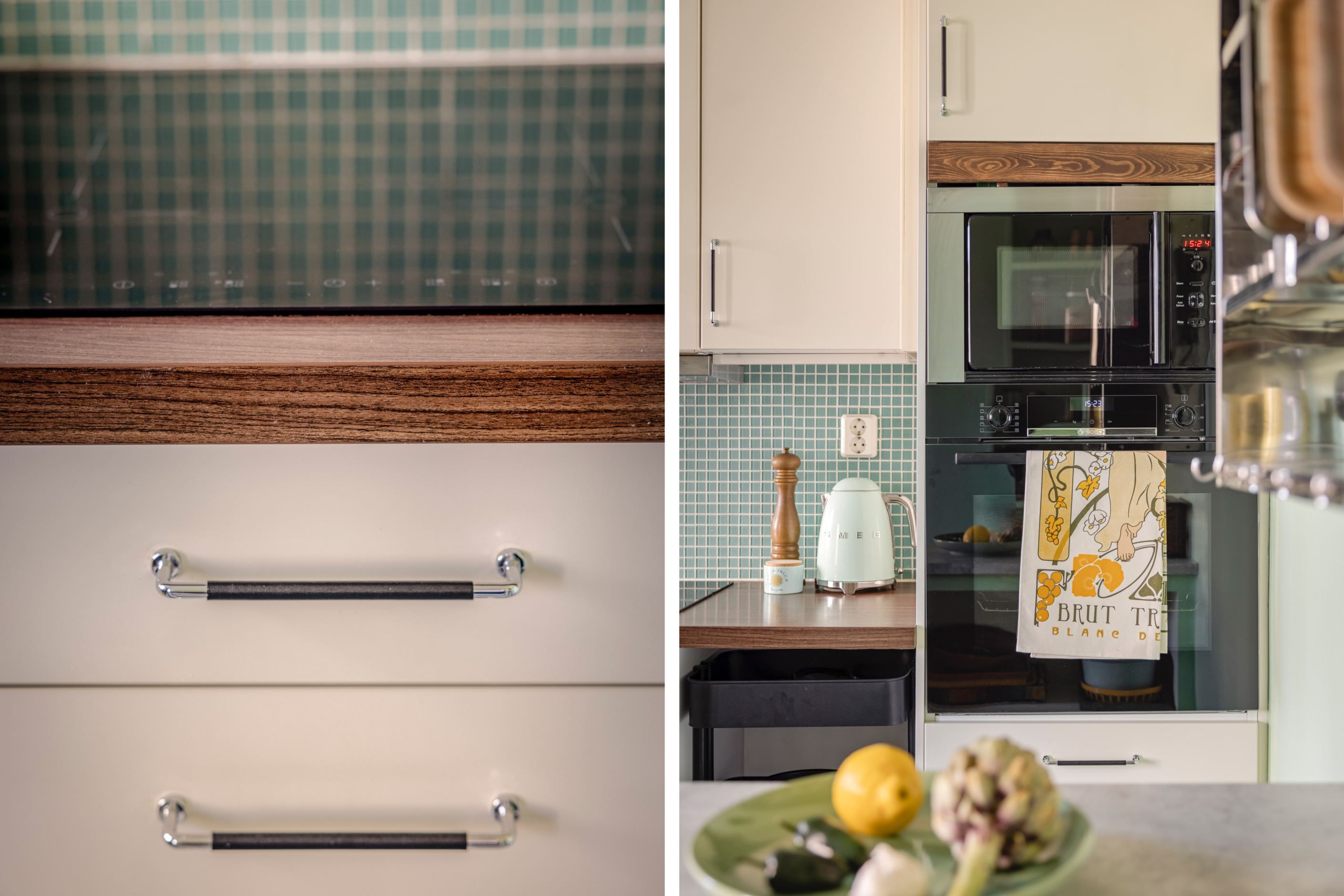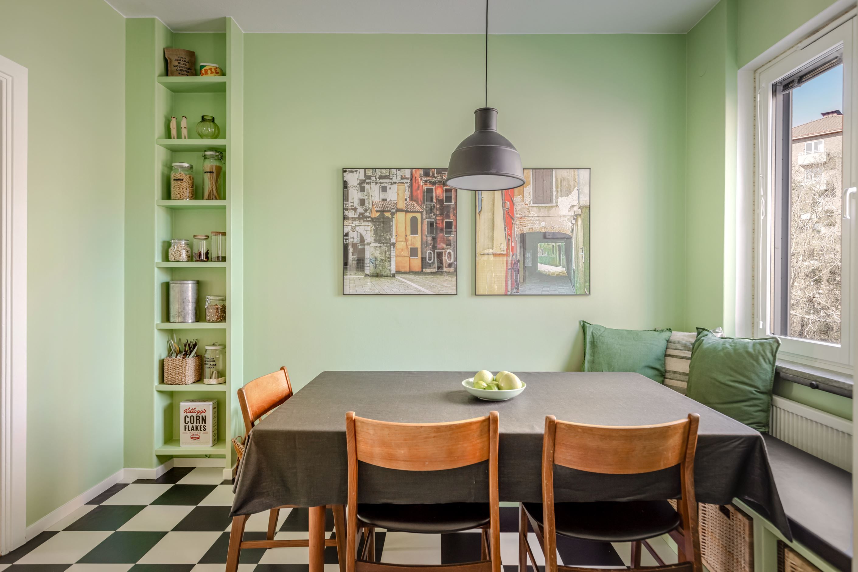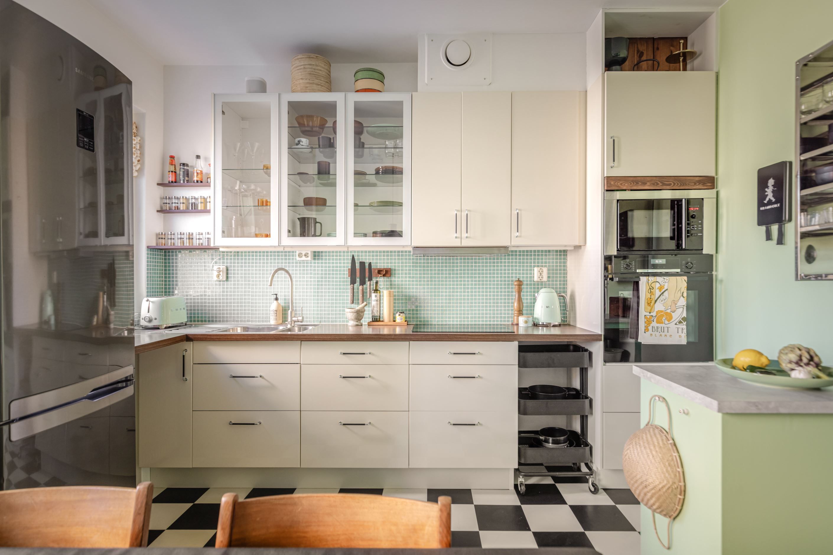 Vidare in i bostaden nås det fullt utrustade köket som är charmigt inrett med schackrutigt golv, ljusa över- och underskåp samt en generös arbetsyta i mörkare trä. Ovan arbetsytan sitter en glasmosaik i grönblå ton som ger köket karaktär. Intill köket ligger sovrummet som rymmer en dubbelsäng med sängbord samt ytterligare förvaring i form av inbyggda garderober.