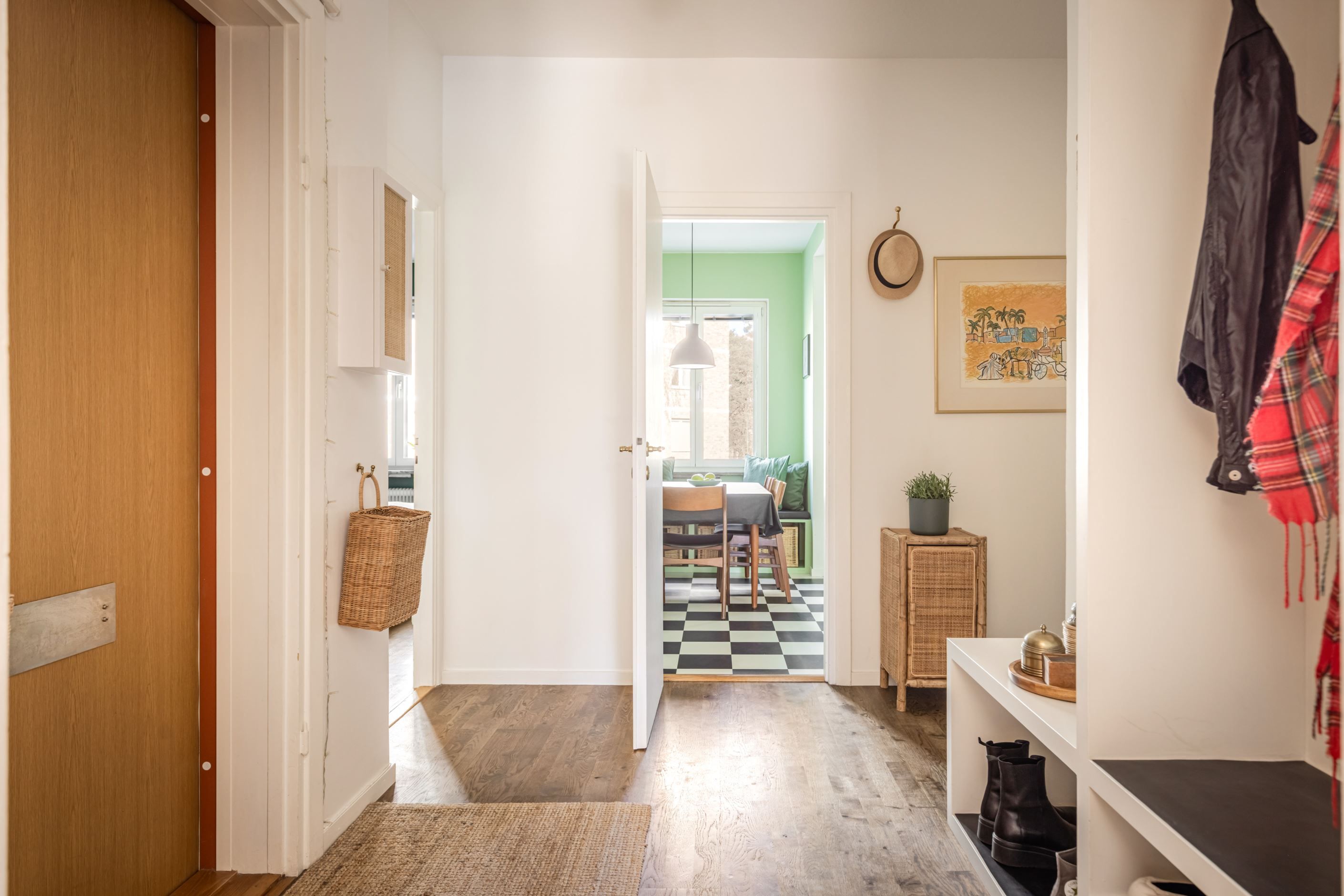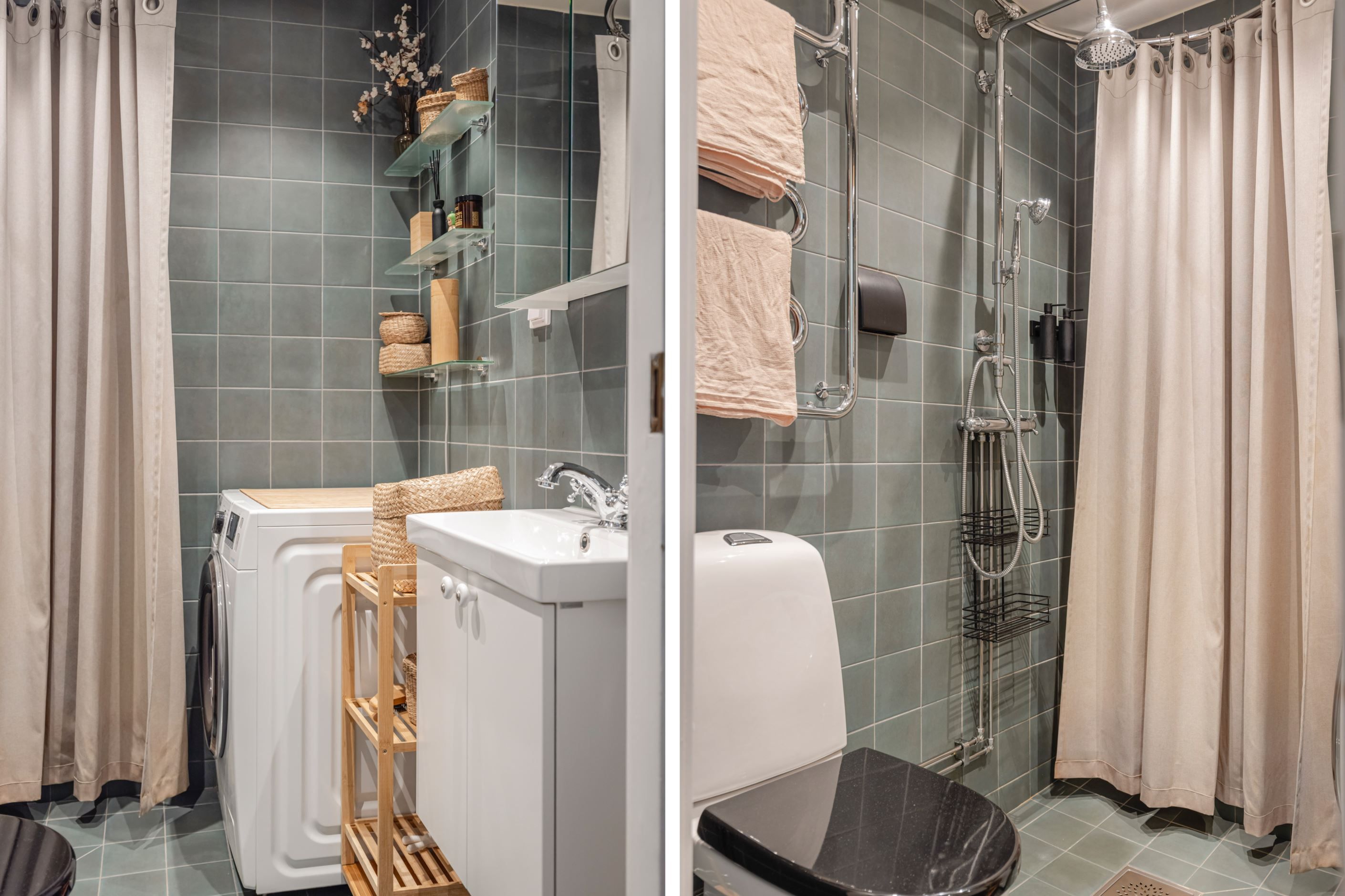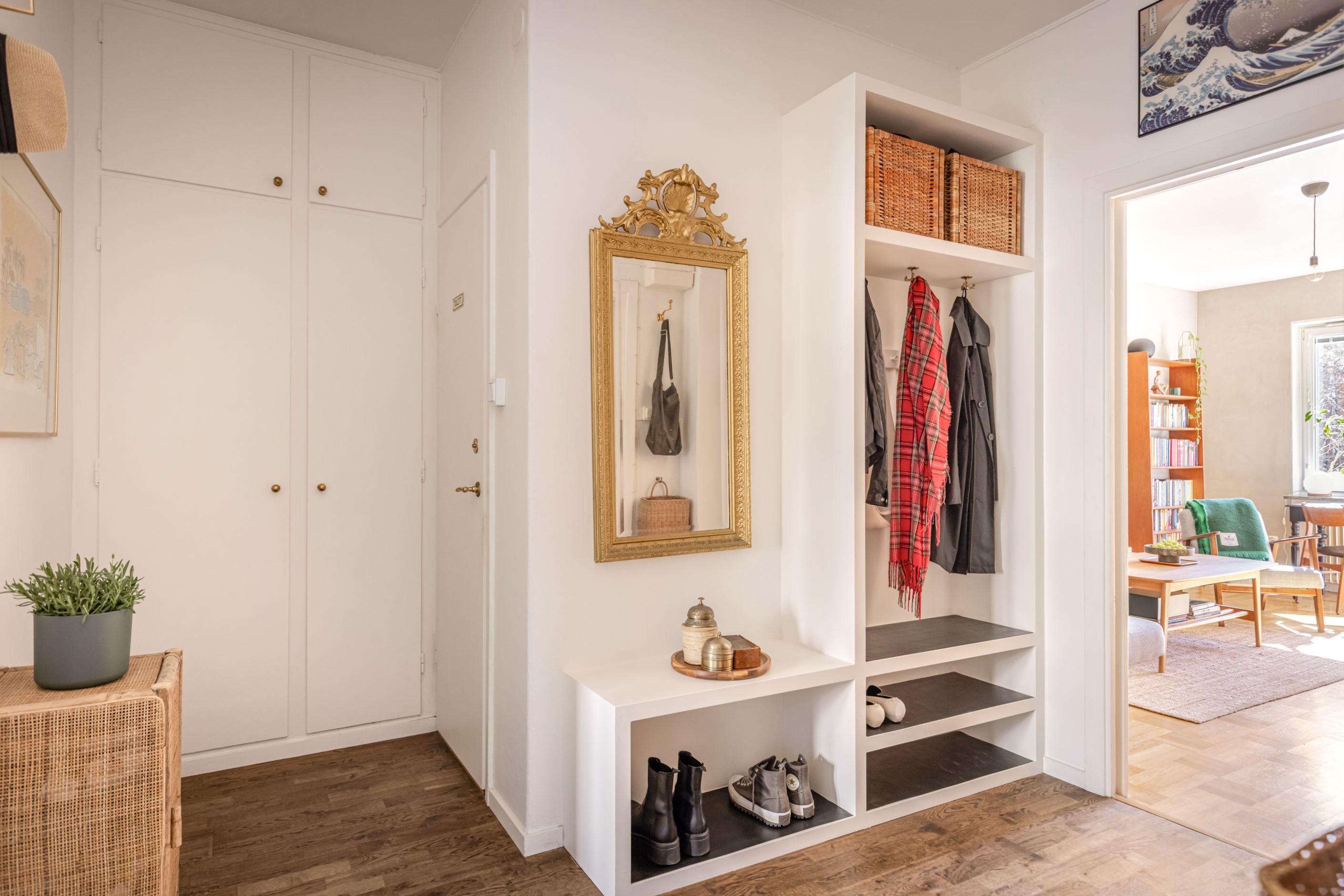 Redan i hallen möts du av goda avhängningsmöjligheter direkt när du kliver in samt garderober som ger plats för ytterligare förvaring. Från hallen nås badrummet som är utrustat med dusch, spegelskåp ovanför handfatet, tvättmaskin samt golvvärme.