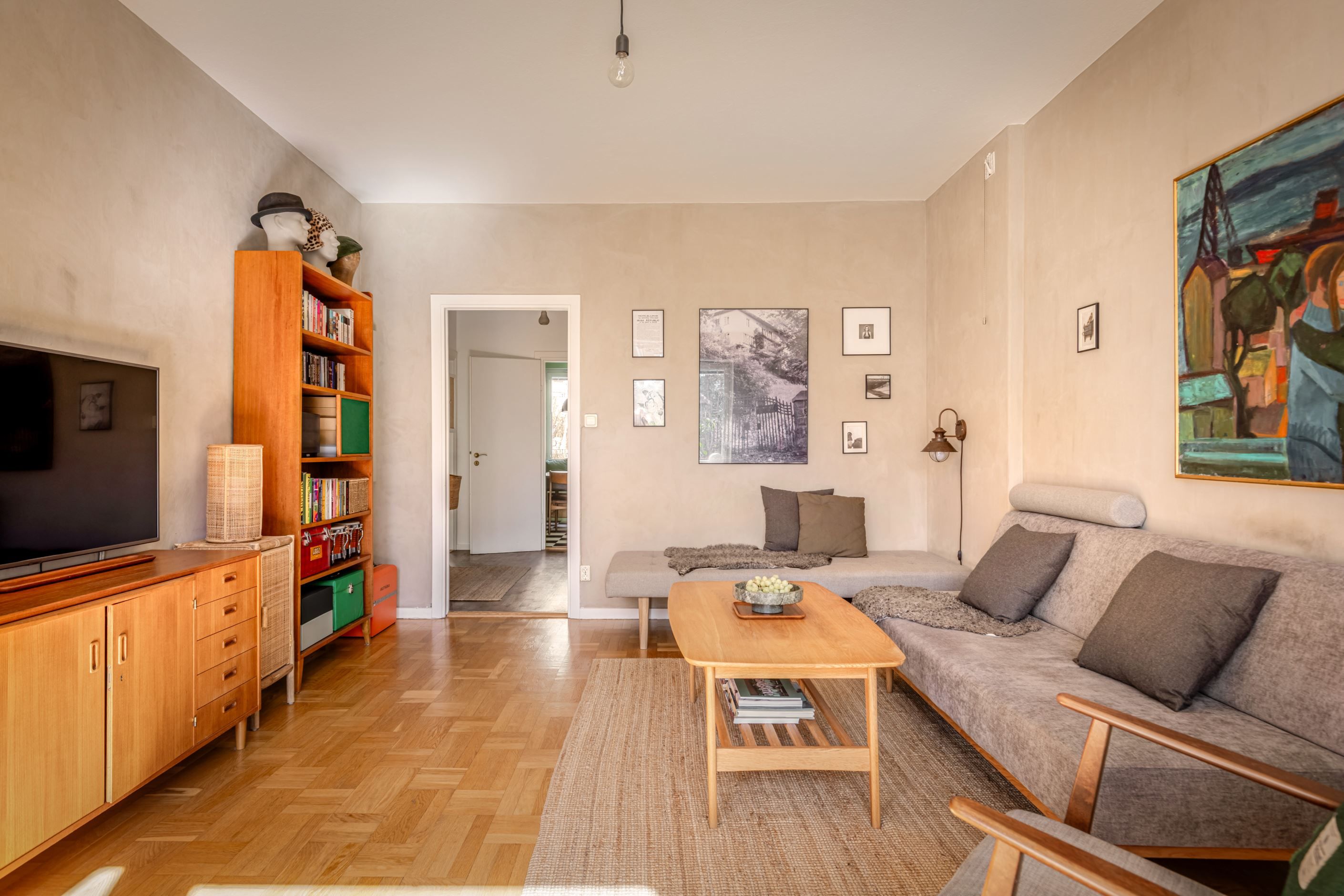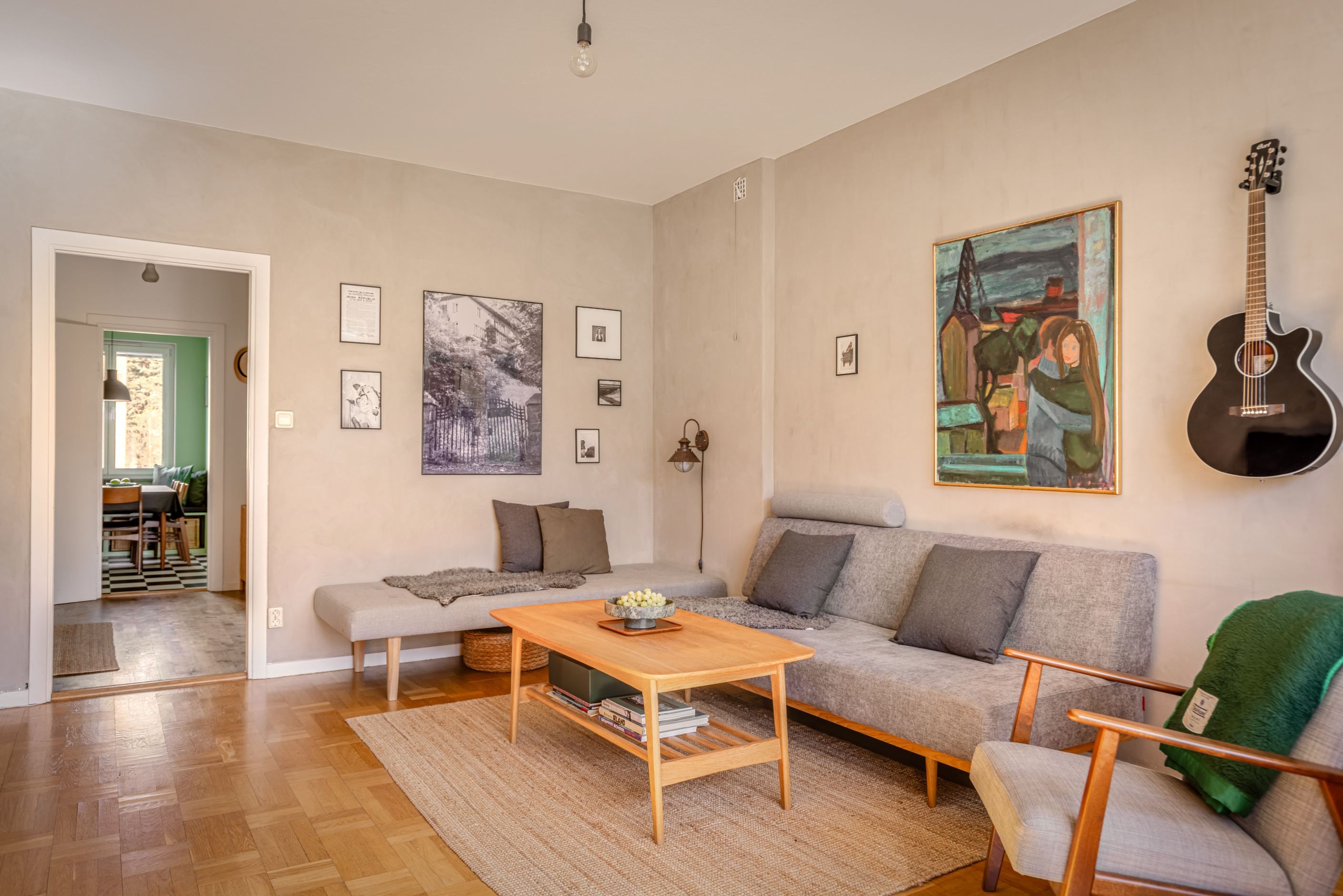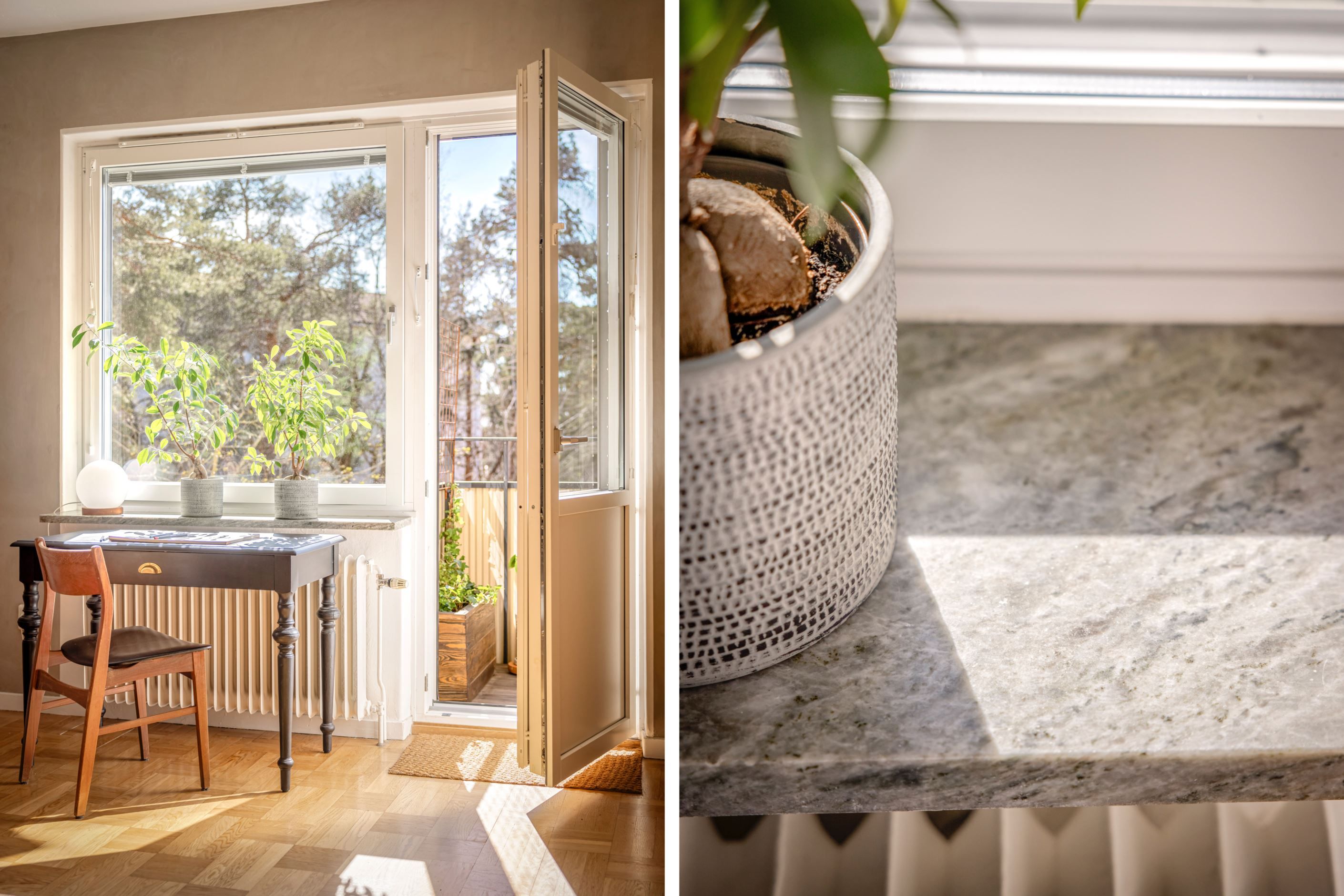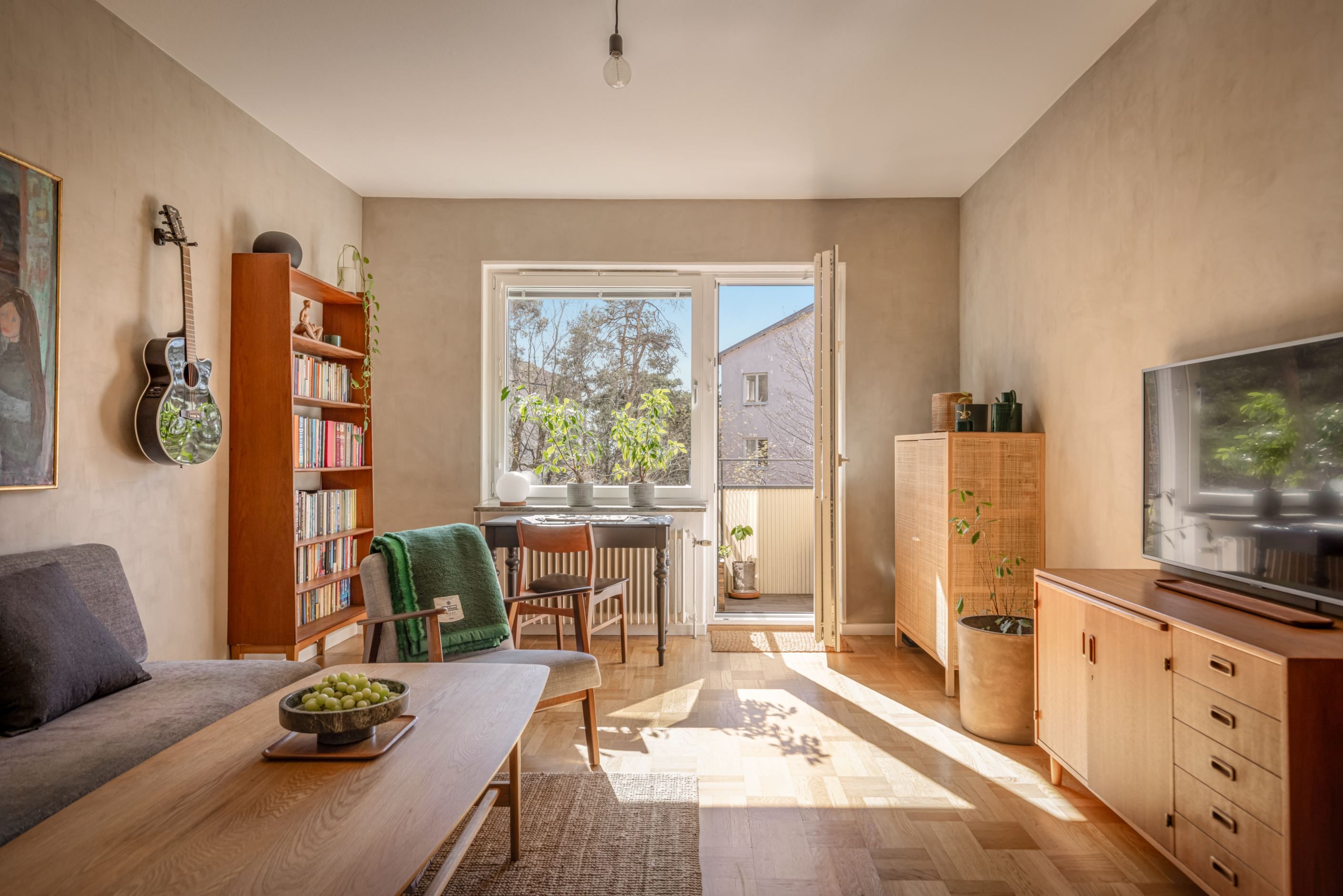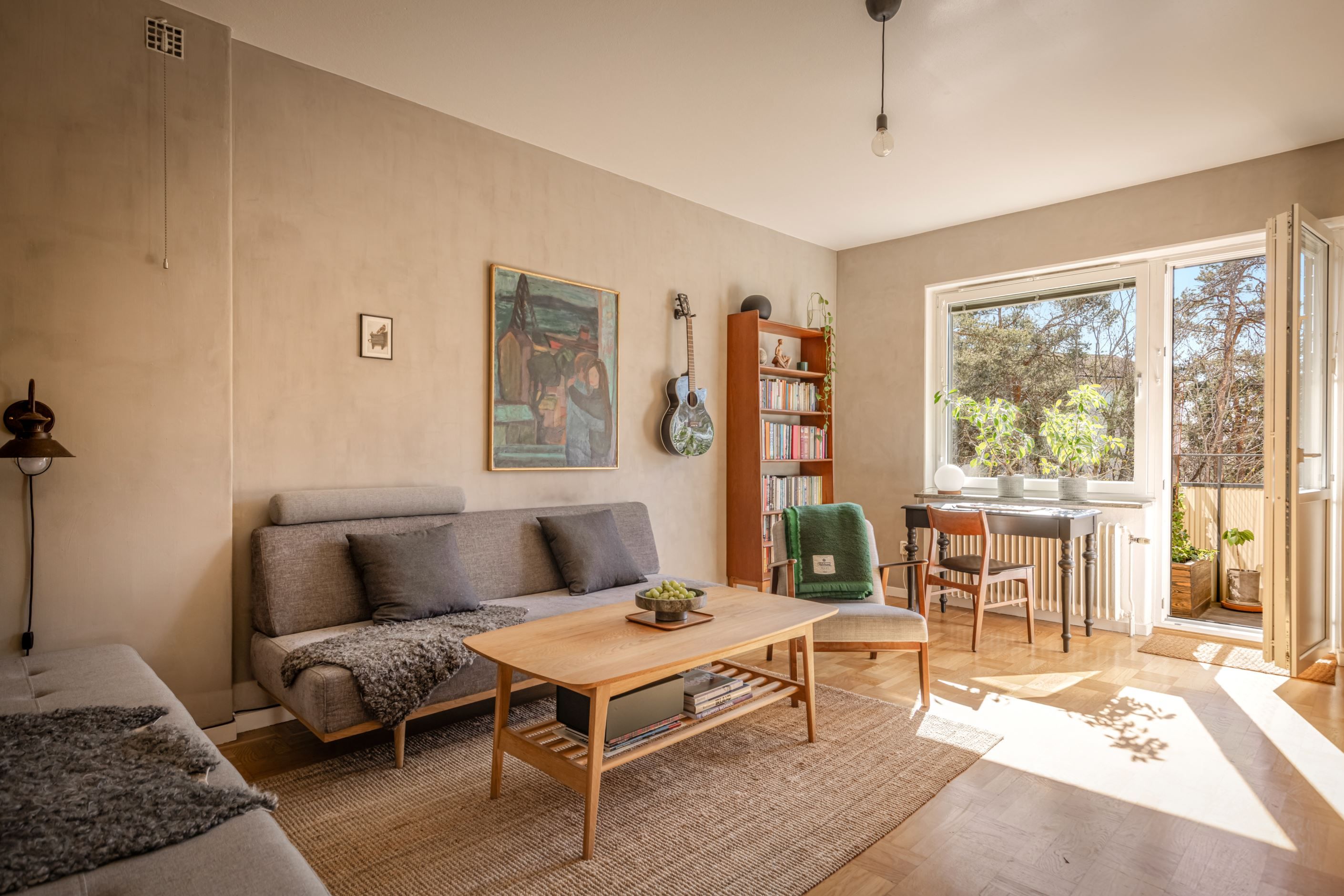 Vardagsrummet rymligt med kalkfärgade väggar och har plats för soffgrupp, mediamöbel och övrigt önskat möblemang. Härifrån nås även bostadens balkong i sydvästläge med utsikt över en grönskande bakgård.