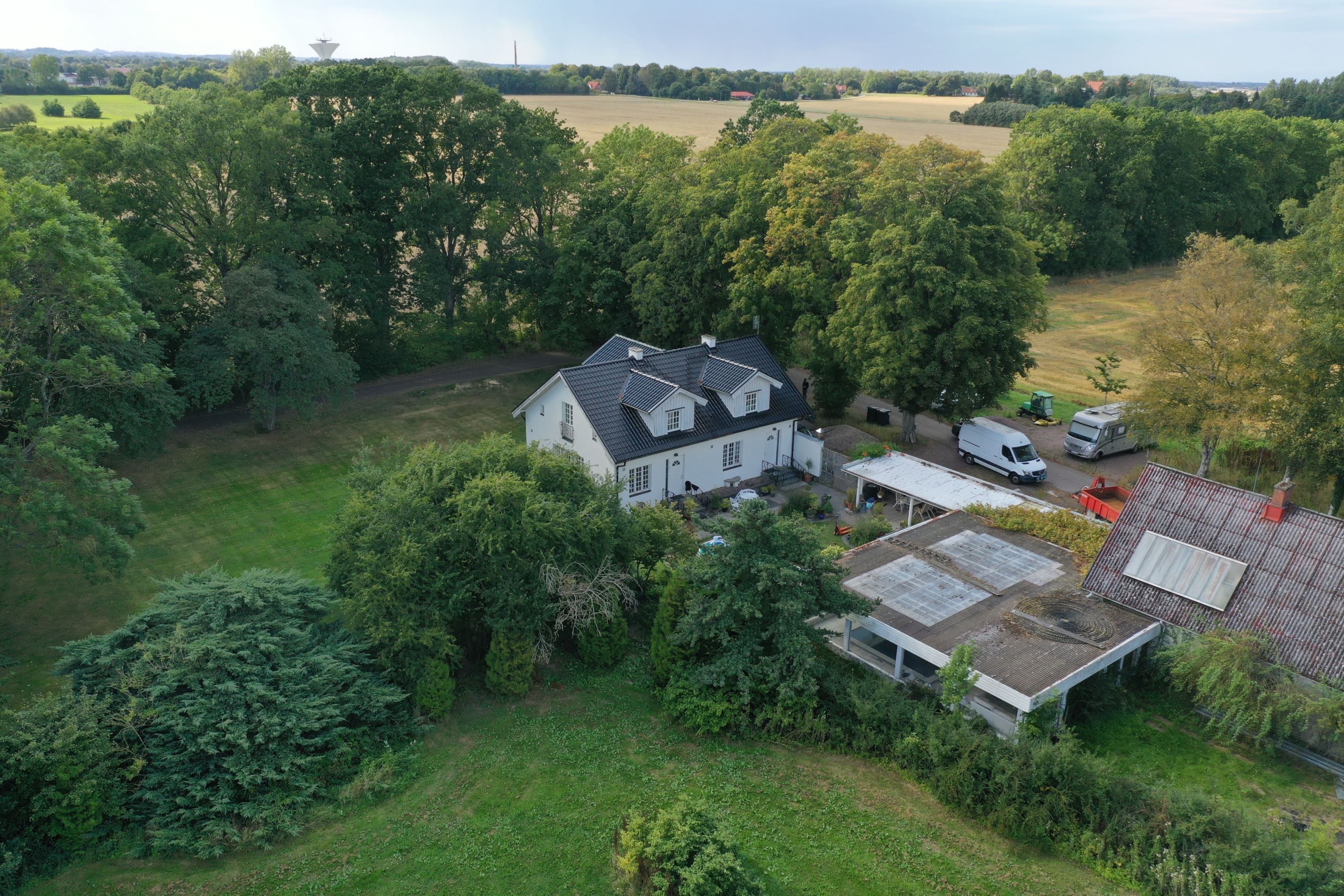 Omgivningen präglas av stillhet och fri utsikt över fälten, samtidigt som de stora träden kring huset ger insynsskydd och en känsla av lugn och avskildhet. Här bor man privat och lantligt, med alla möjligheter att njuta av naturen precis utanför dörren.