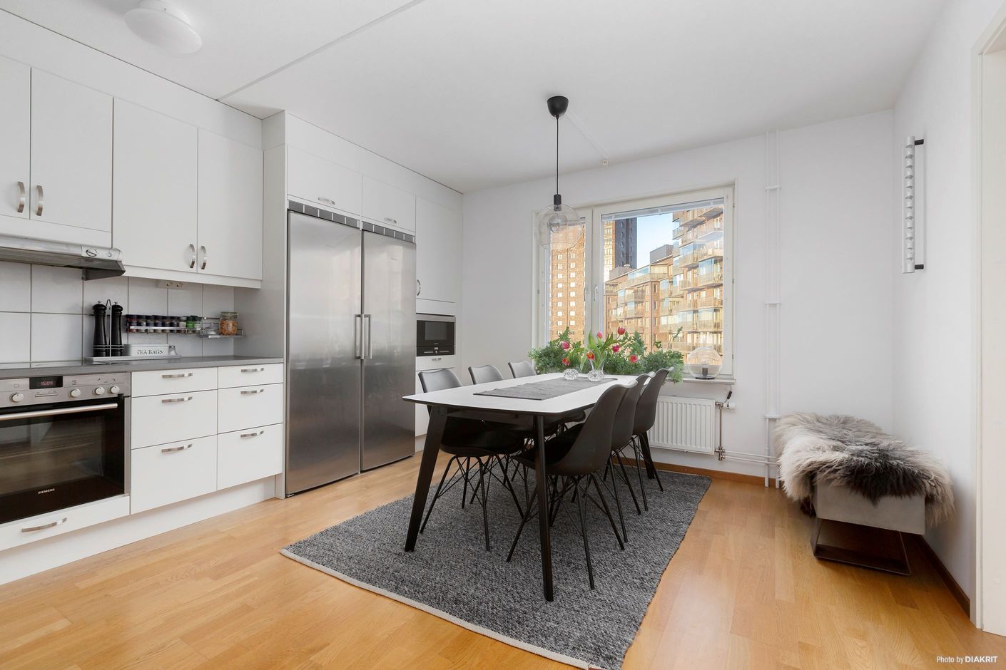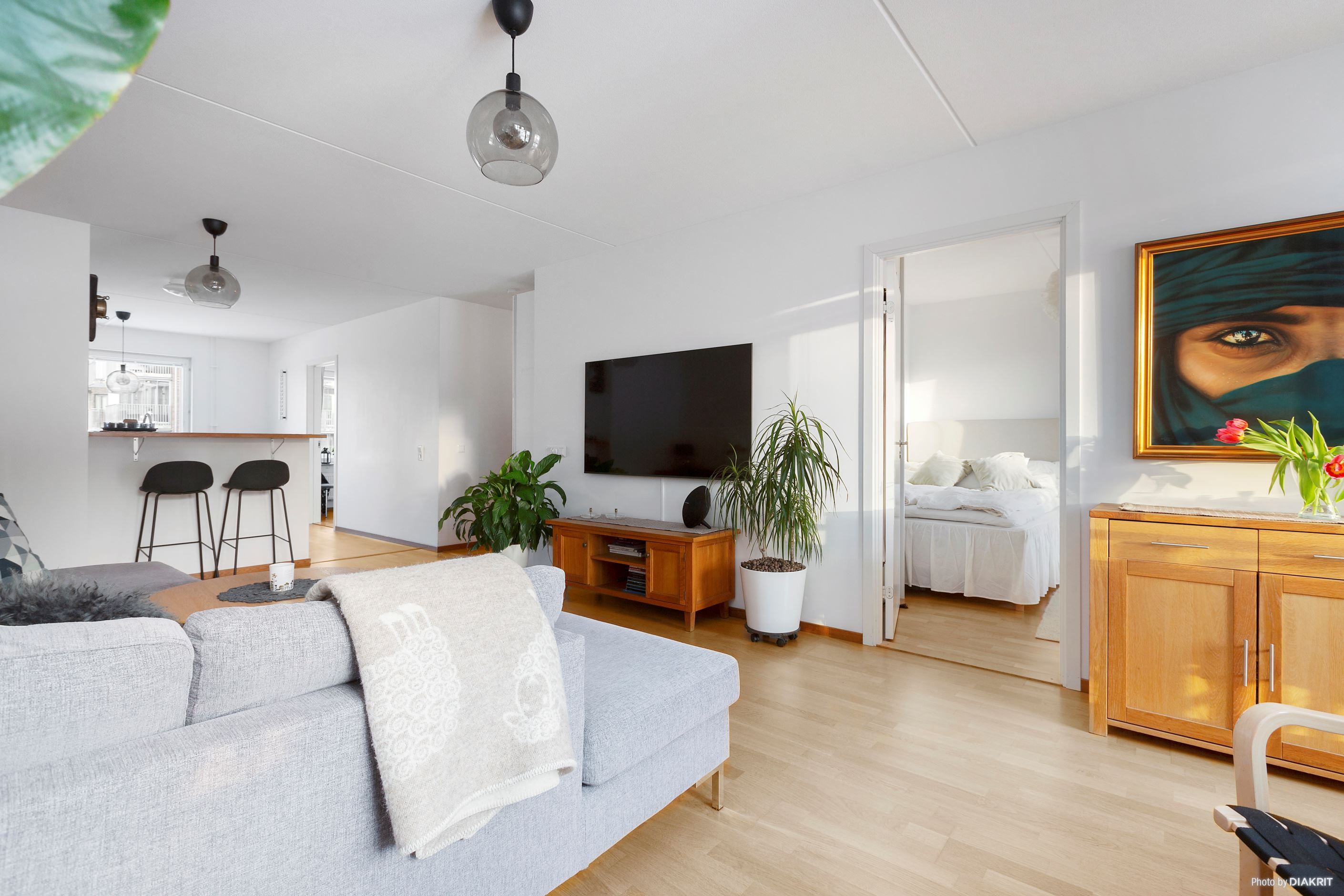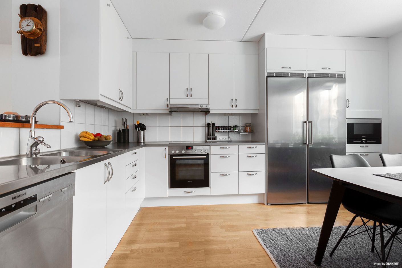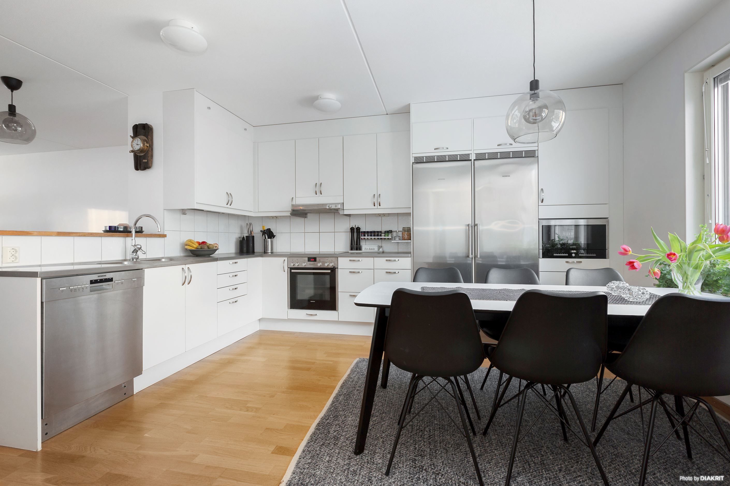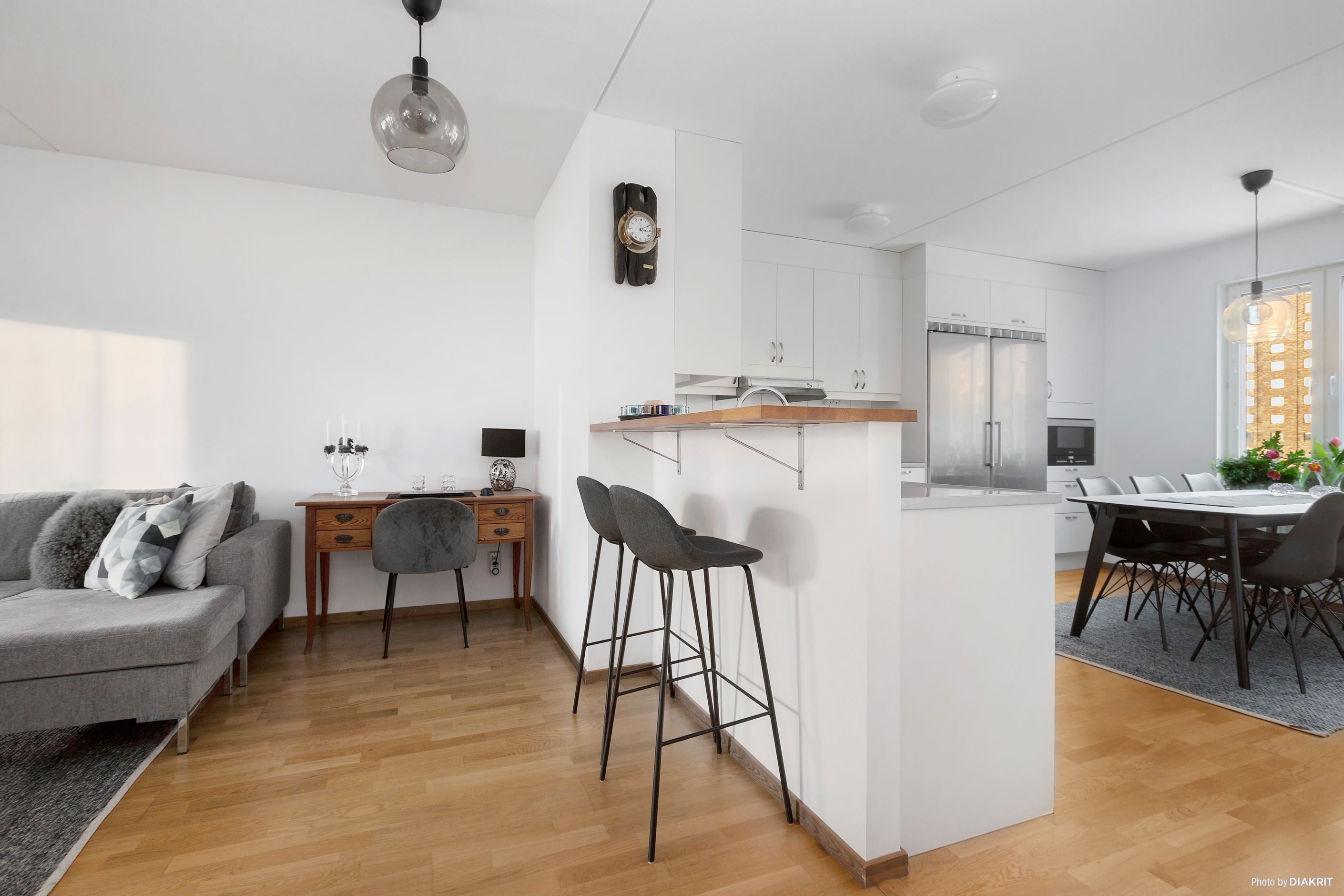 Ljust kök med matplats i öppen planlösning med vardagsrummet