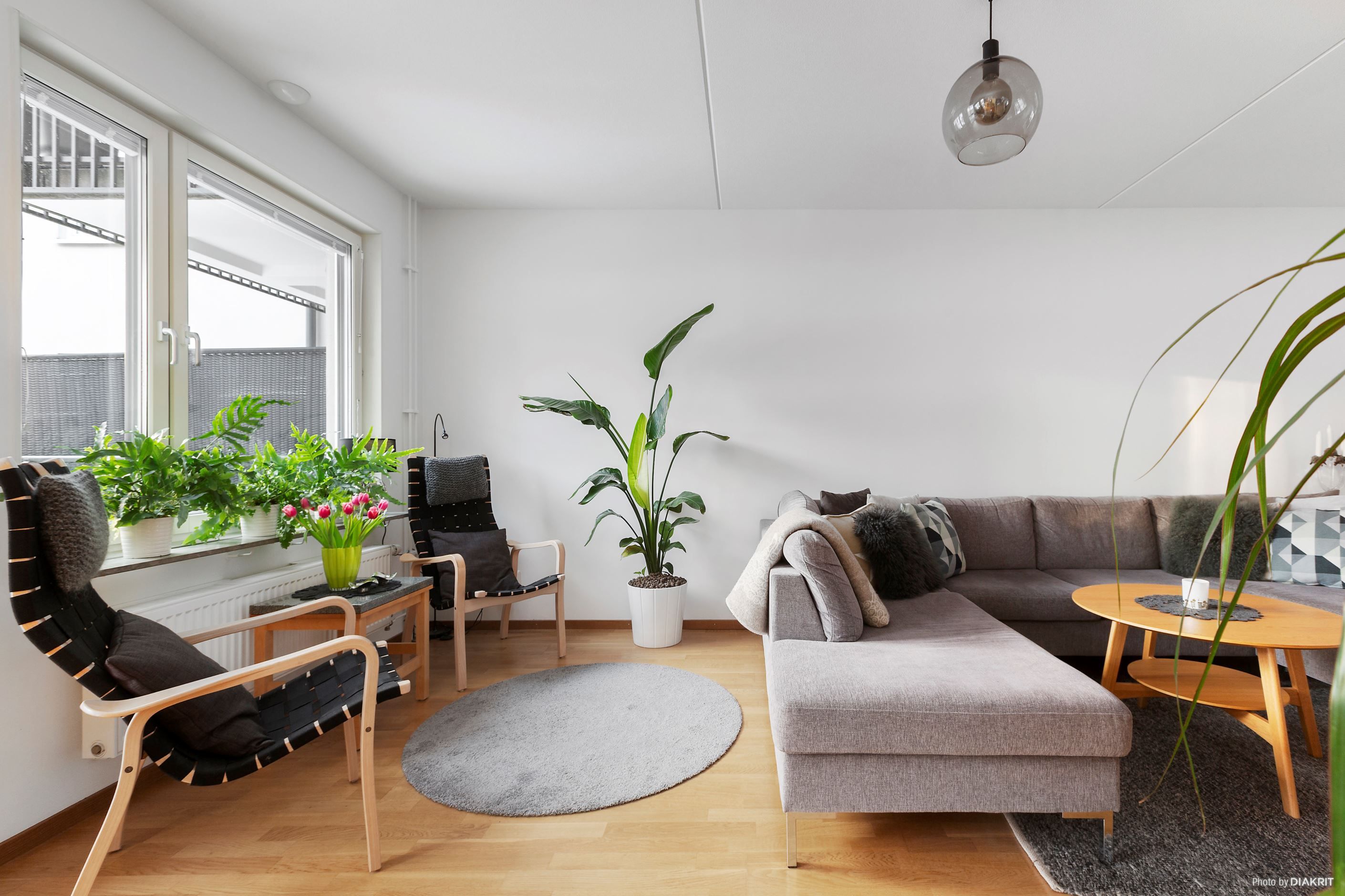 Rymligt vardagsrum med utgång till inglasad balkong