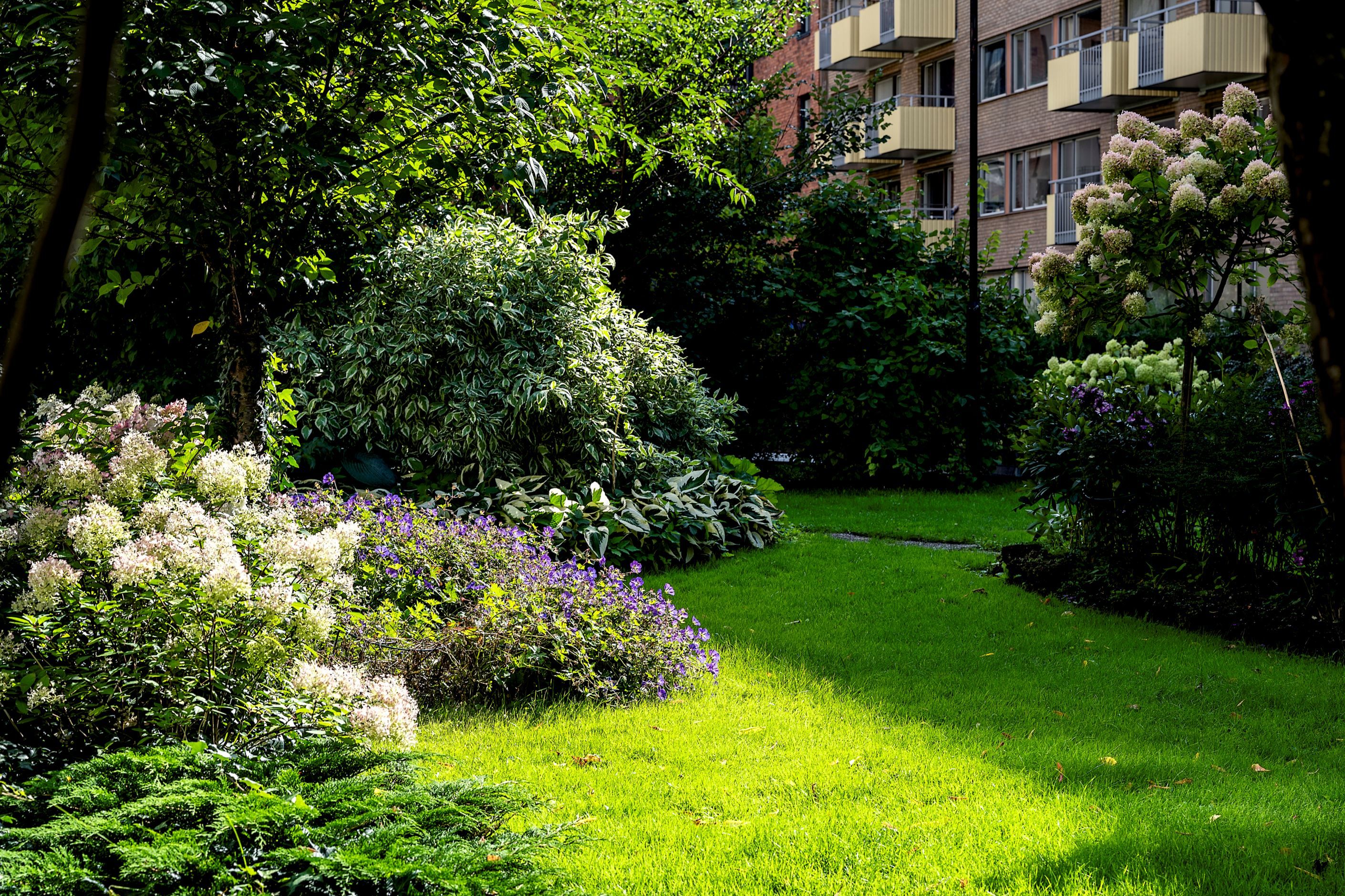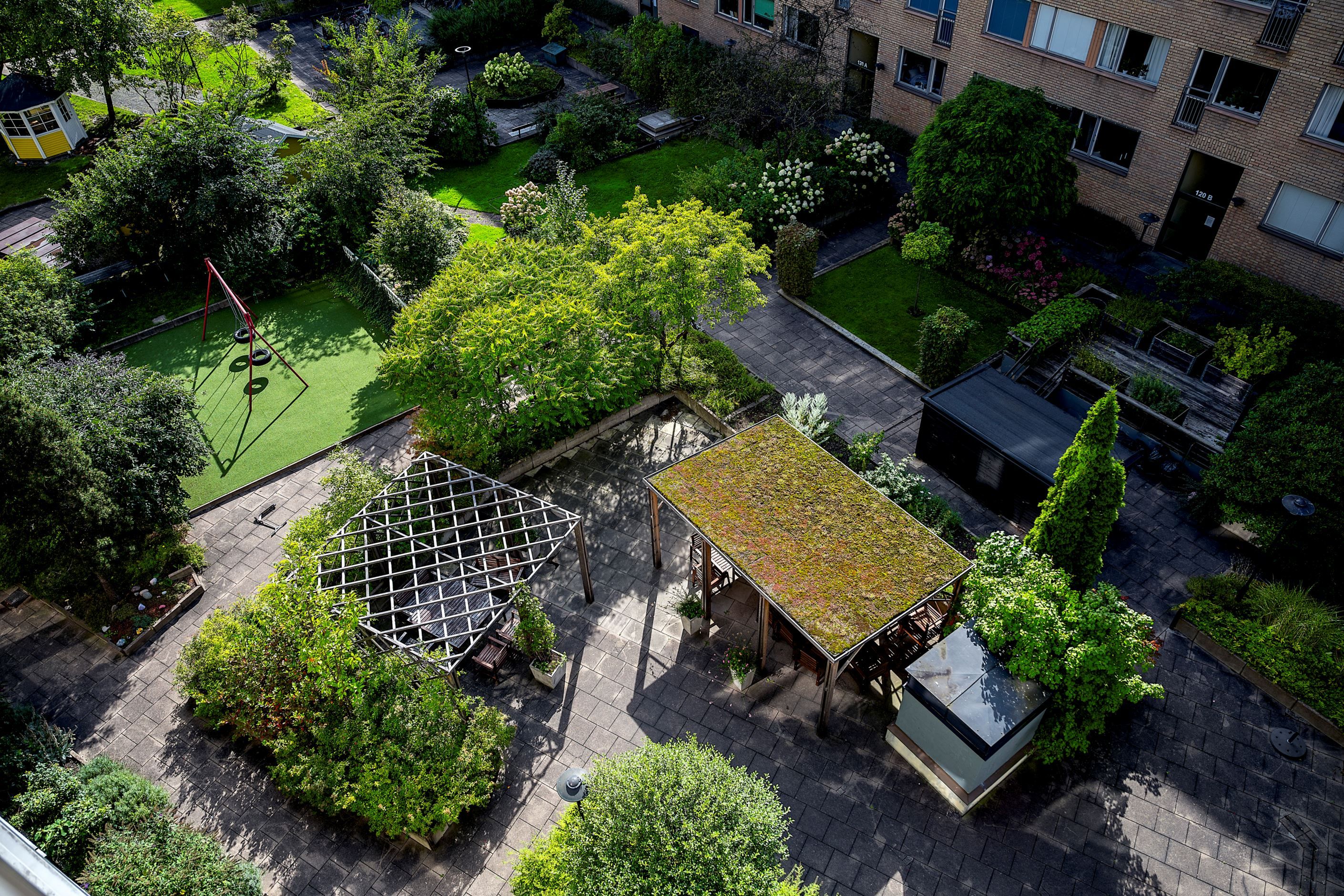 - Stor fin inhägnad innergård med flera sittgrupper.