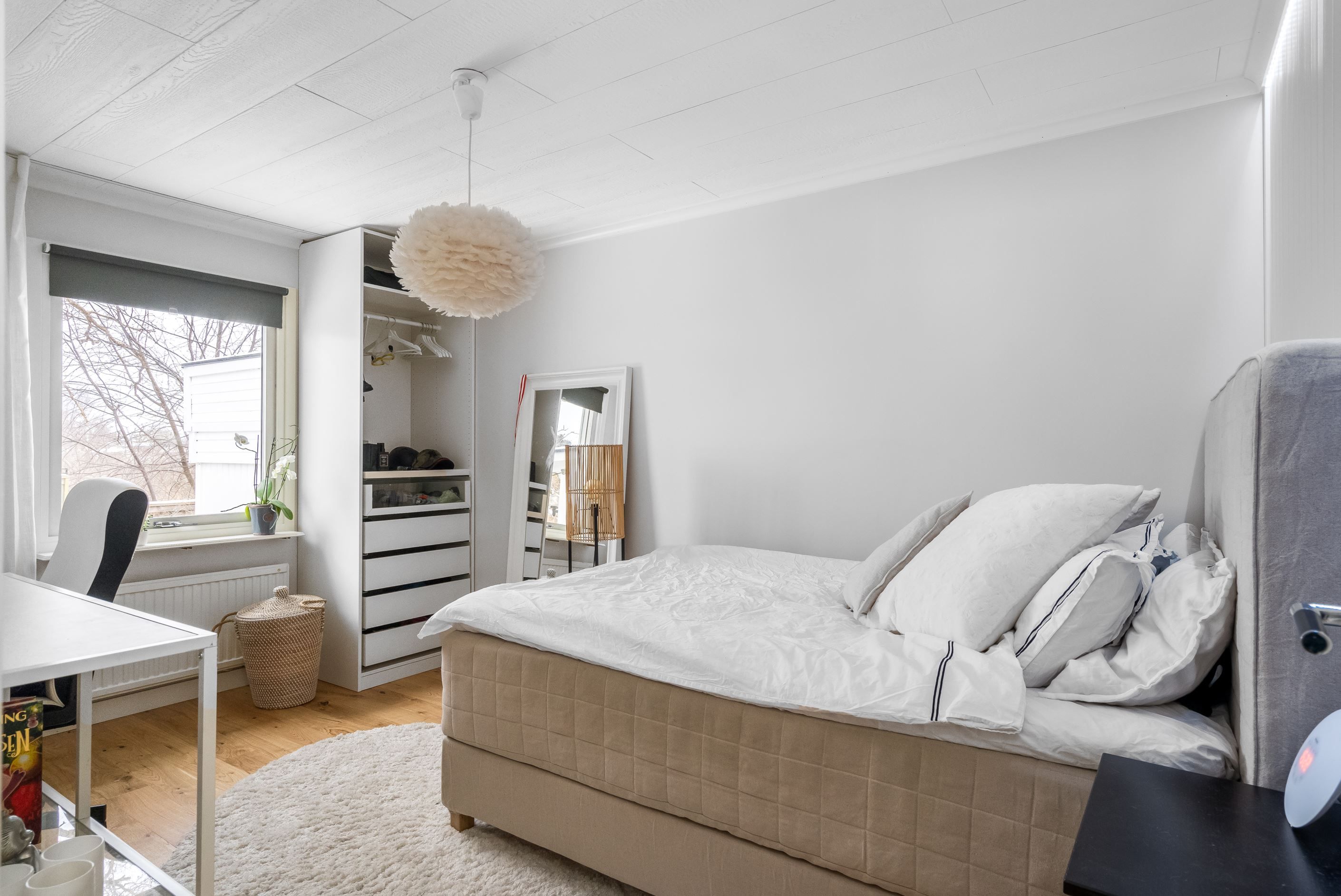 • Master Bedroom på övervåningen som erbjuder ro och avkoppling med vacker utsikt över trädgården.