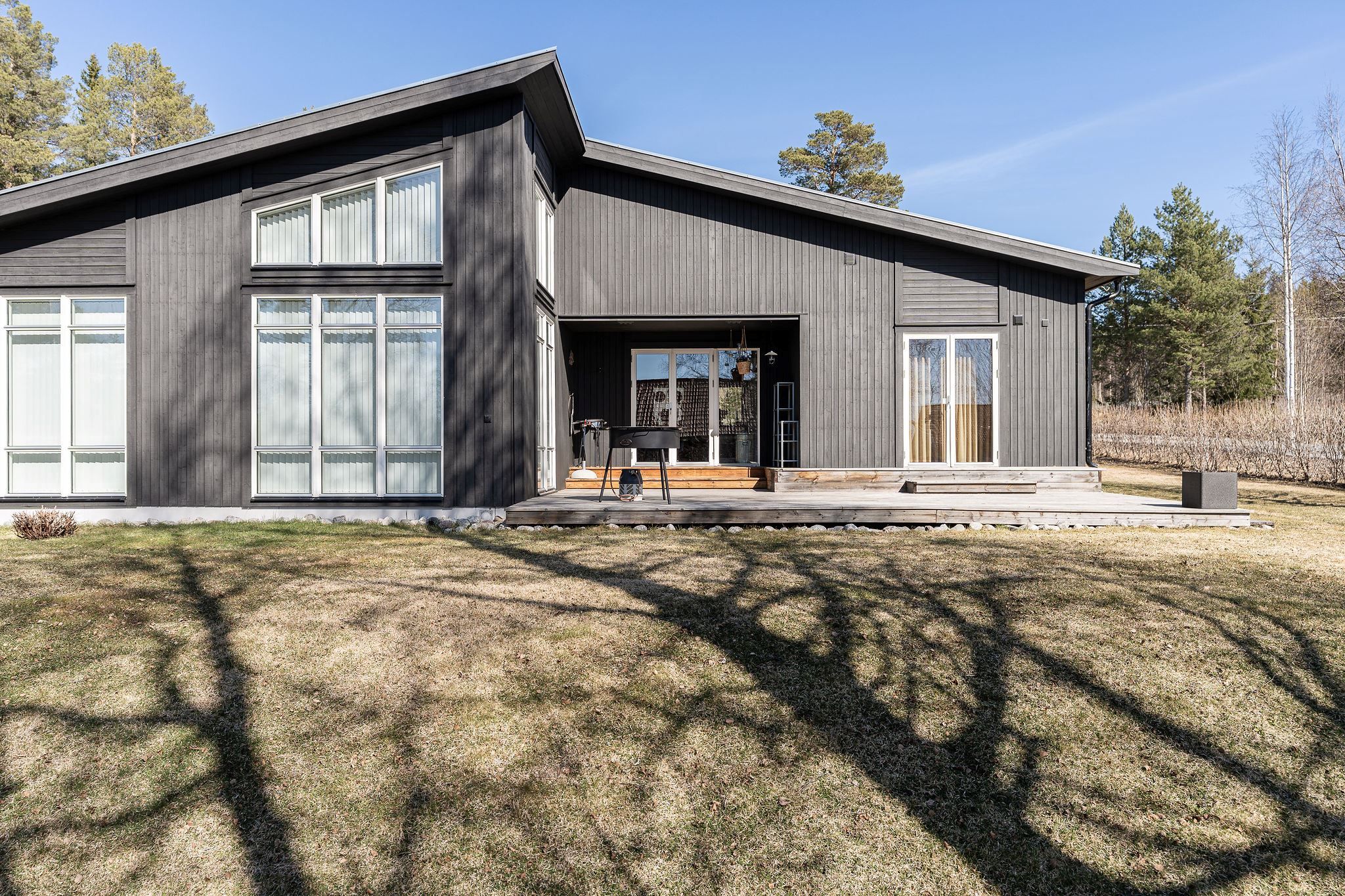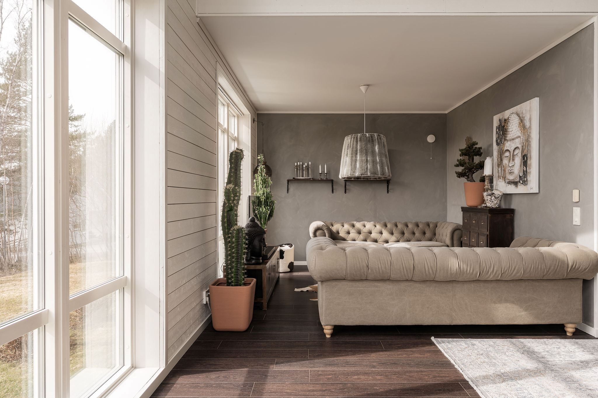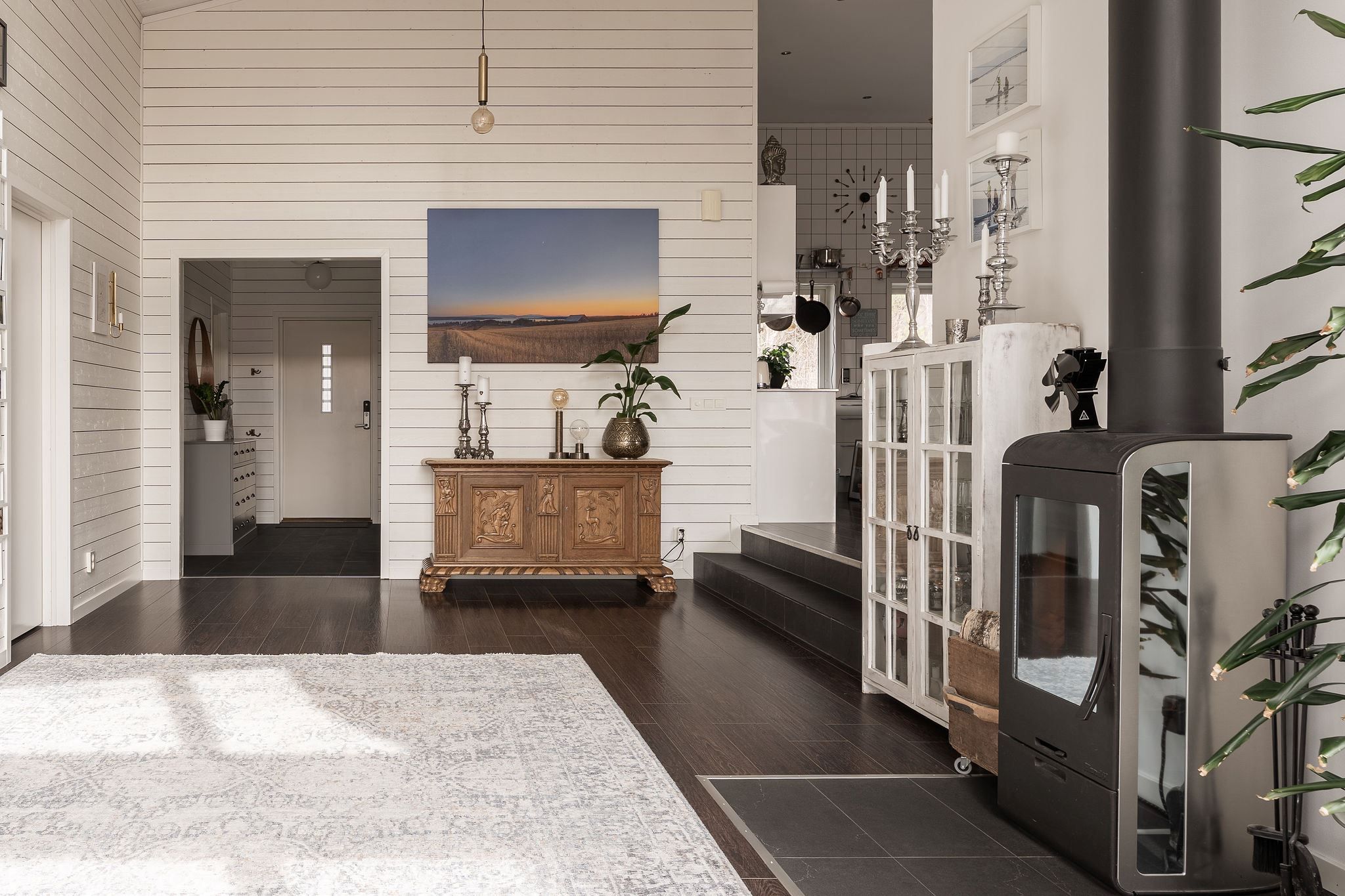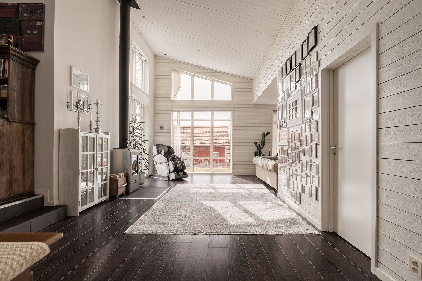 Det som verkligen lyfter huset är de imponerande fönsterpartierna som sträcker sig från golv upp till den generösa takhöjden och fyller rummet med ljus, rymd och en härlig känsla av exklusivitet. Som pricken över i:et finns även en kamin som bidrar till både värme och en ombonad, trivsam atmosfär.