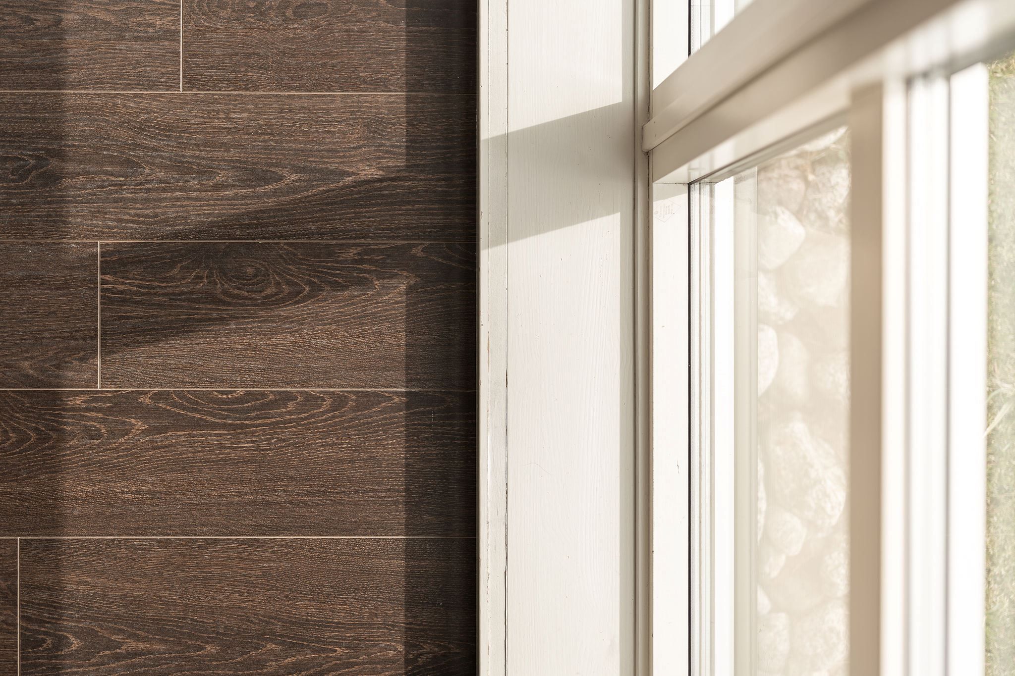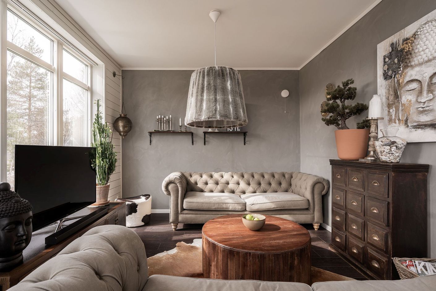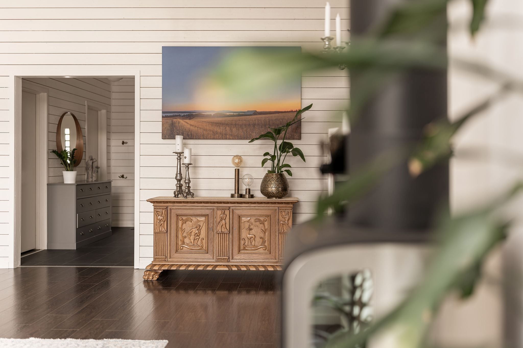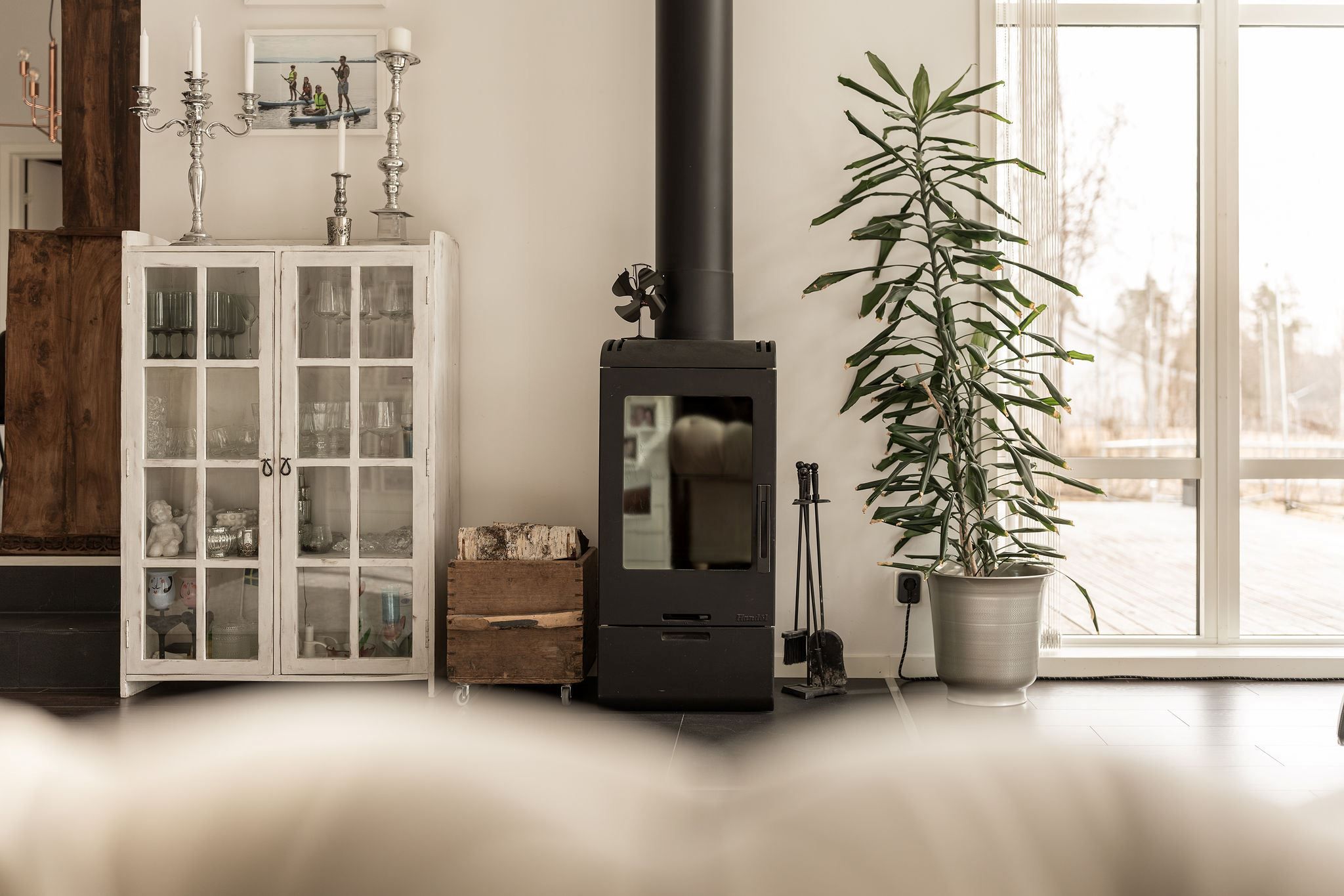 Det som verkligen lyfter huset är de imponerande fönsterpartierna som sträcker sig från golv upp till den generösa takhöjden och fyller rummet med ljus, rymd och en härlig känsla av exklusivitet. Som pricken över i:et finns även en kamin som bidrar till både värme och en ombonad, trivsam atmosfär.