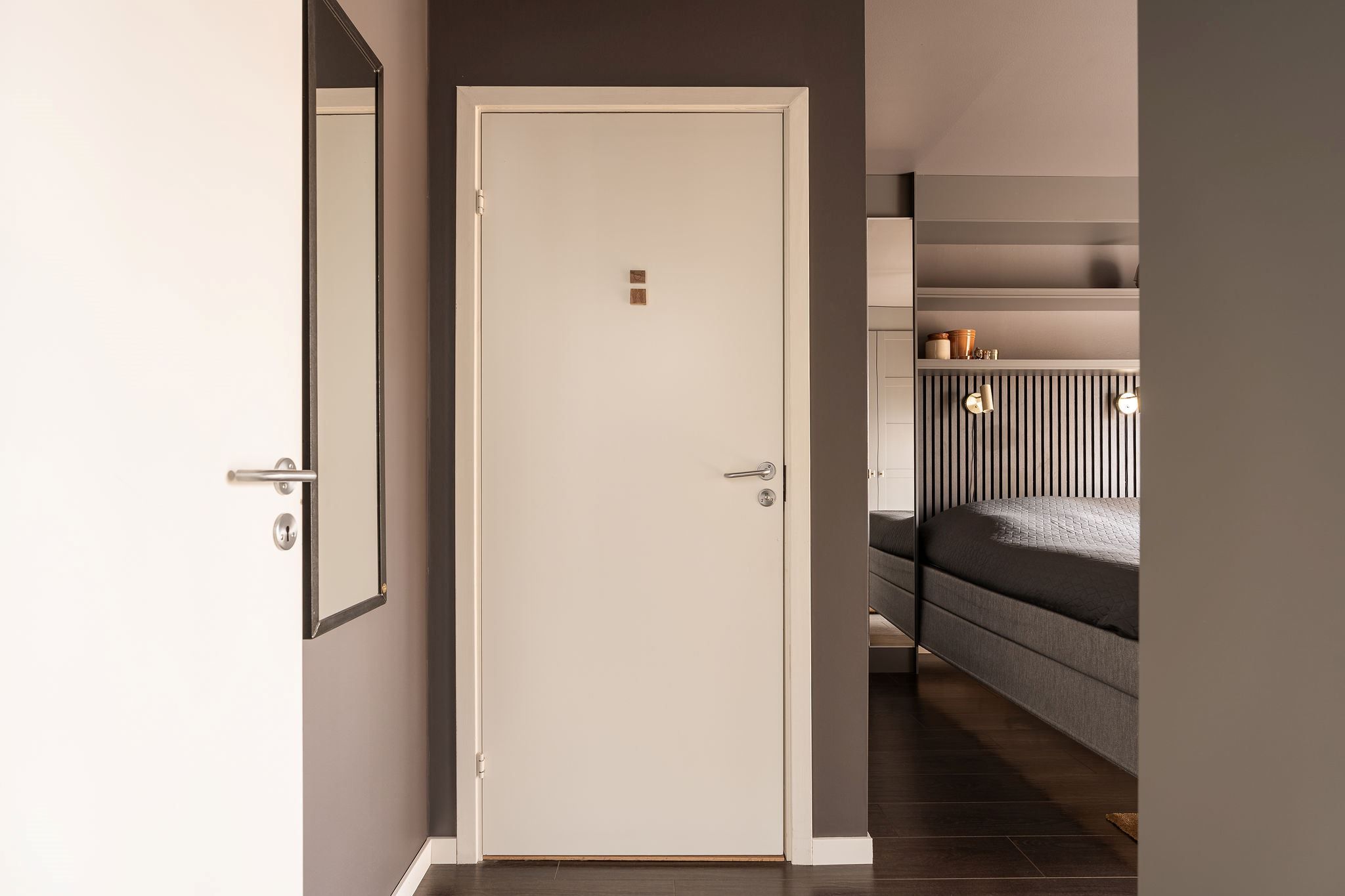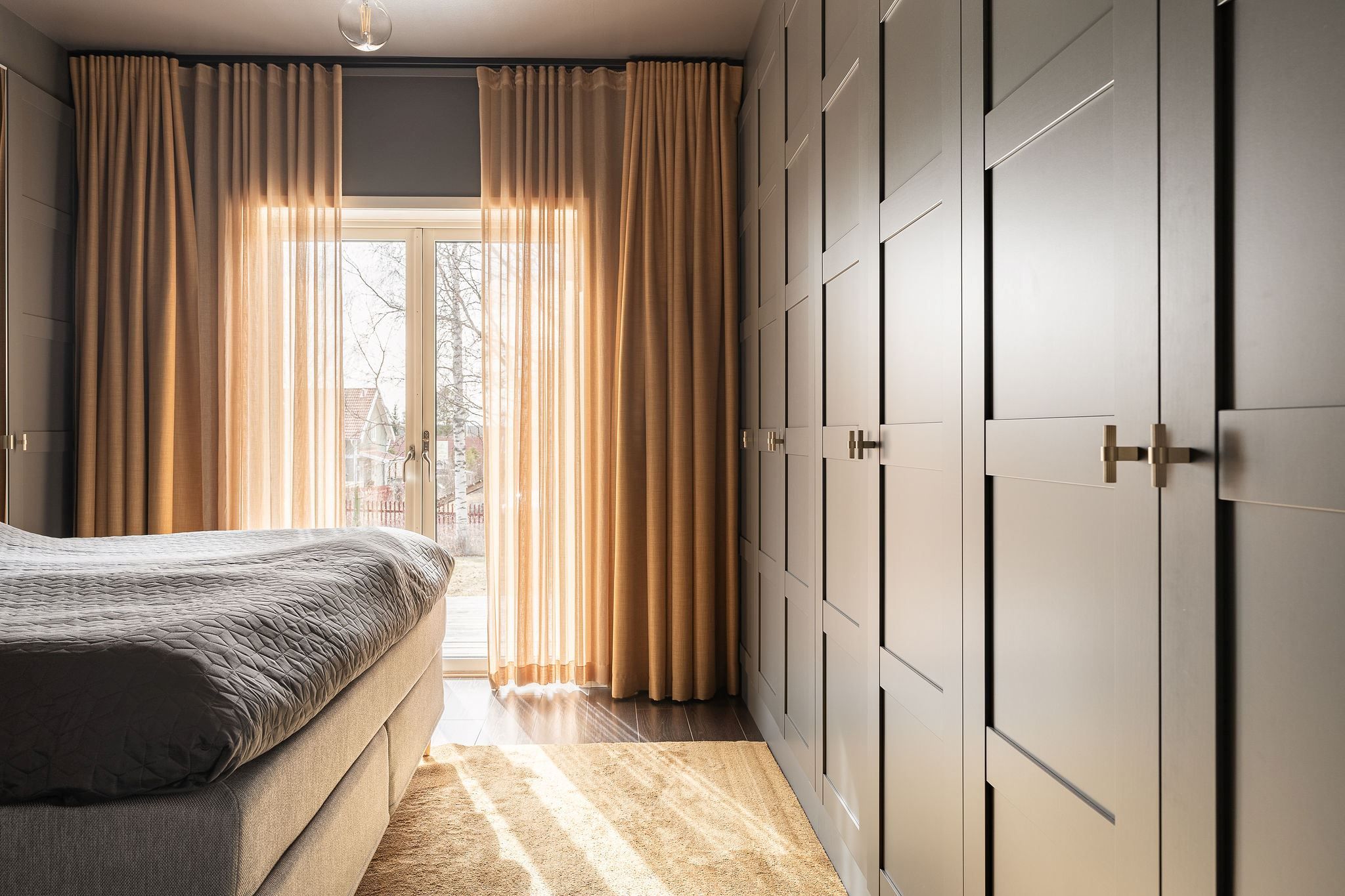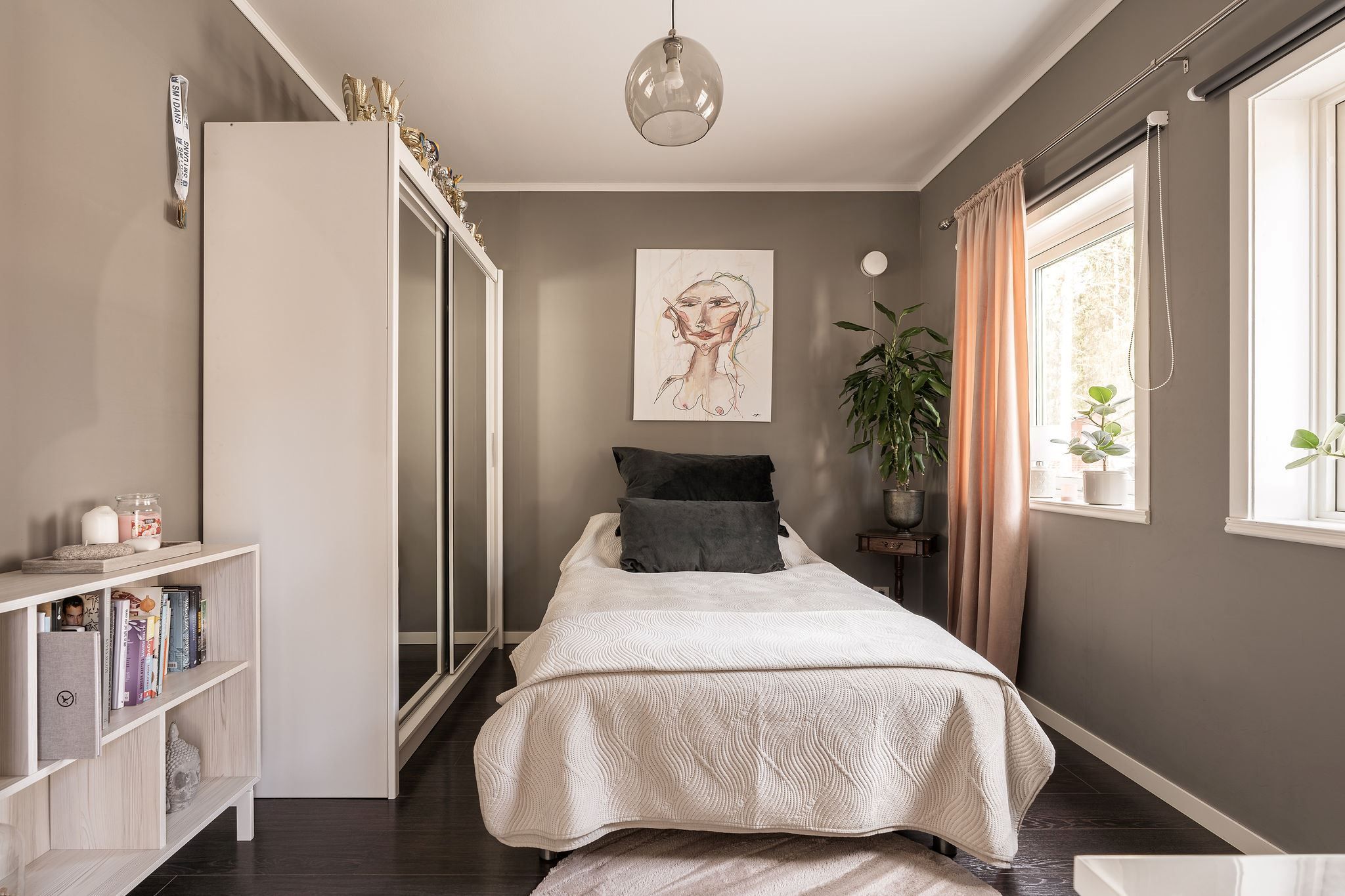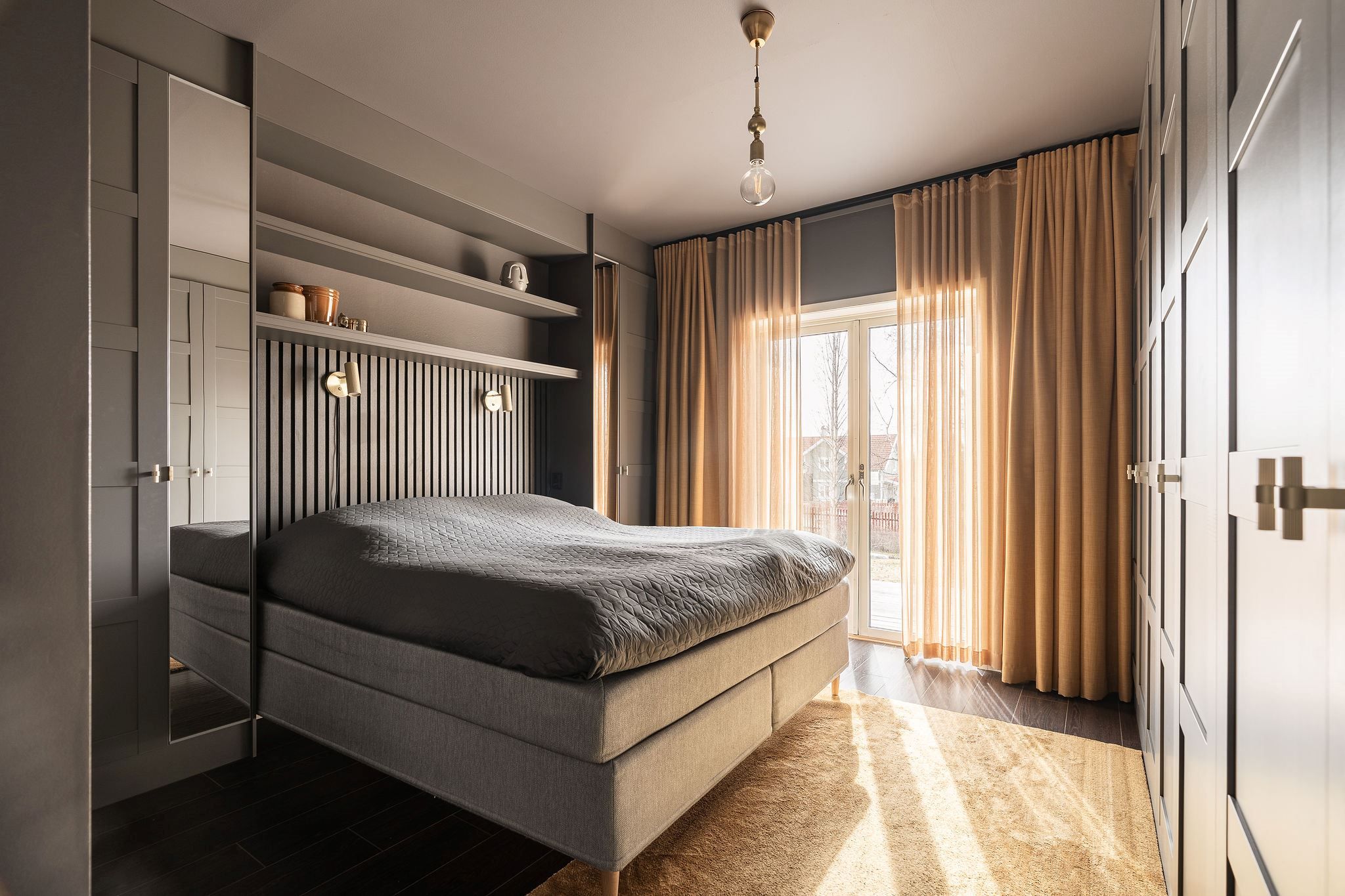 Master bedroom är en riktig privat oas med eget badrum, en hel garderobsvägg och direkt utgång till altanen på baksidan, perfekt för morgonkaffet i lugn och ro.