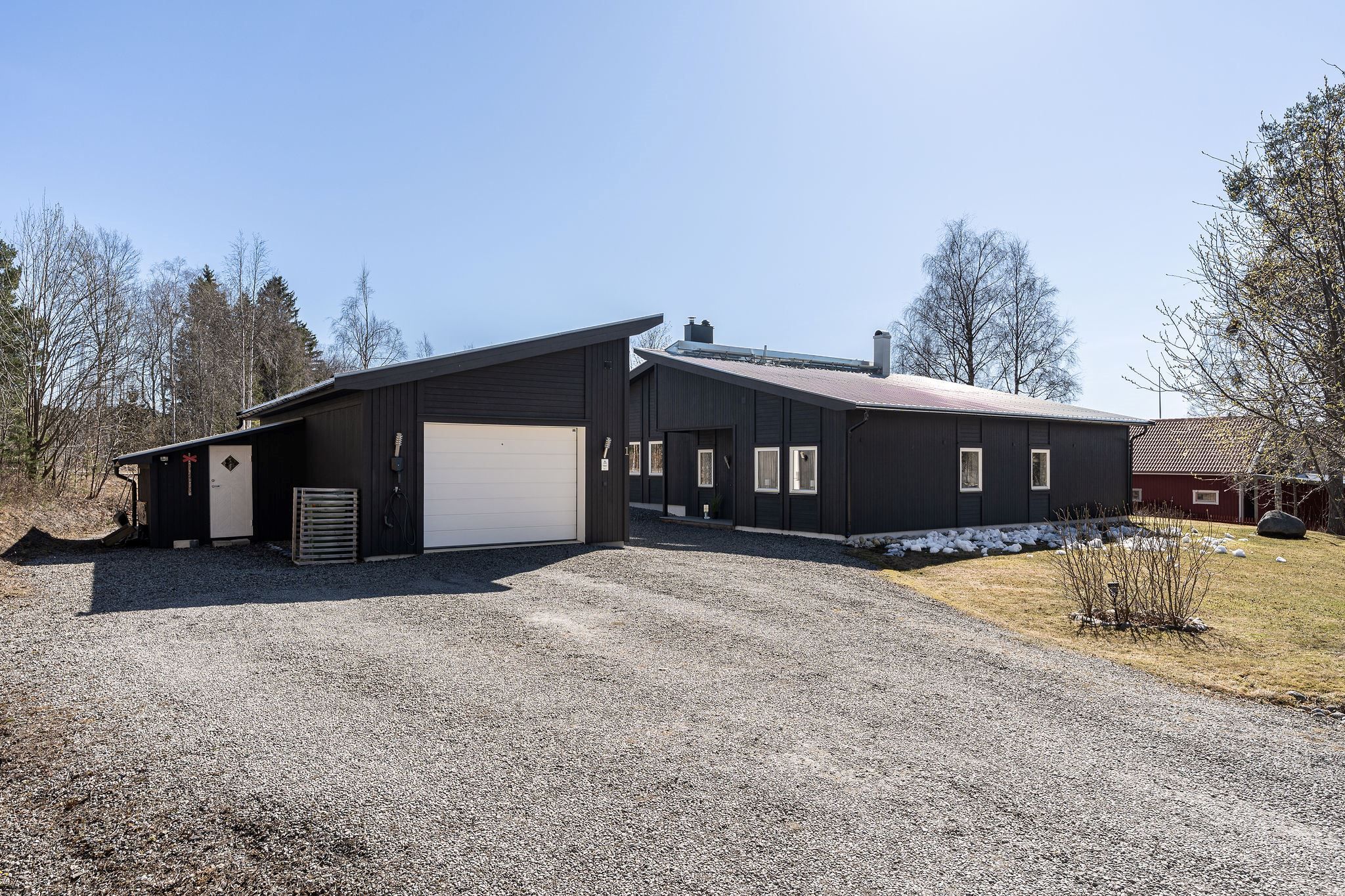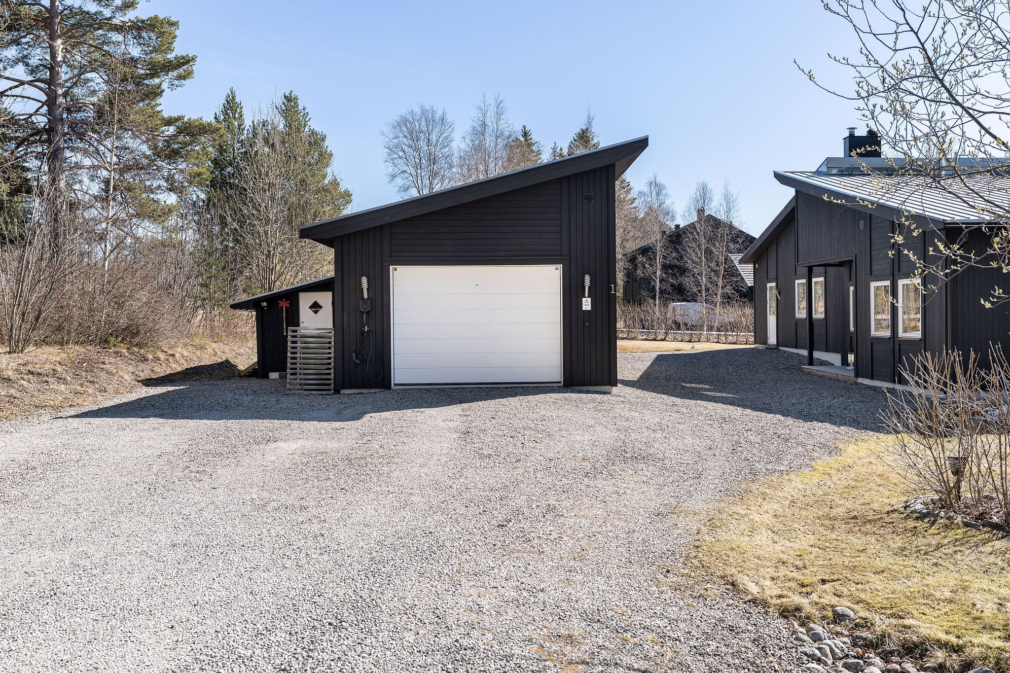Det fristående garaget om 50 kvm är utrustat med vatten, avlopp och laddbox för elbil.