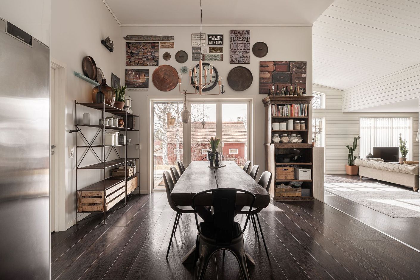 Intill köket breder en inbjudande matplats ut sig med gott om utrymme för ett större matbord, som gjort för långa, härliga middagar med familj och vänner. De stora skjutbara fönsterpartierna suddar ut gränsen mellan inne och ute och släpper in ett fantastiskt ljusflöde. Här öppnar du enkelt upp mot altanen och låter sällskapet flytta ut när vädret tillåter, en riktig höjdpunkt för både vardag och fest.
